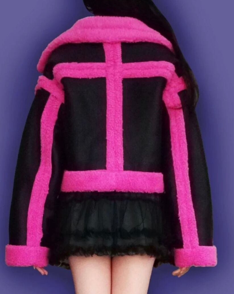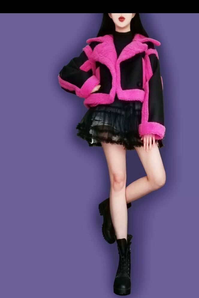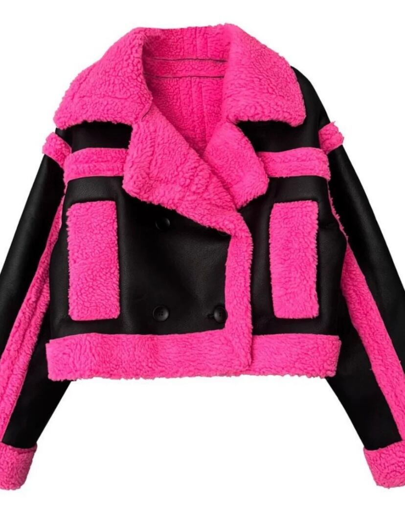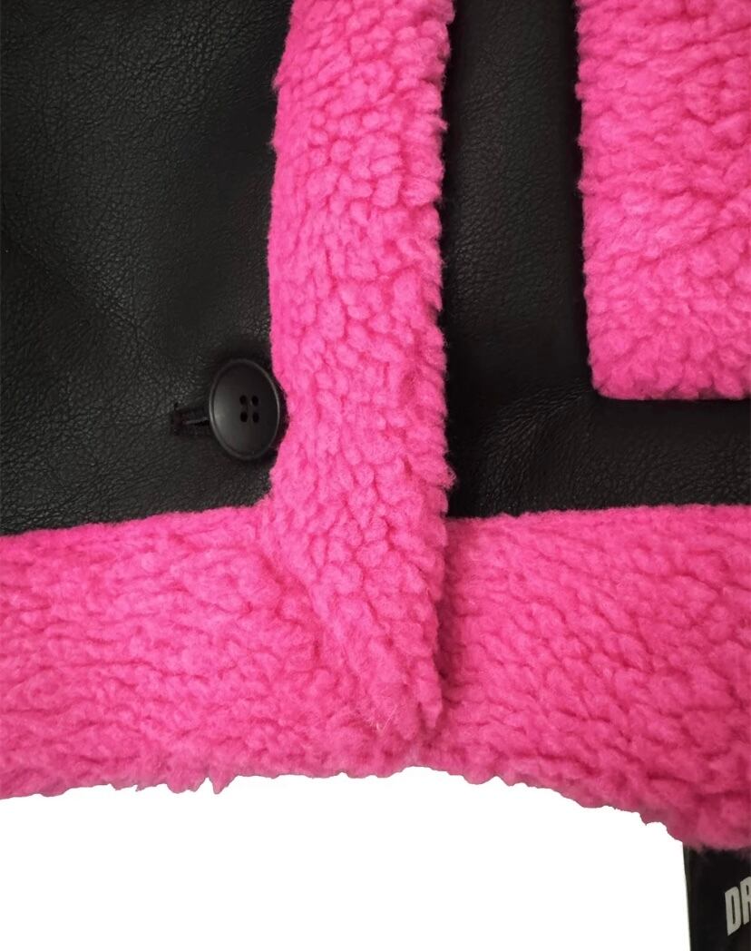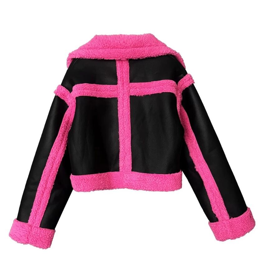 レザー 黒 ピンク コート ジャケット ネオン ピンク ワイルド ショート ムートンアウター カーディガン ブルゾン パイル スーツ