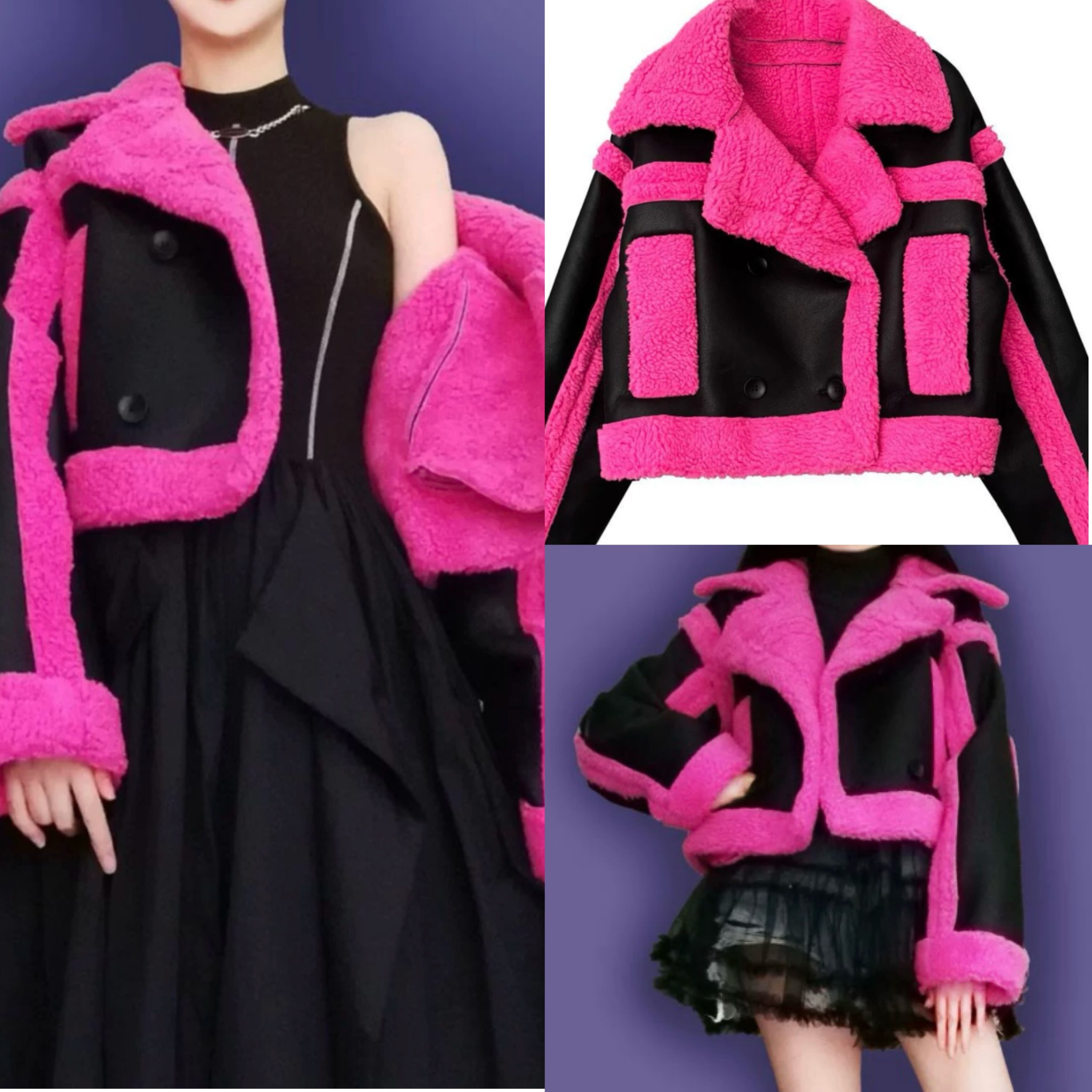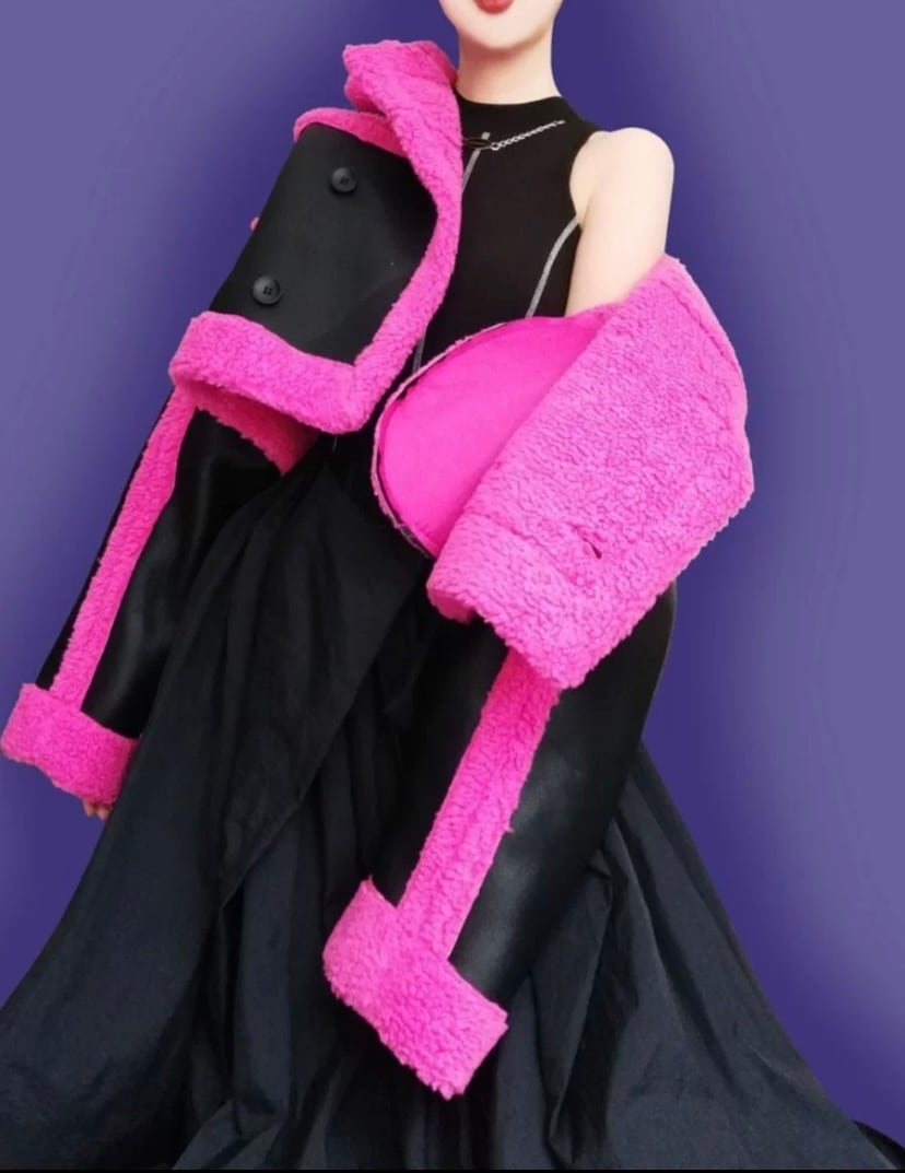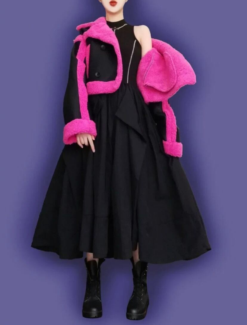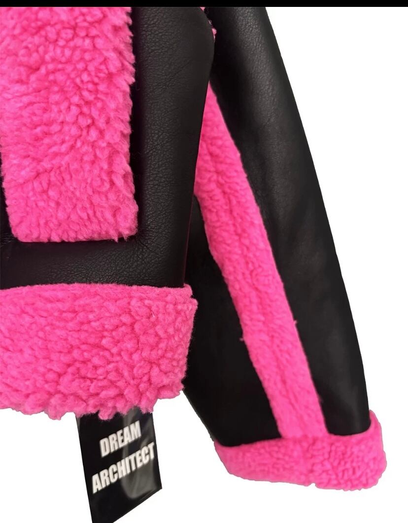 レザー 黒 ピンク コート ジャケット ネオン ピンク ワイルド ショート ムートンアウター カーディガン ブルゾン パイル スーツ