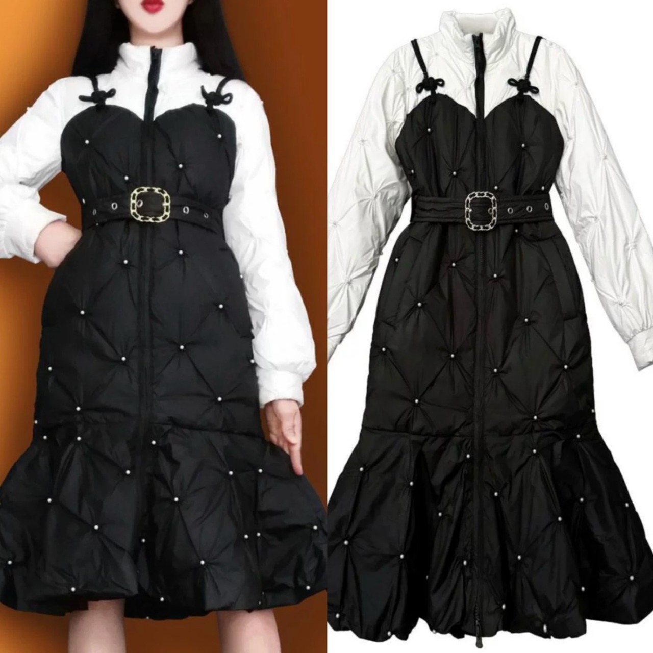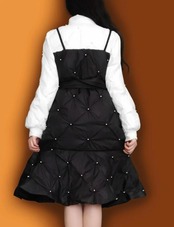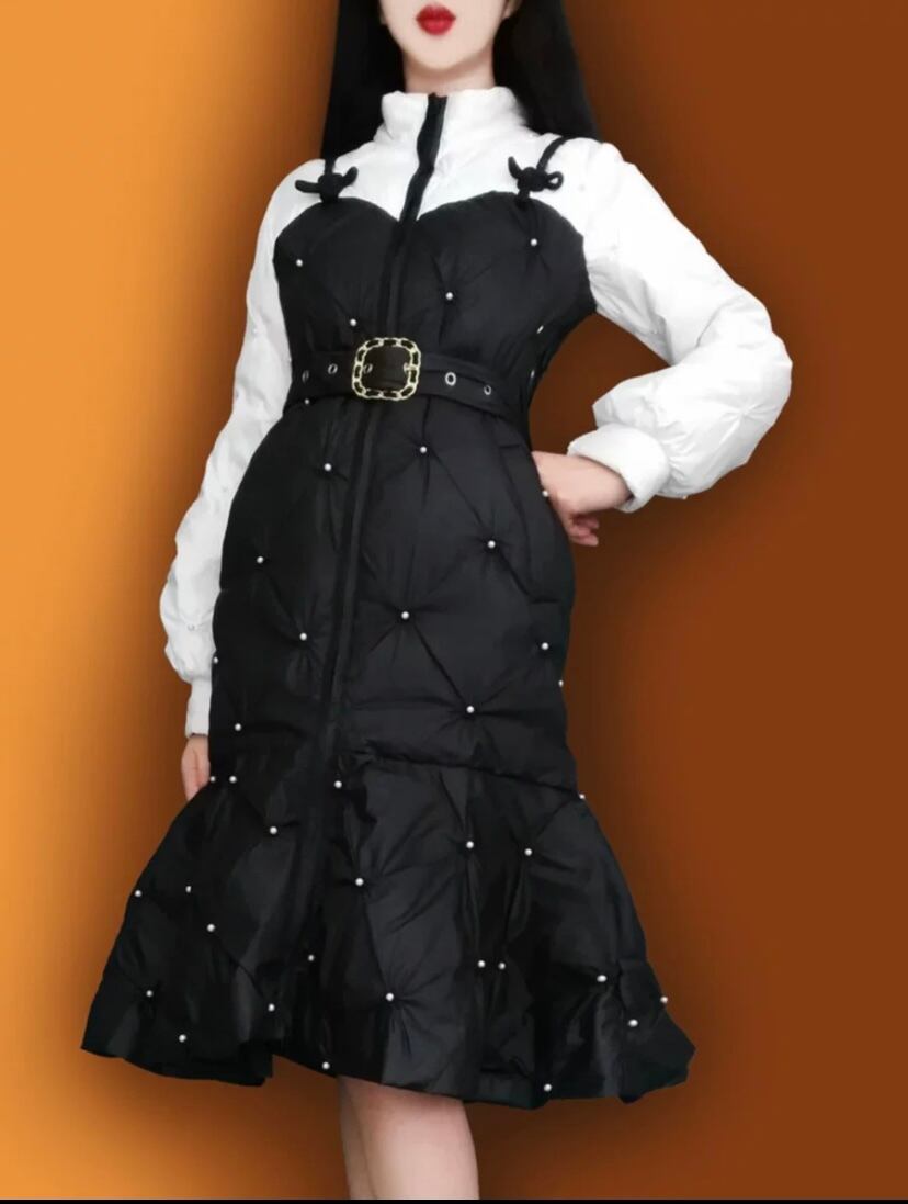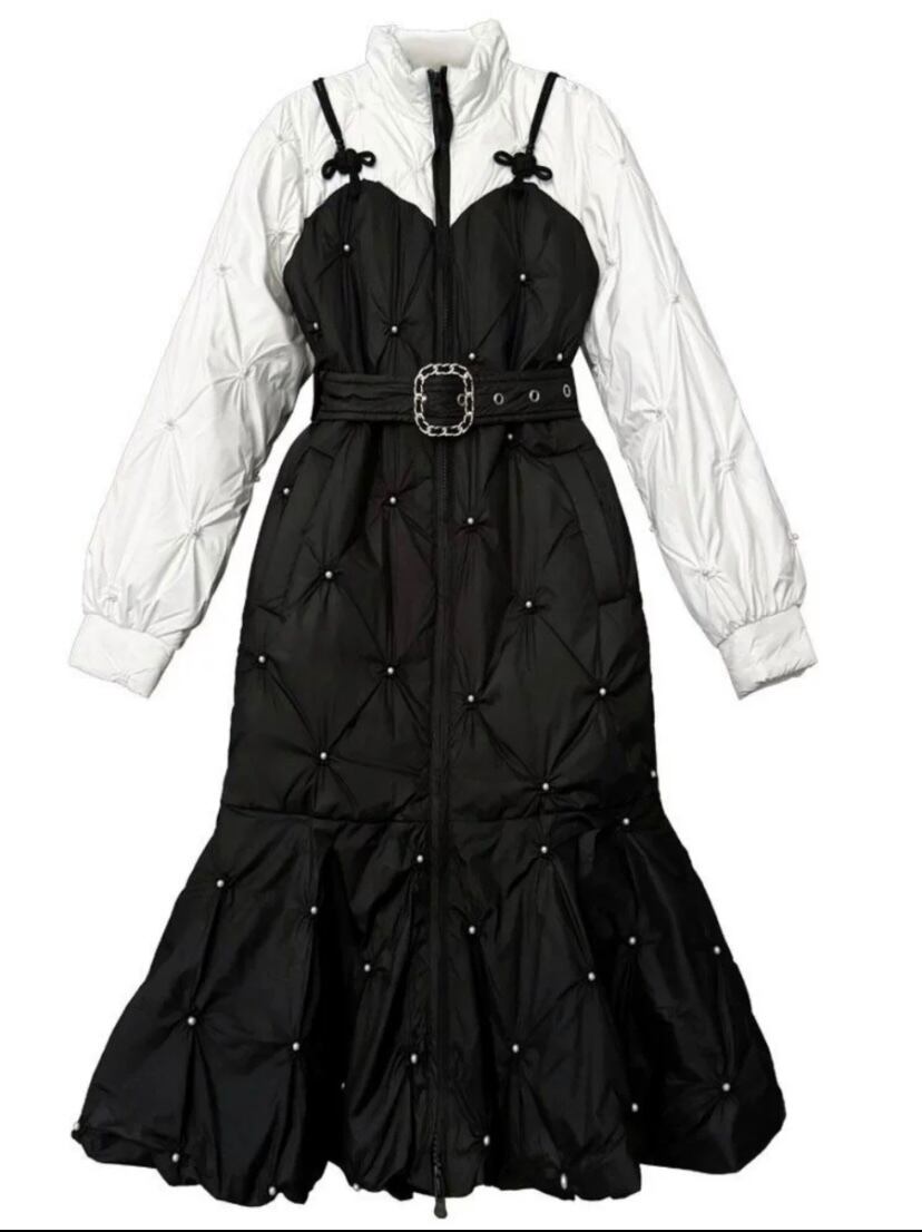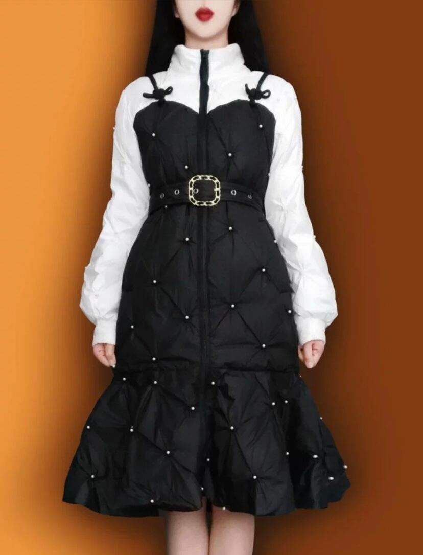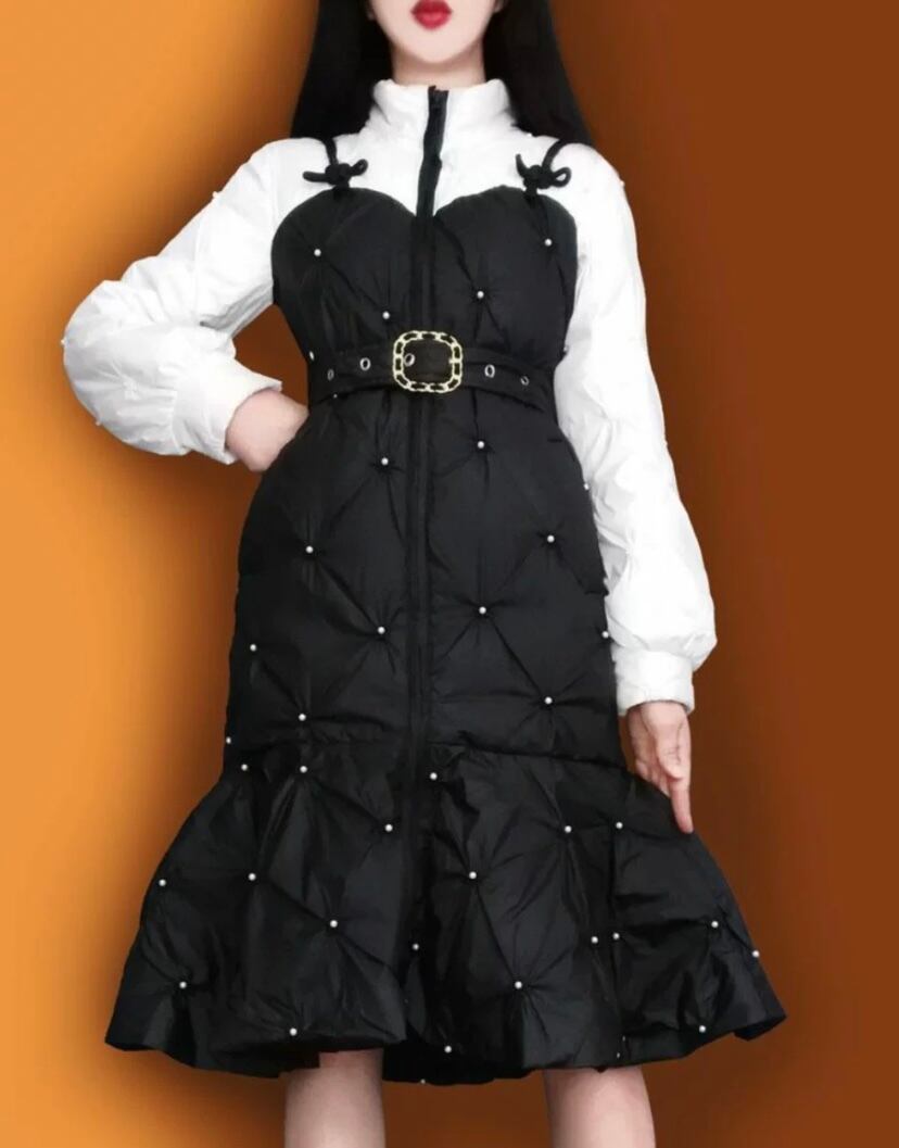 ワンピース風 ベルト 黒 白 コート ダウン ジャケット アウター リボン ガーリー