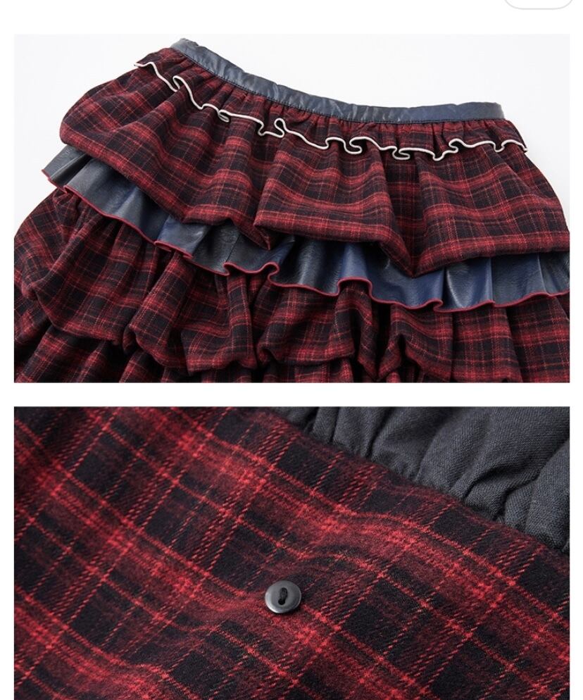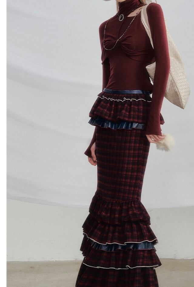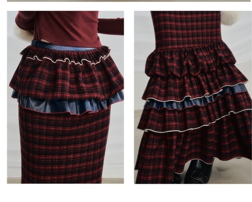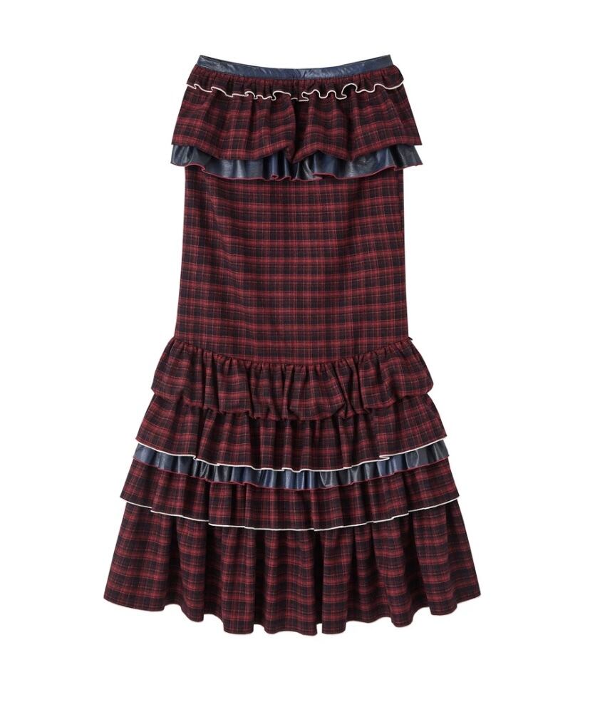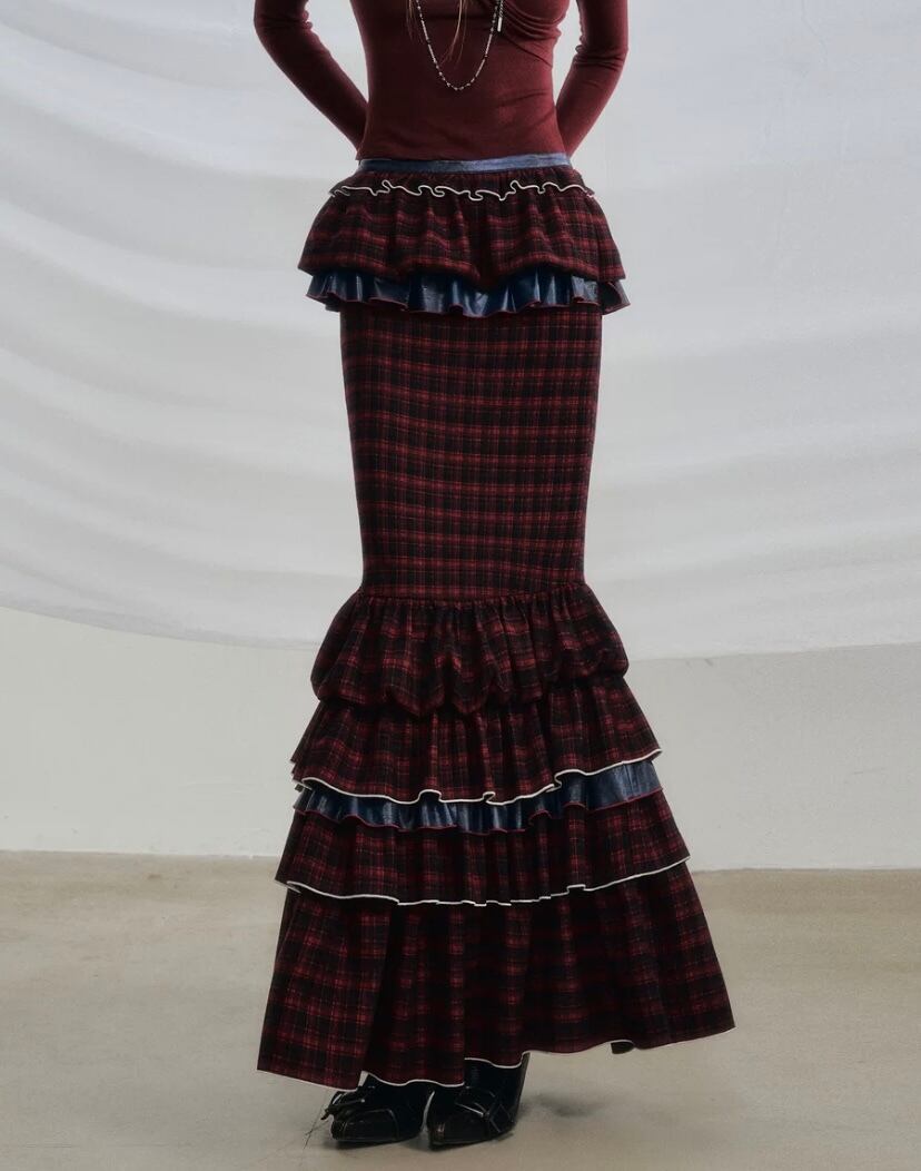 チェック マーメイド マキシ ガーリー スカート フリル 赤 可愛い タイト 段々 XL 原宿 お嬢様