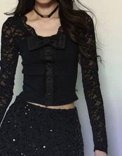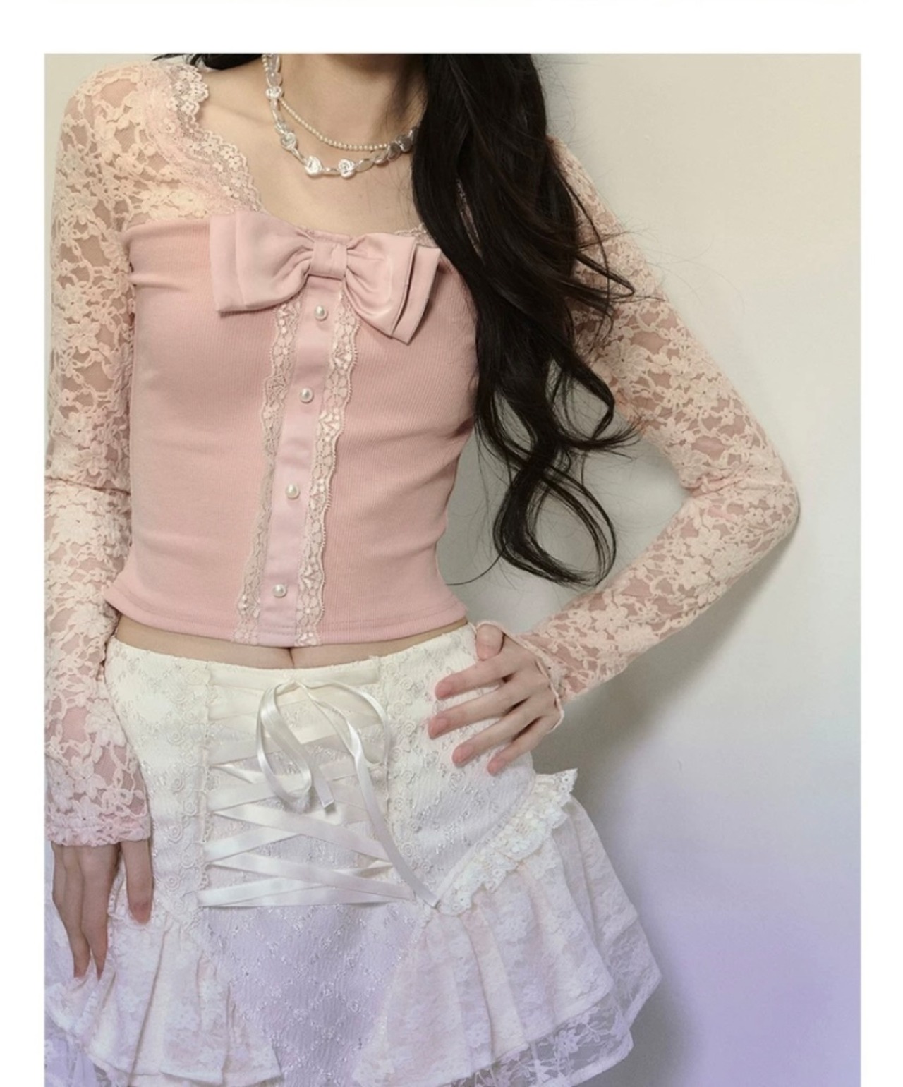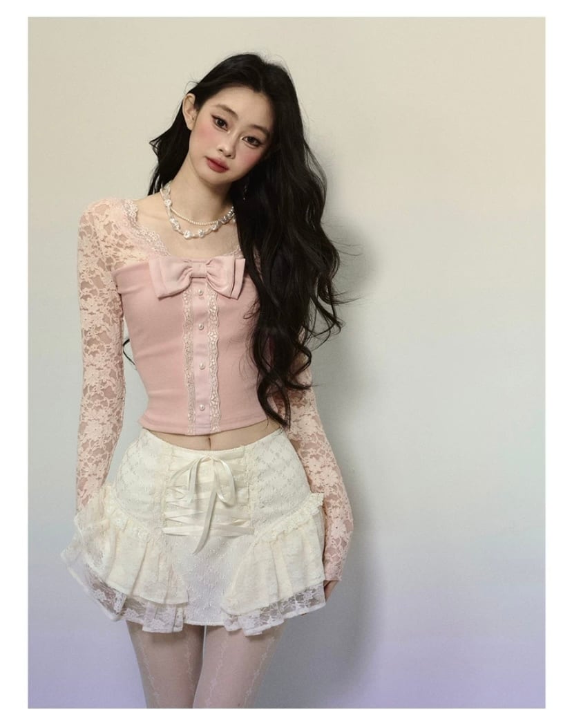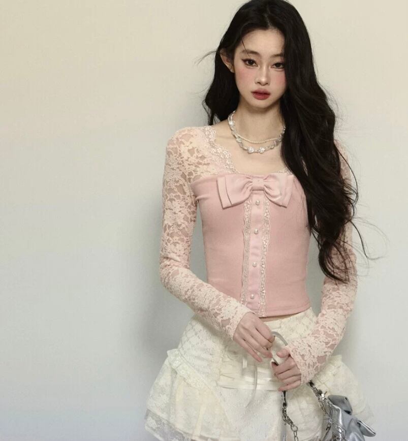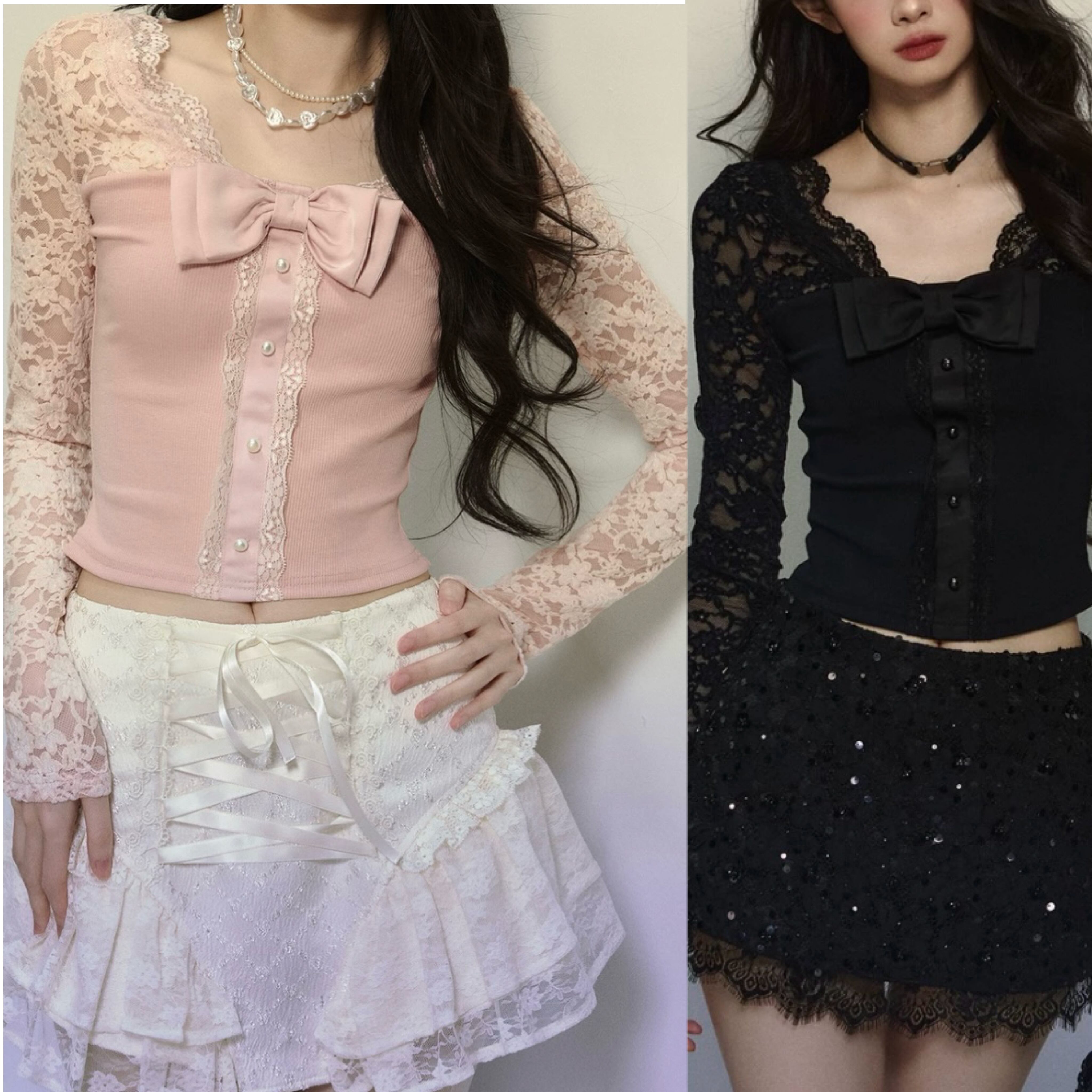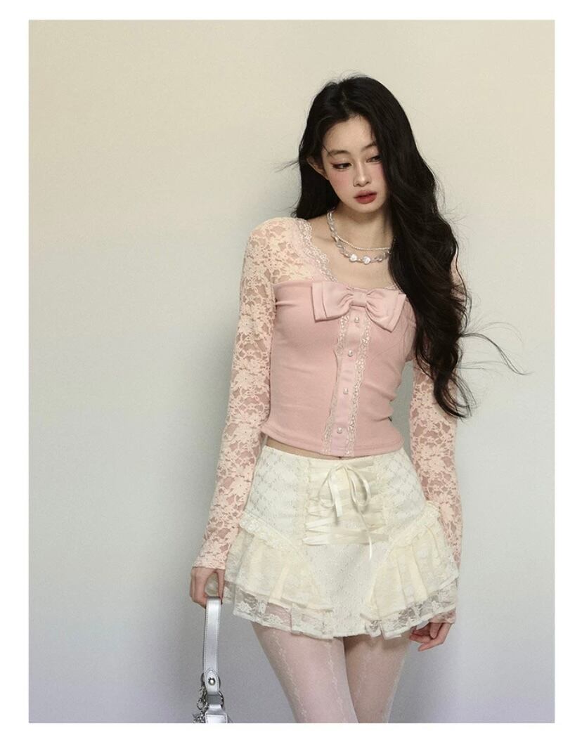ピンク 黒 リボン レース トップス ブラウス 可愛い 姫 原宿 お嬢様 カーディガン エレガント
