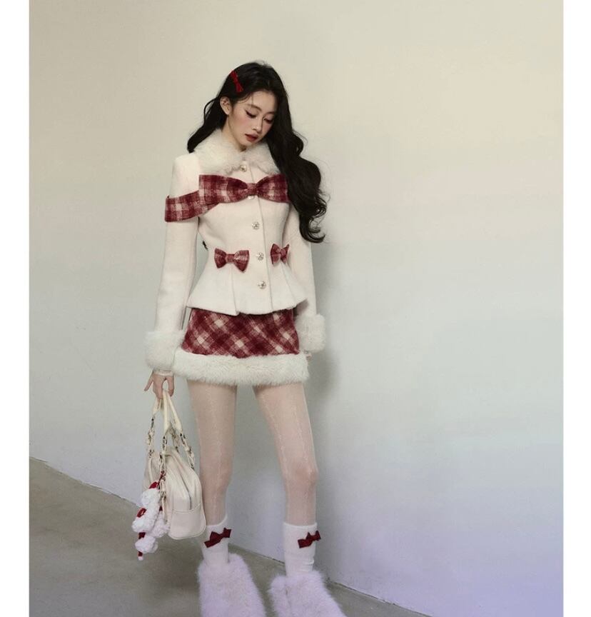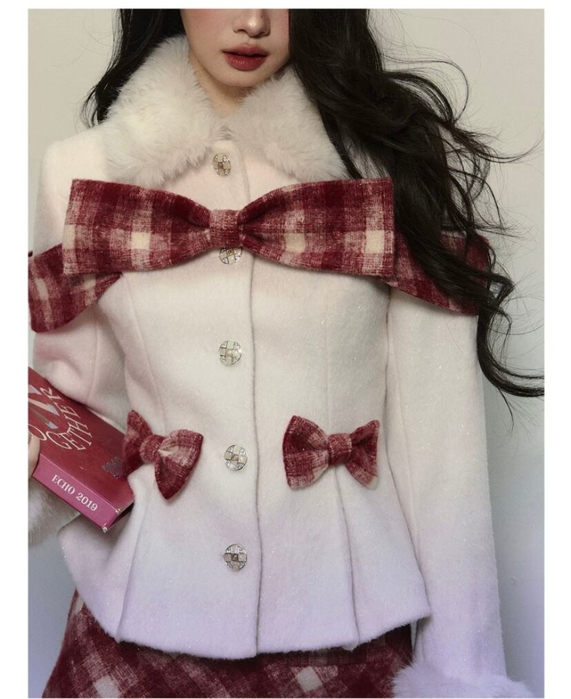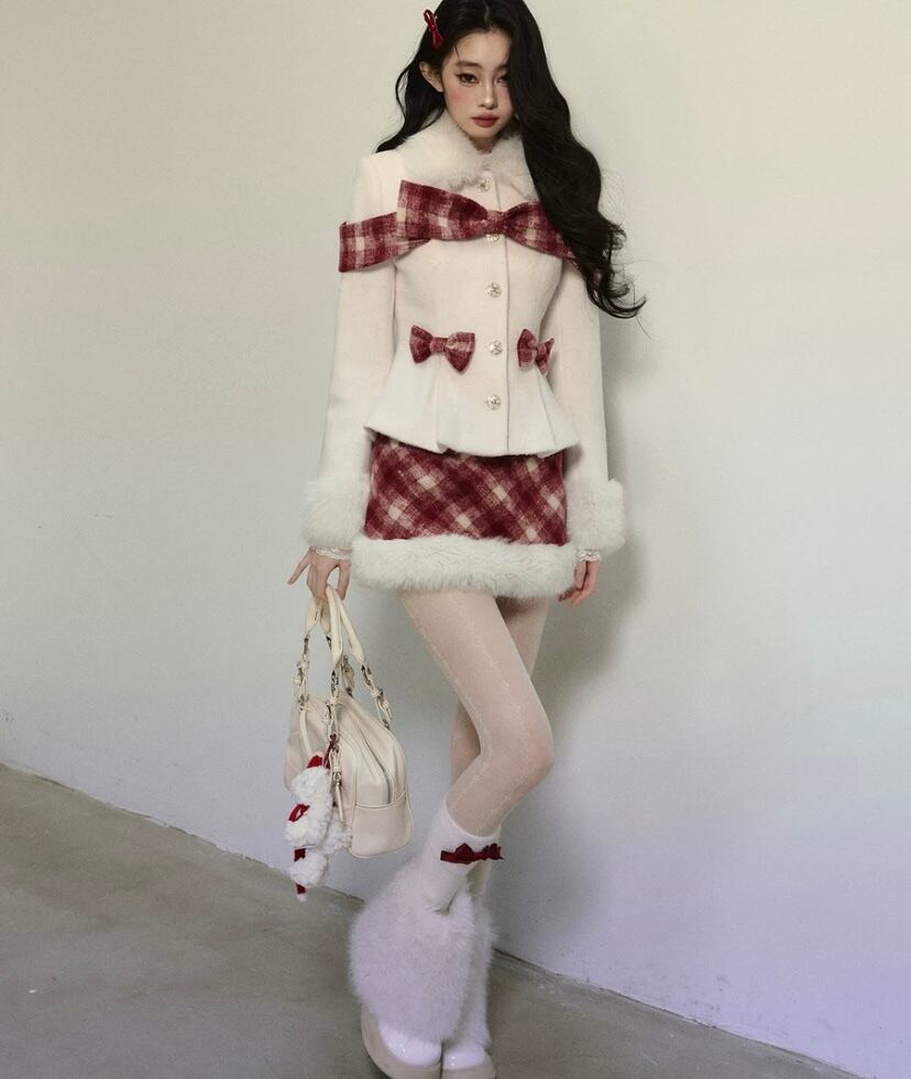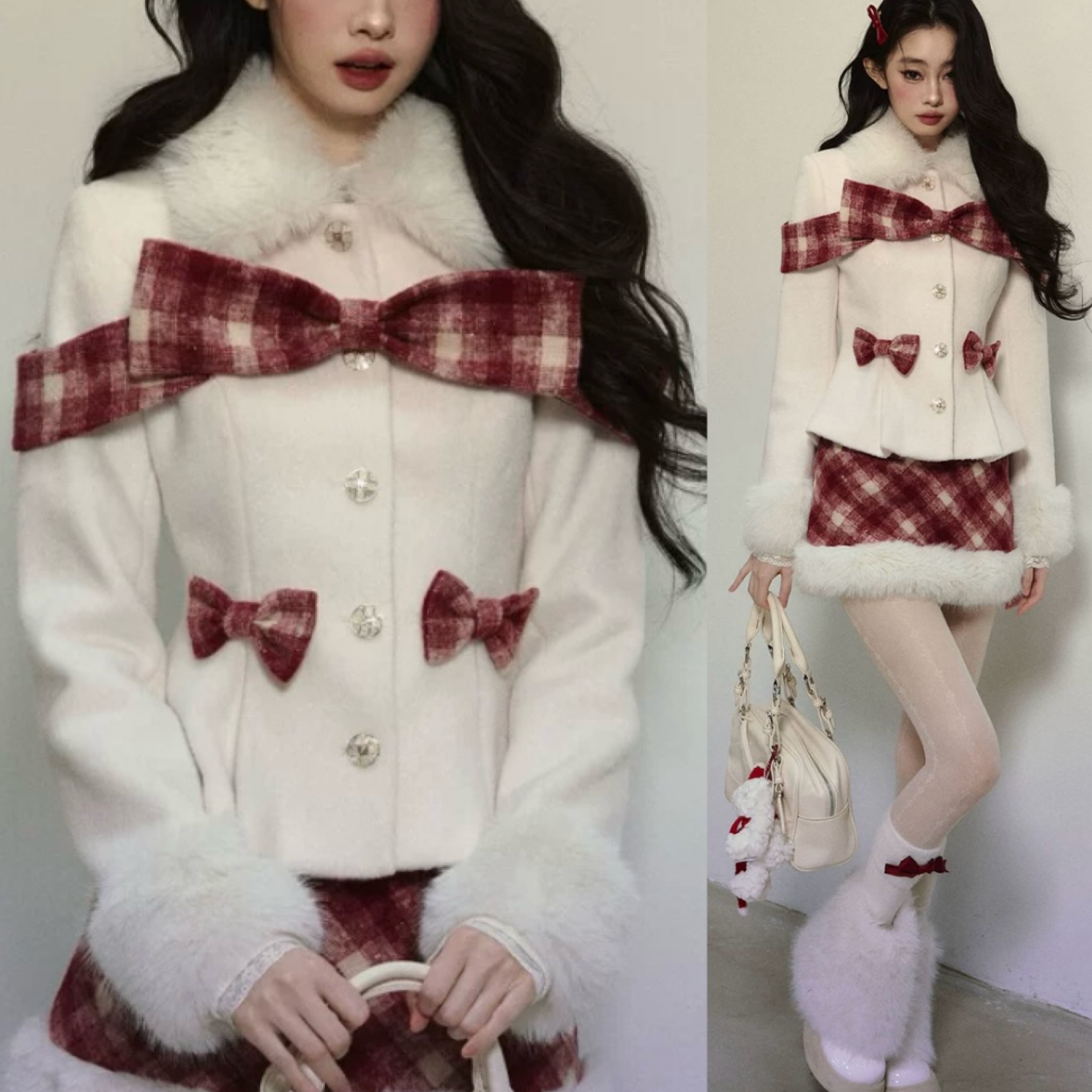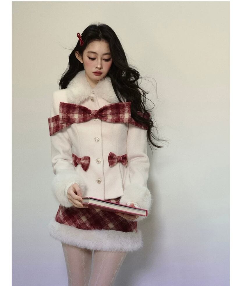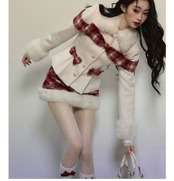 【セットアップ】スーツ コート リボン 可愛い ファー カーディガン チェック 白 ミニスカート 姫 ロリータ 原宿 可愛い 雪 アウター コート リボン 赤