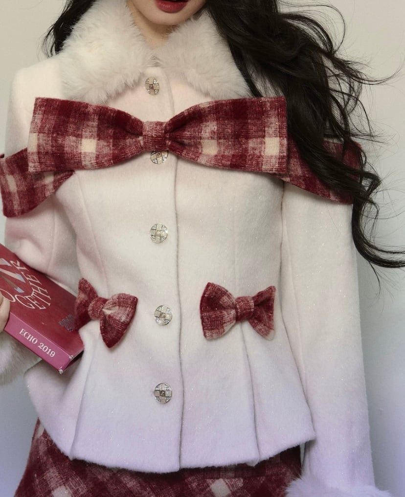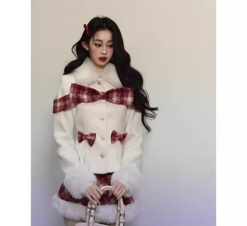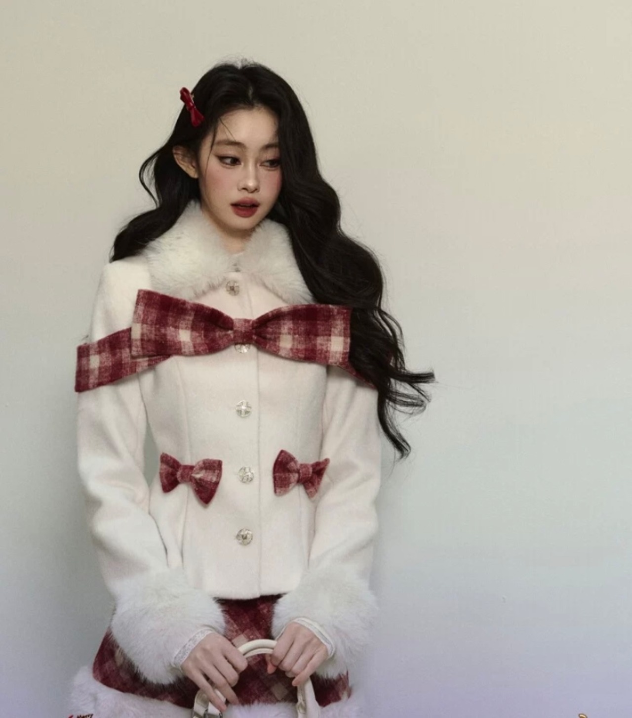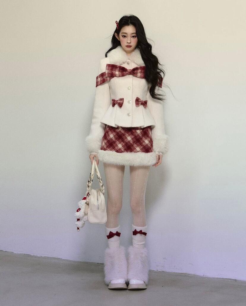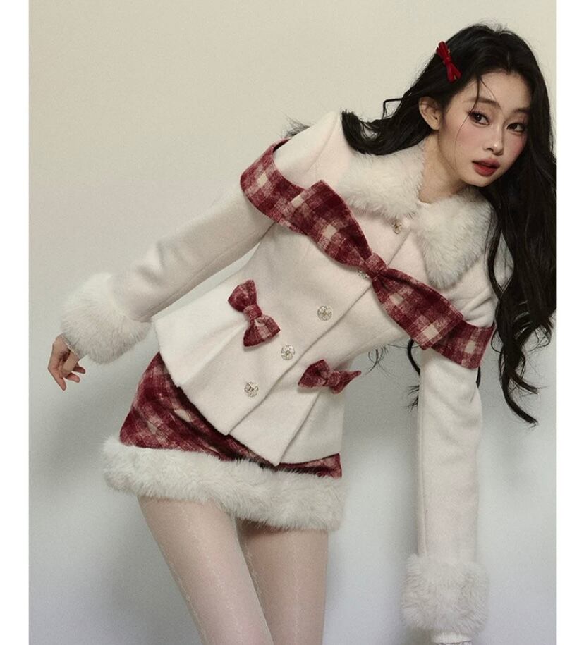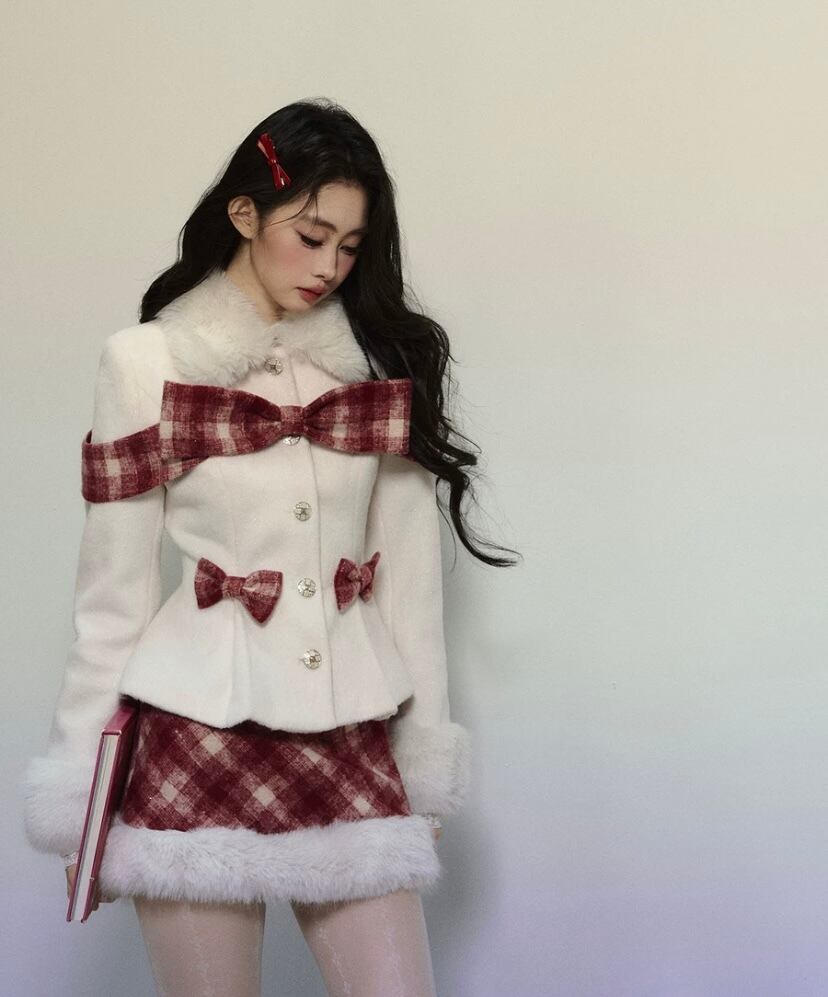【セットアップ】スーツ コート リボン 可愛い ファー カーディガン チェック 白 ミニスカート 姫 ロリータ 原宿 可愛い 雪 アウター コート リボン 赤