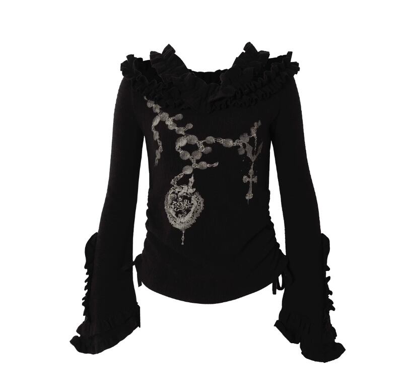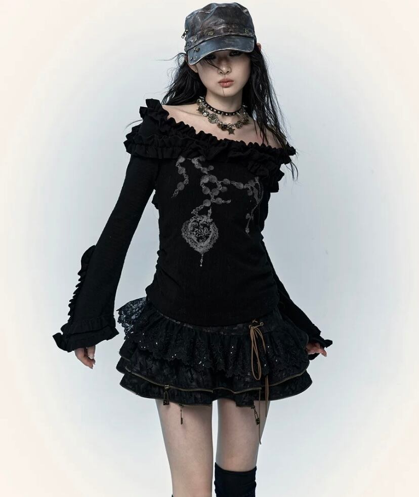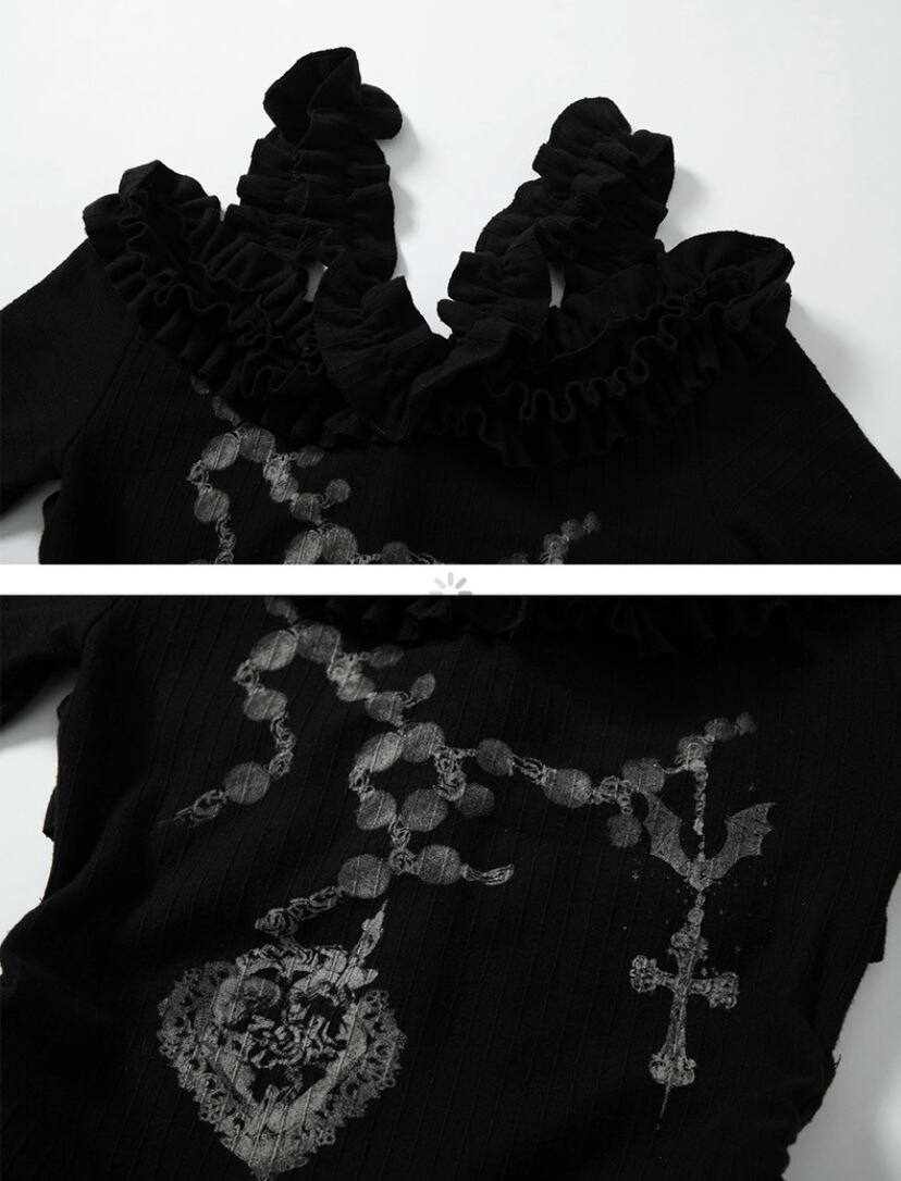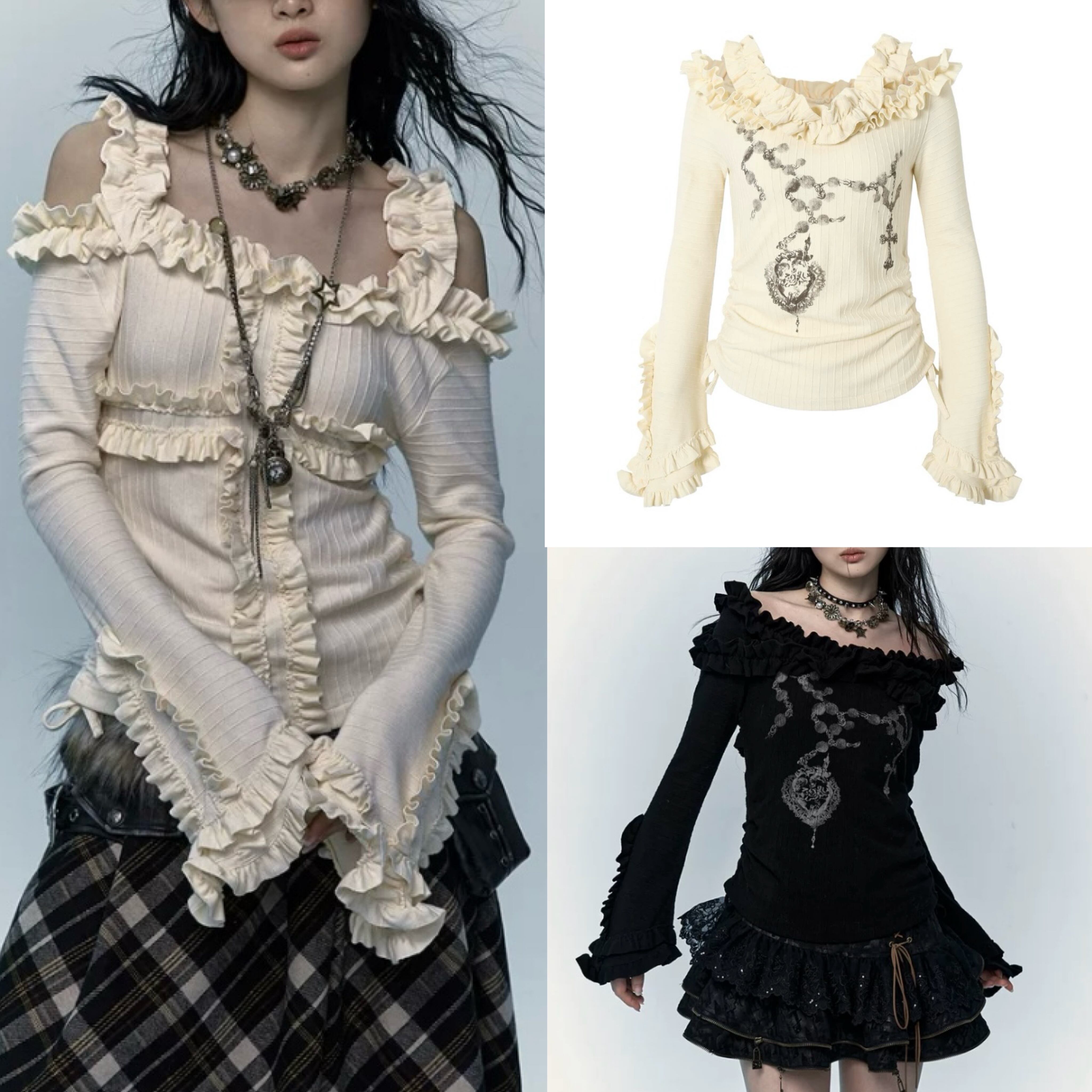 【リバーシブル】オフショルダー、白、白、黒 トップス ブラウス、カジュアル Tシャツ 騙し絵 クロス、ネックレス、フリル リボン、新宿、ロック パンク 裏原