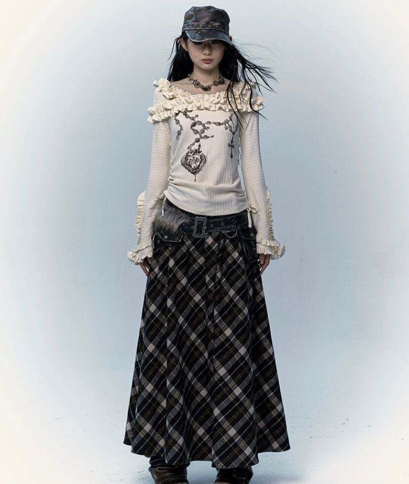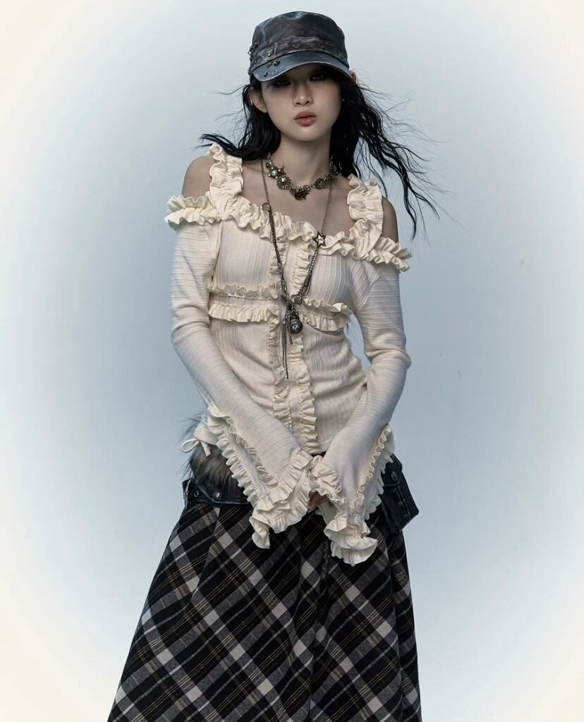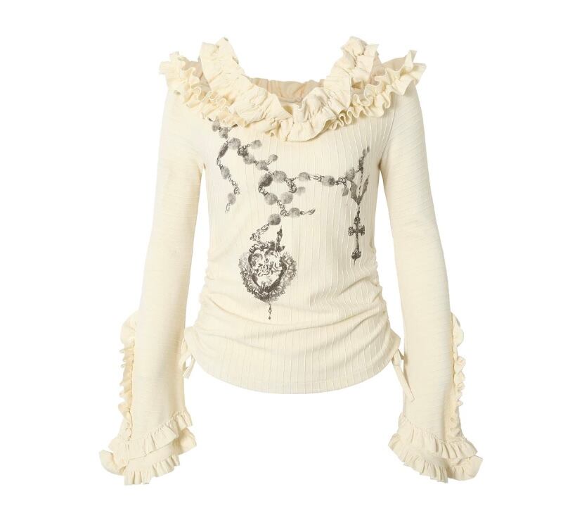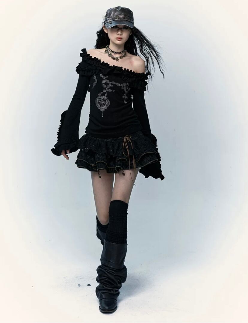 【リバーシブル】オフショルダー、白、白、黒 トップス ブラウス、カジュアル Tシャツ 騙し絵 クロス、ネックレス、フリル リボン、新宿、ロック パンク 裏原