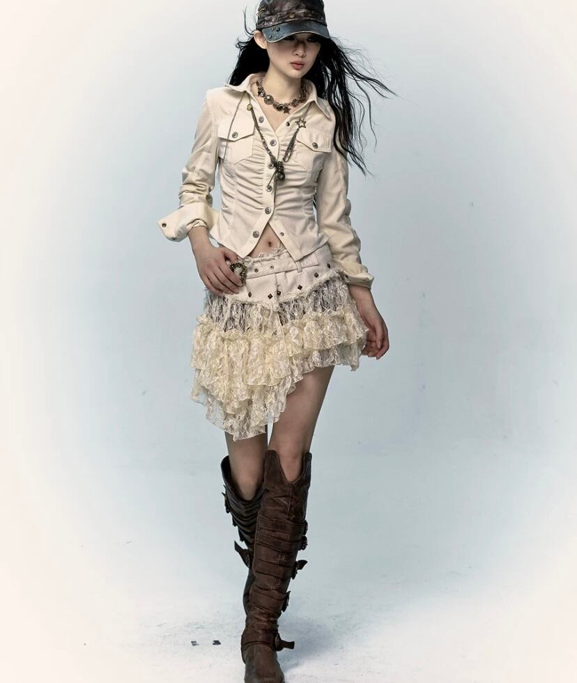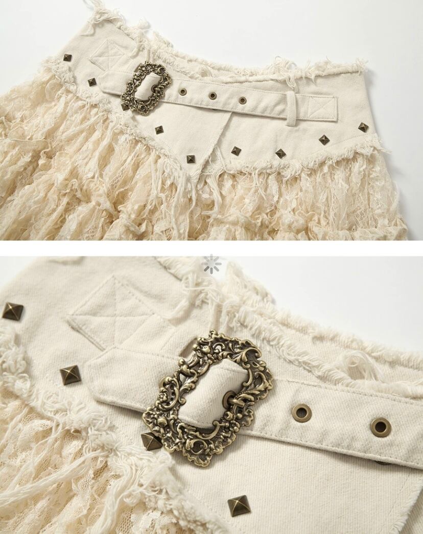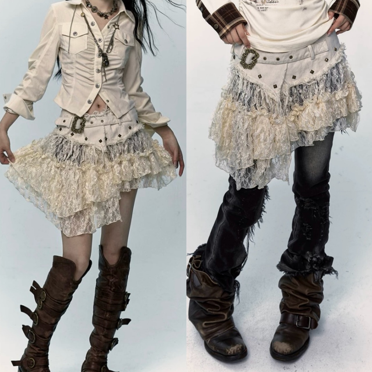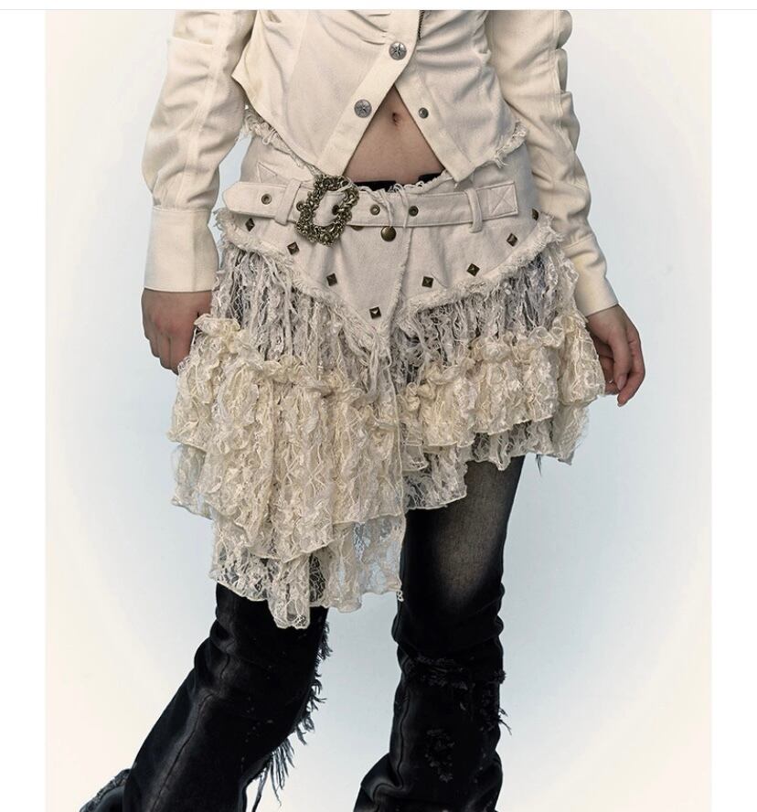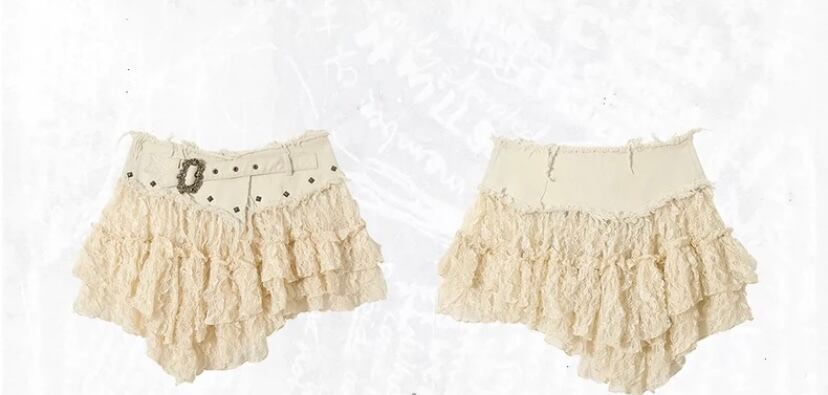 ミニスカート ベージュ、白レース、重ね着 ボトムス パンク バンド ミニスカート ベージュ レース