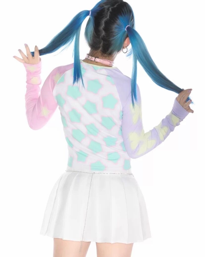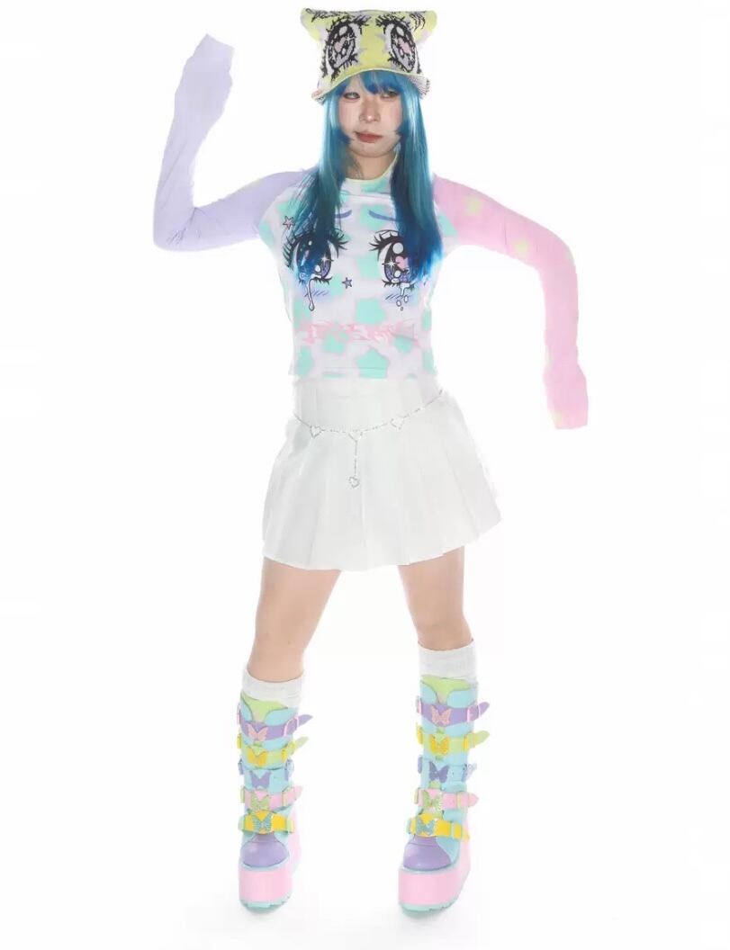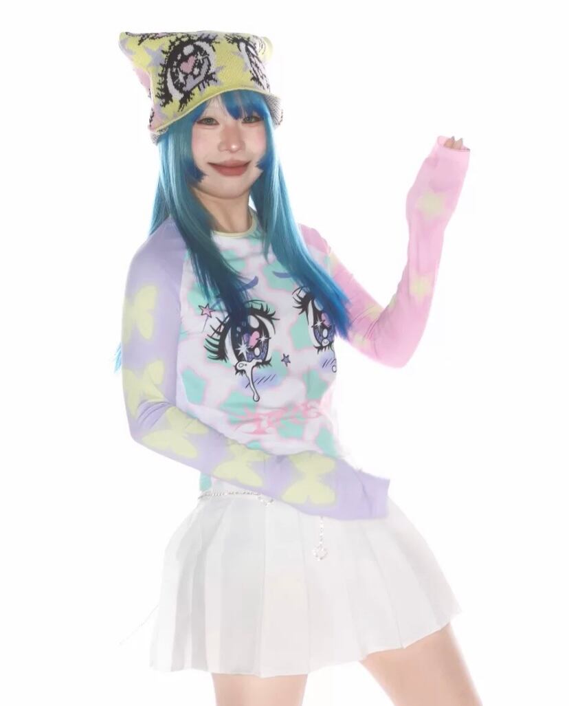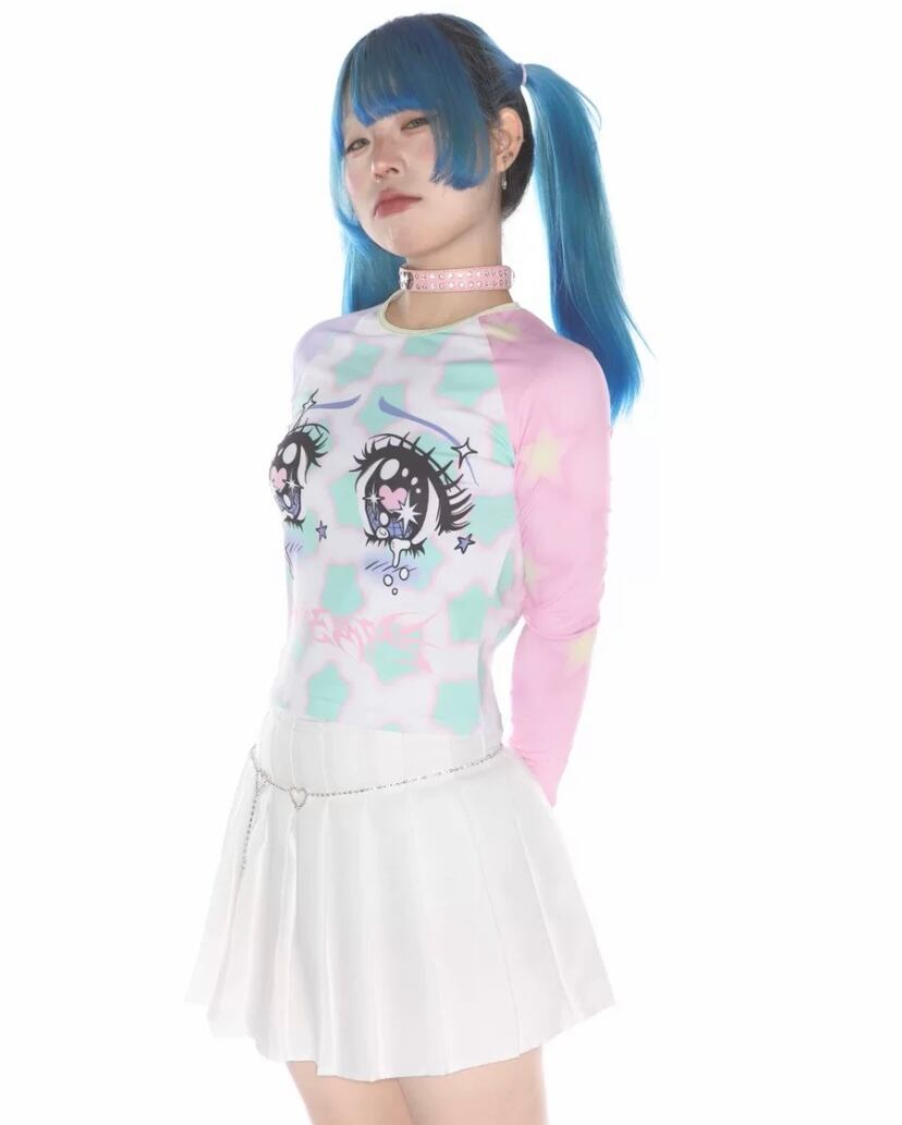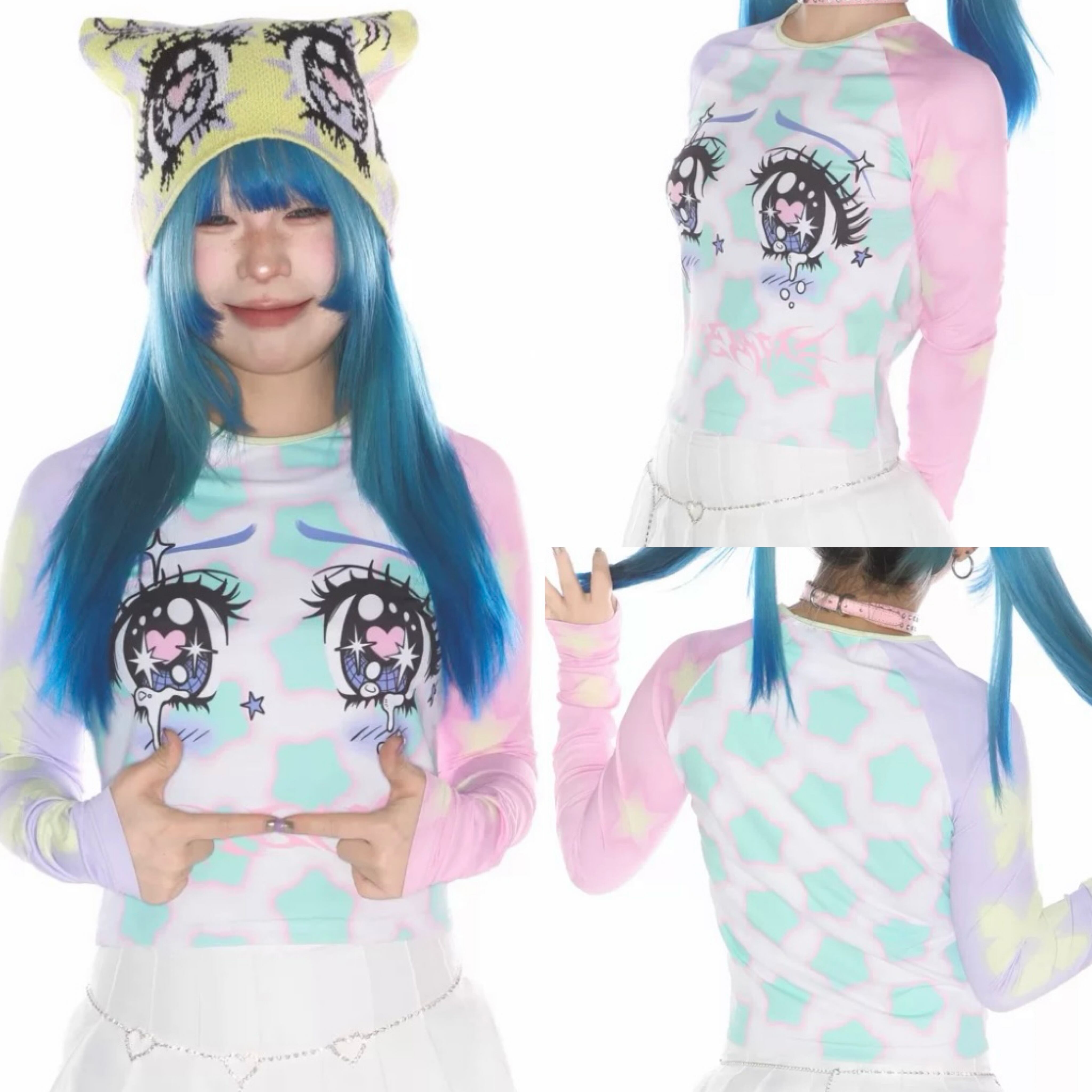 可愛い Tシャツ ブラウス トップス 黄色 水色 ピンク 柄 うろこ 目 アニメ ブラウス 可愛い 原宿 秋葉原 ロンT