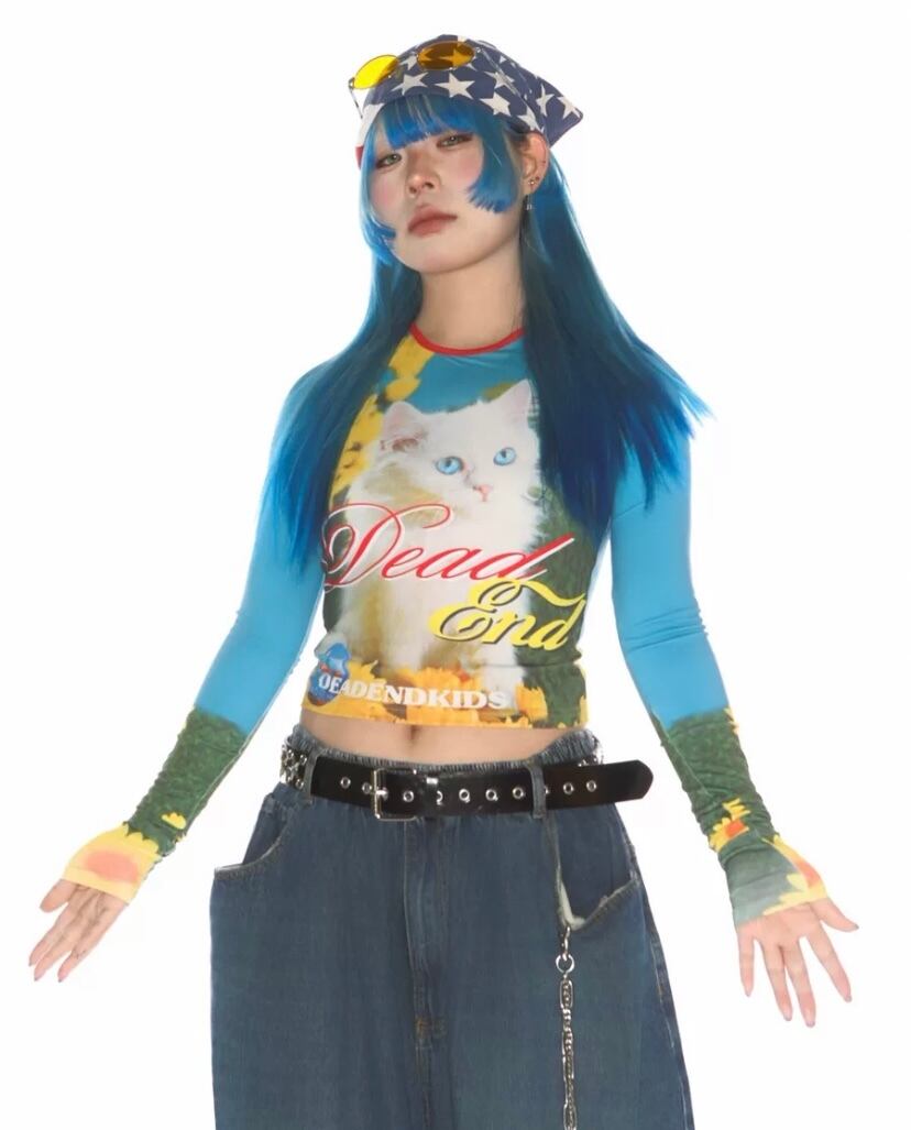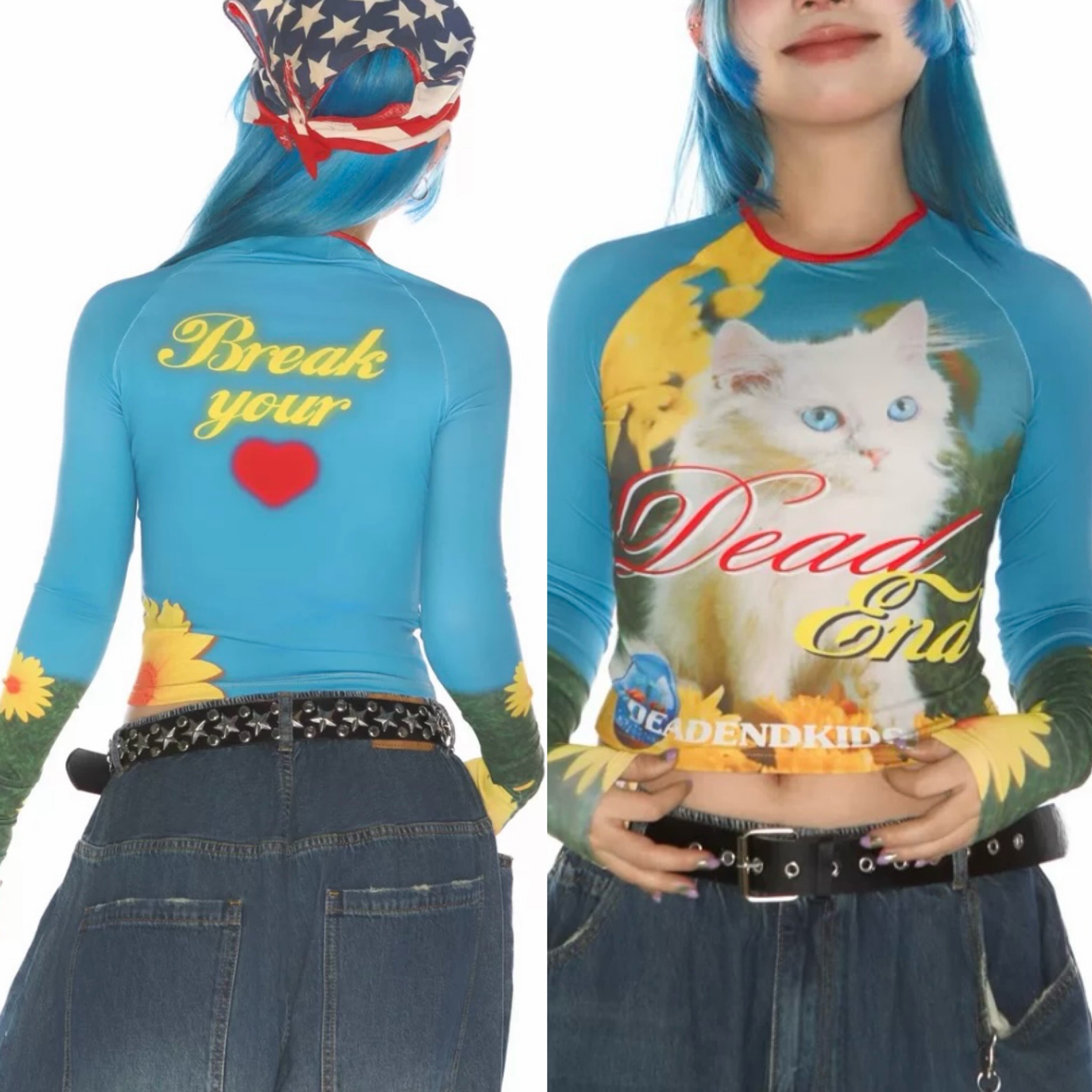 水色 ねこ 花柄 フラワー ハート 赤 アメリカン 可愛い Tシャツ ブラウス トップス 黄色 水色 ピンク 柄 うろこ 目 アニメ ブラウス 可愛い 原宿 秋葉原 ロンT