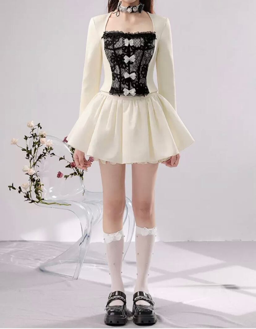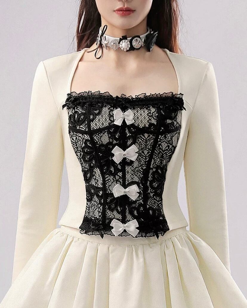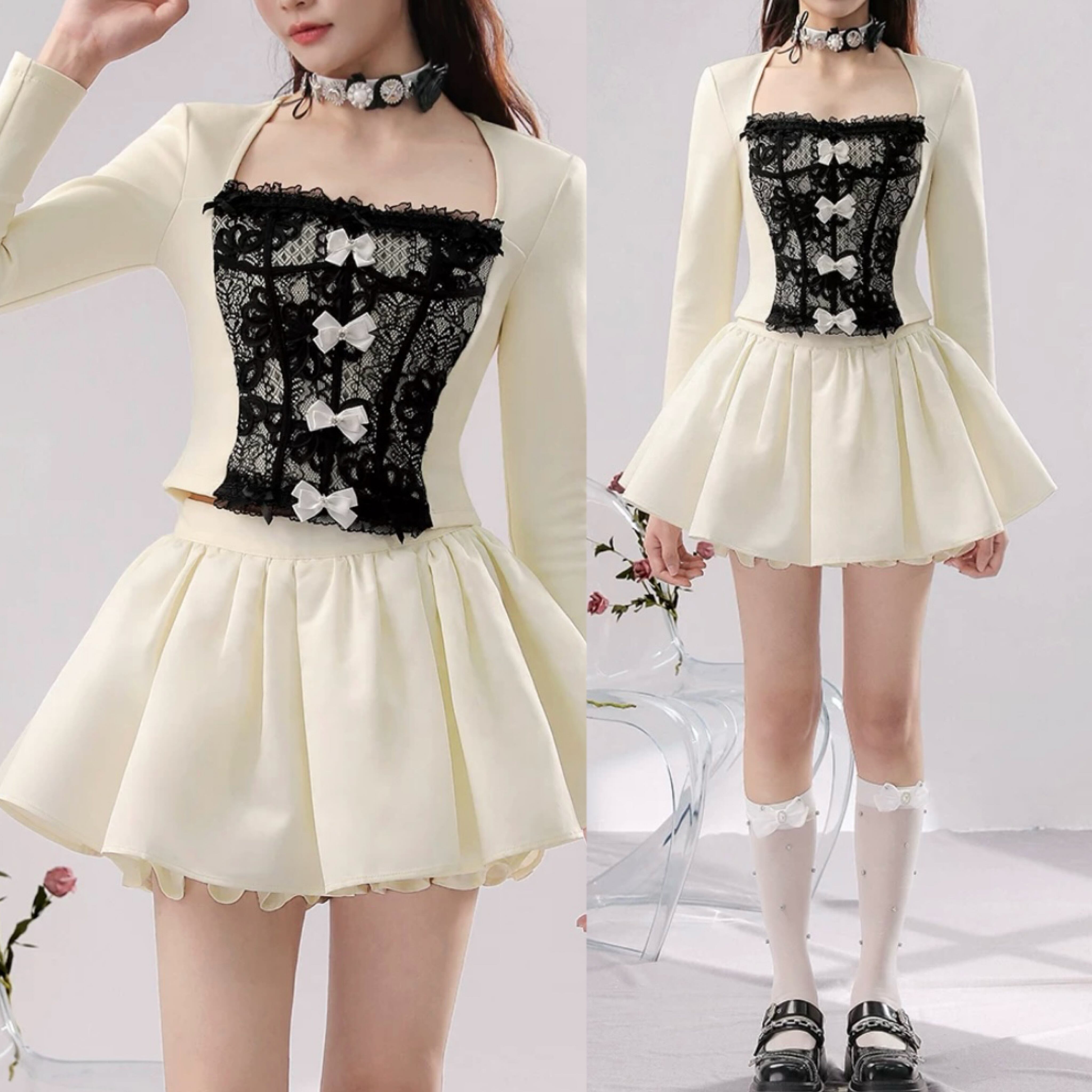ベージュ 黒 ブラウス トップス ガーリー 可愛い