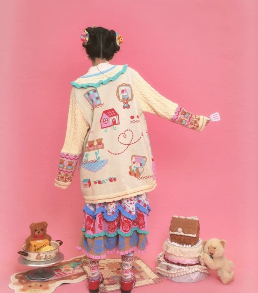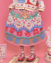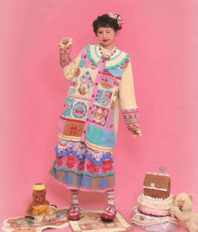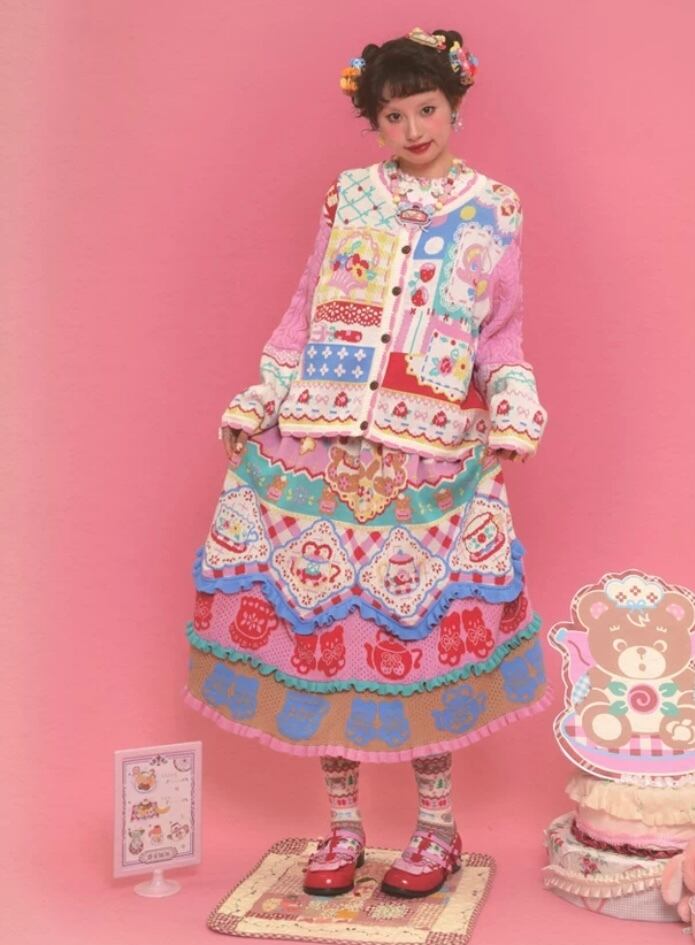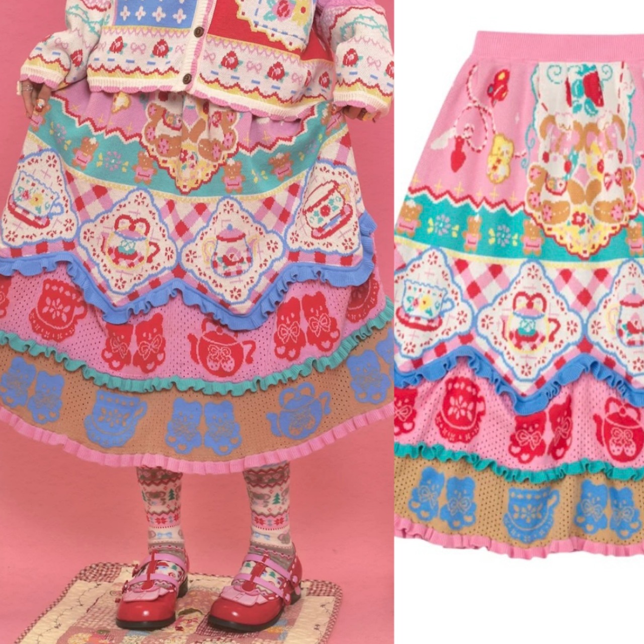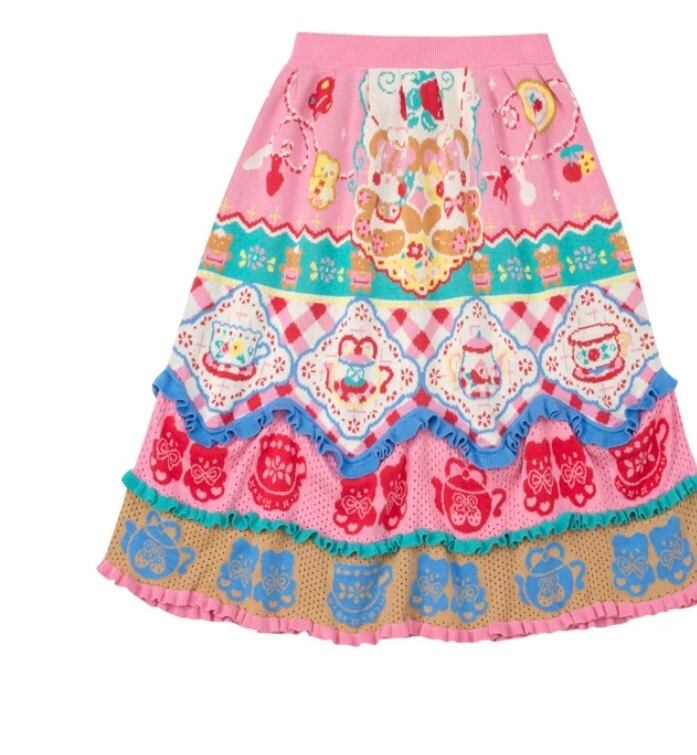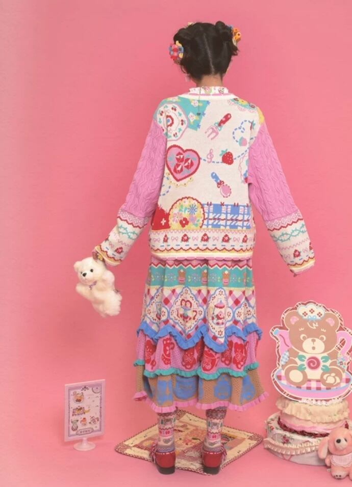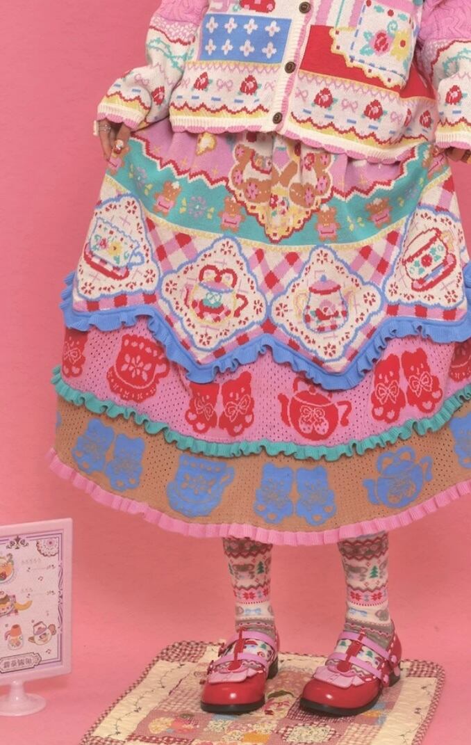 ニットスカート ボトムス カラフル パッチワーク かわいい 熊 うさぎ ケーキ スイーツ 柄 ボトムス ニット ワンピース マキシ ロング 原宿 姫 ロリータ