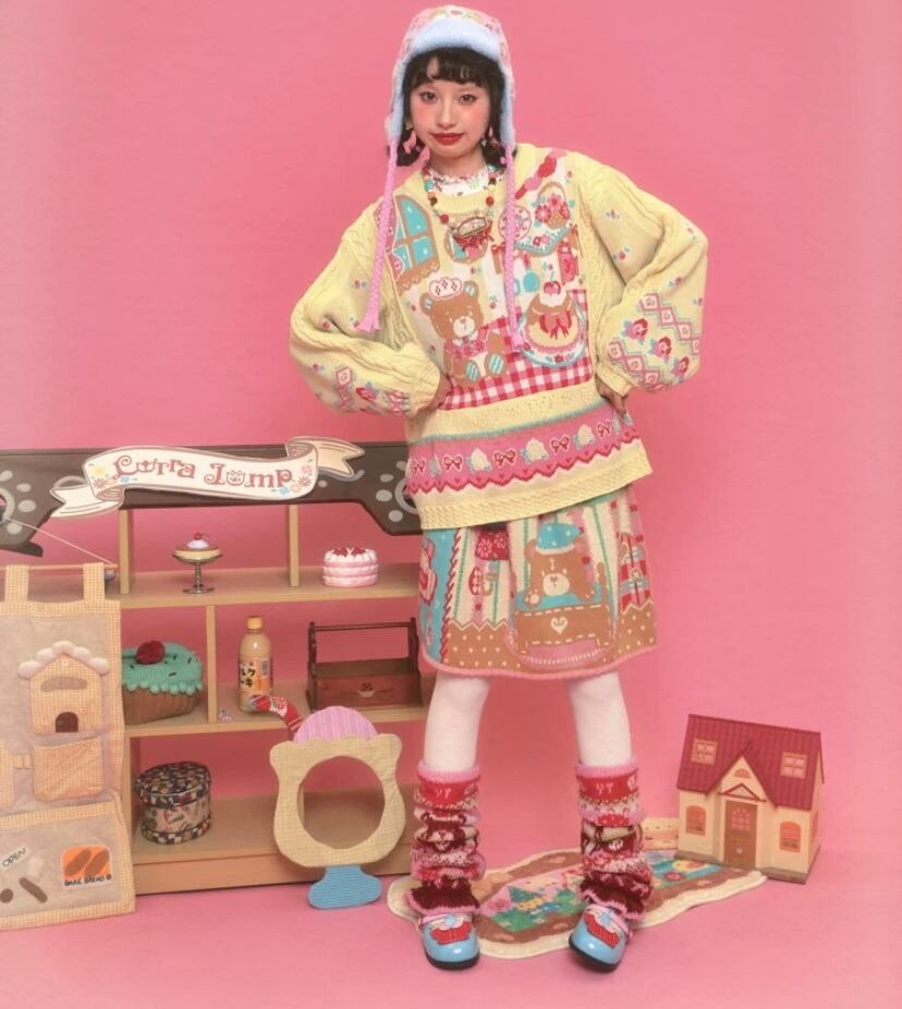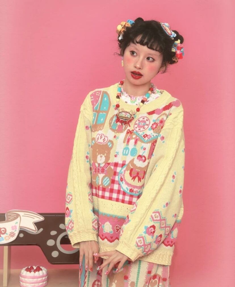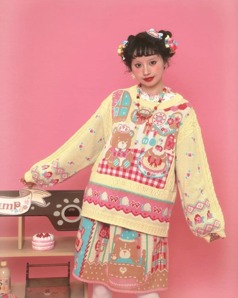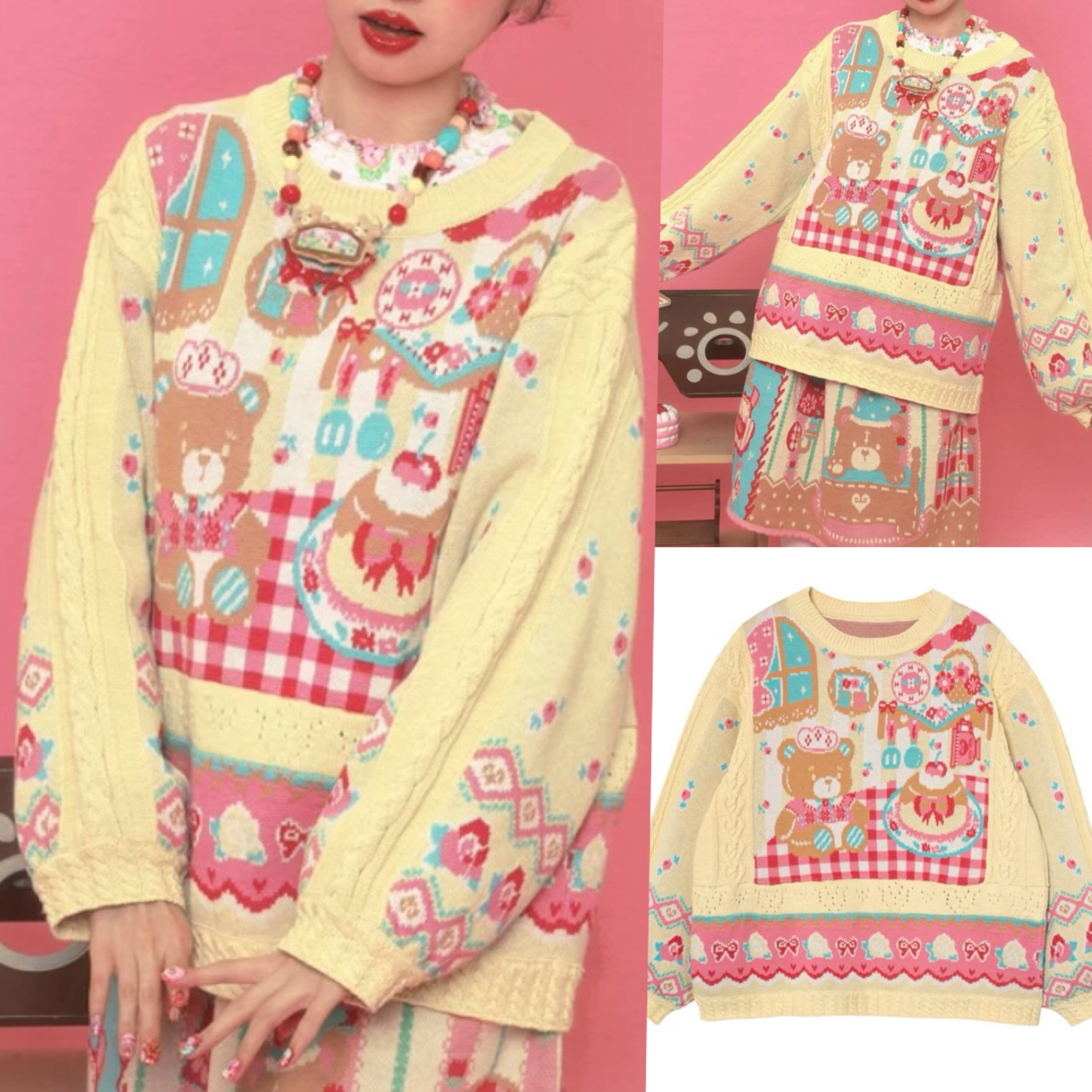 黄色 ニット、赤 チェック カーディガン、セーター トップス アウター ジャケット パッチワーク 柄 ロリータ 原宿 可愛い 姫 ハート くまさん