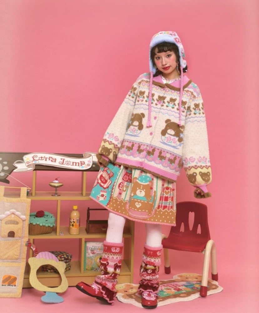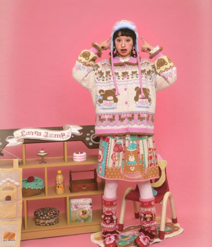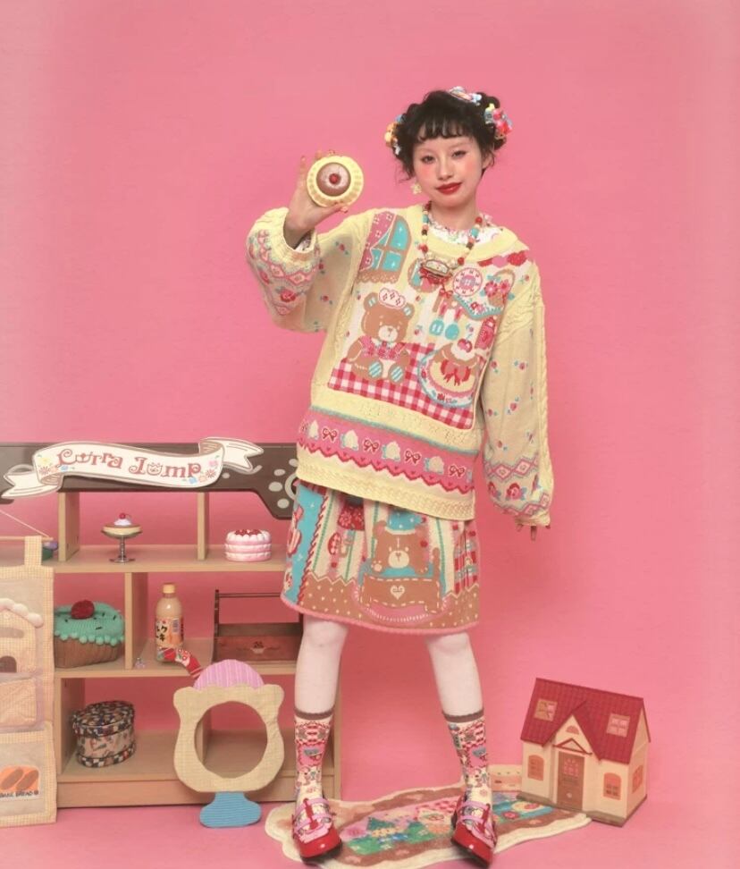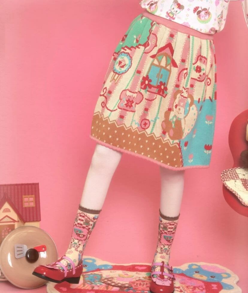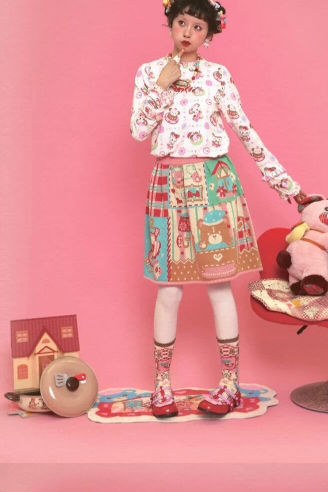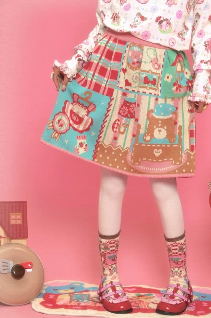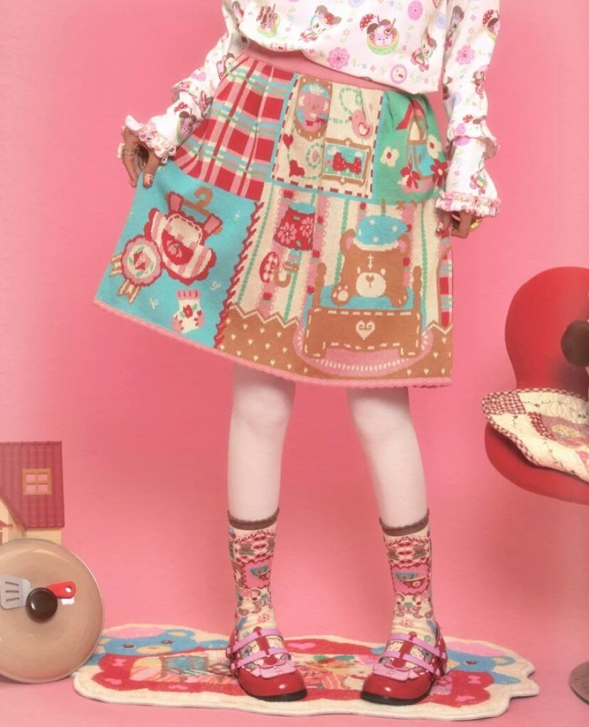 カラフル パッチワーク ケーキ、くまさん 原宿 ロリータ 水色、イチゴ 赤 ピンク ベージュ ボトムス スカート ニット 姫姫