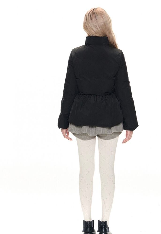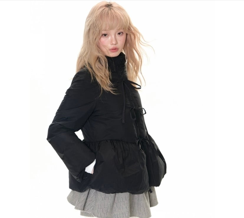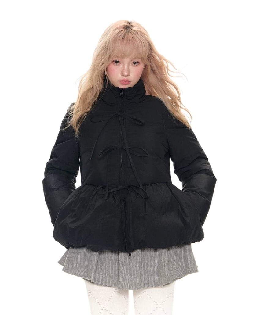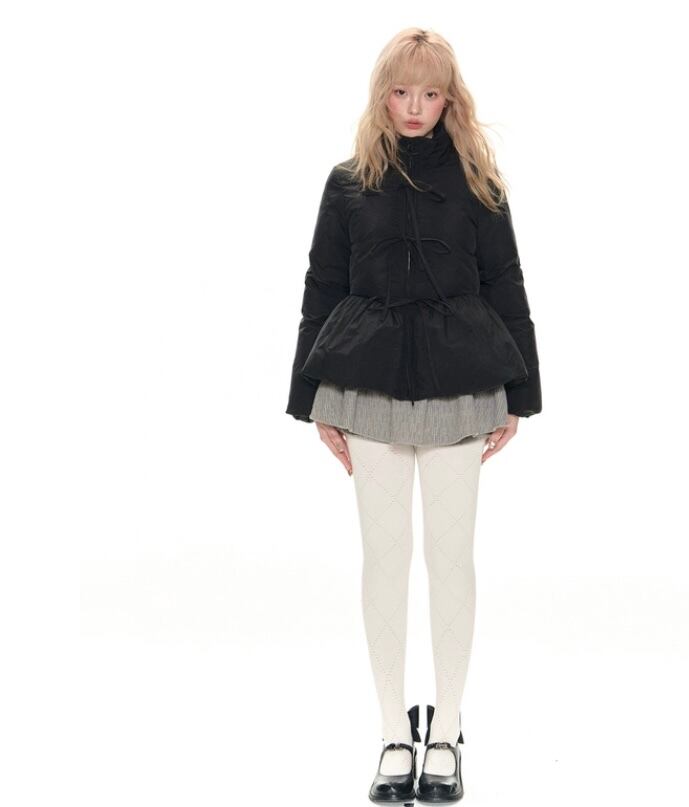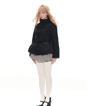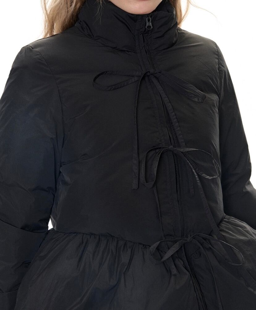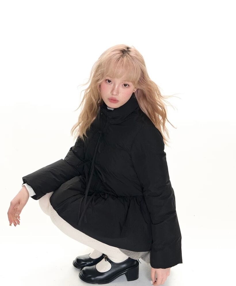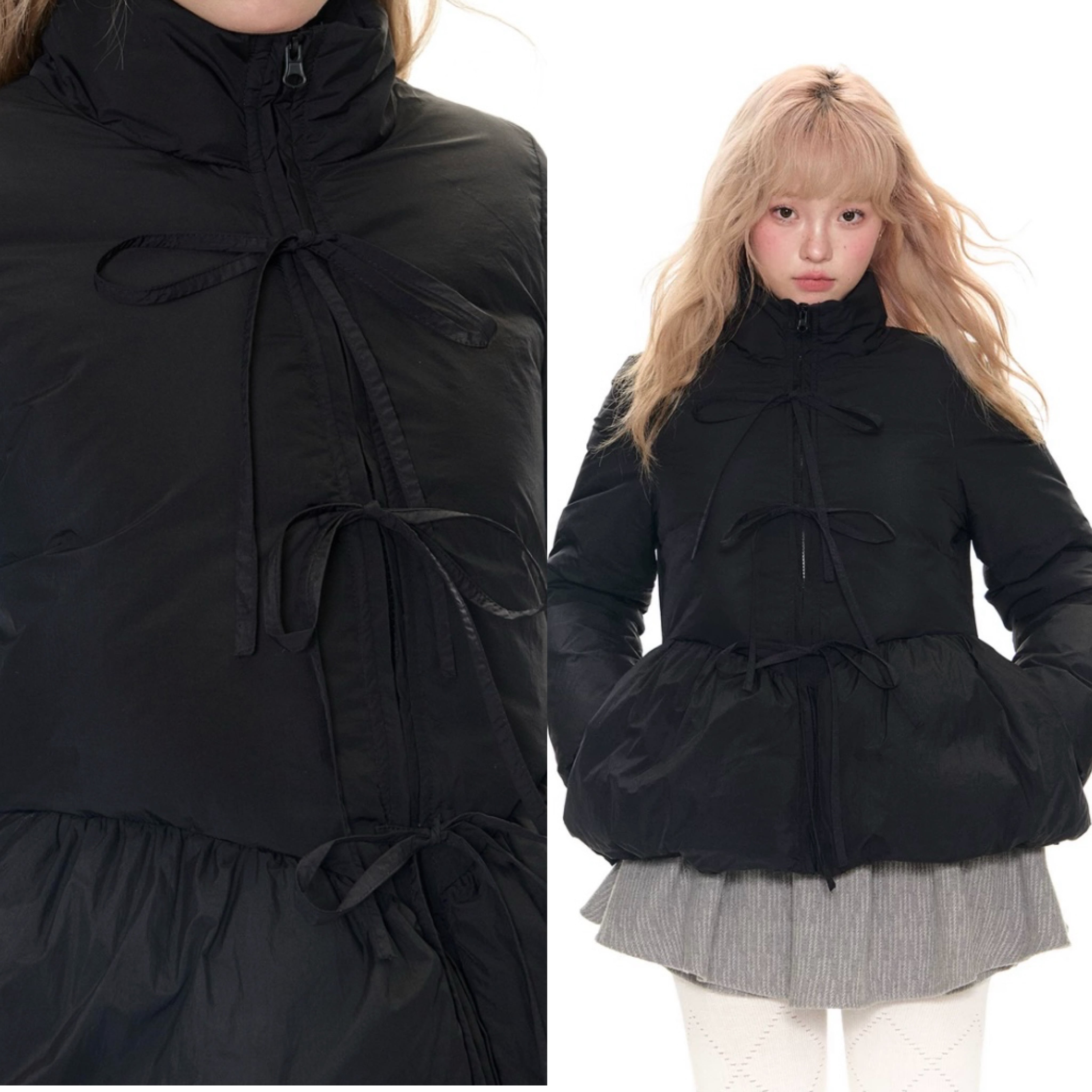 黒 リボン、ブラック、ハイネック ジャケット、ダウン、コート、アウター、カーディガン、ブルゾン、トップス、かわいい リボン、原宿、シンプル