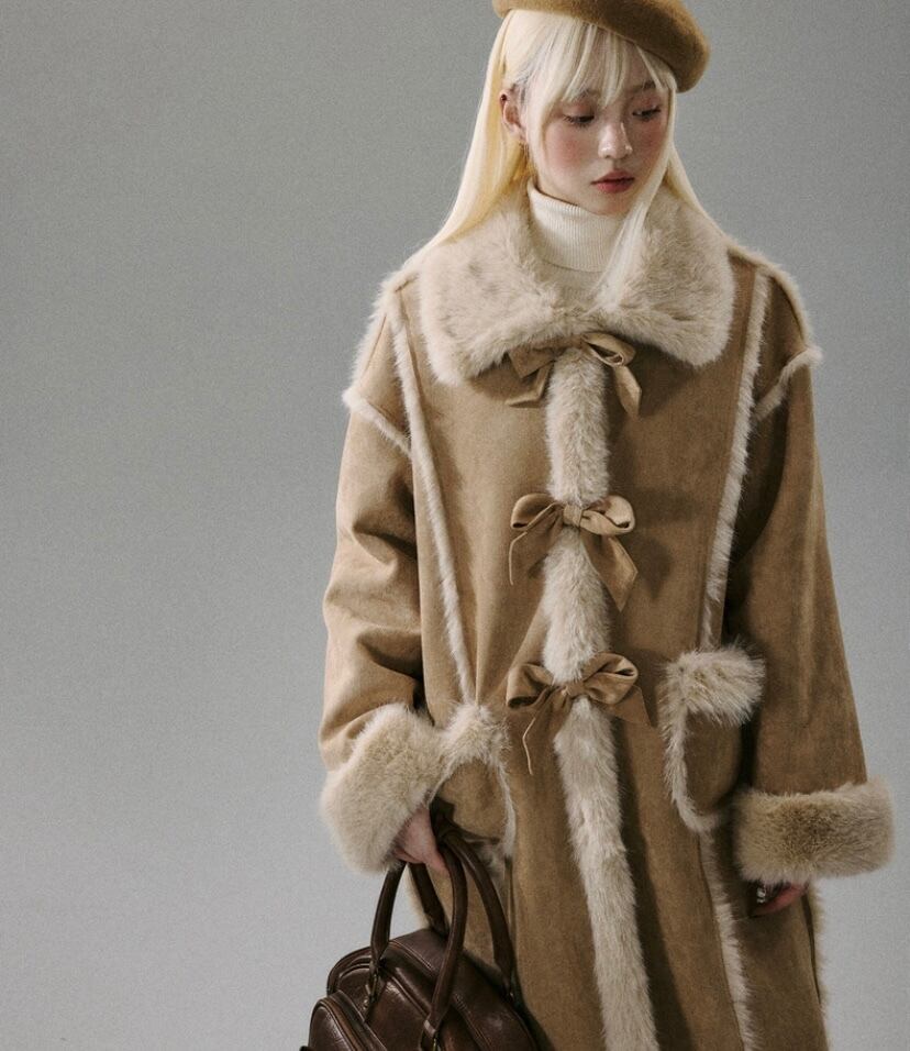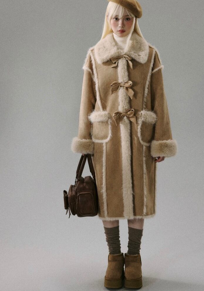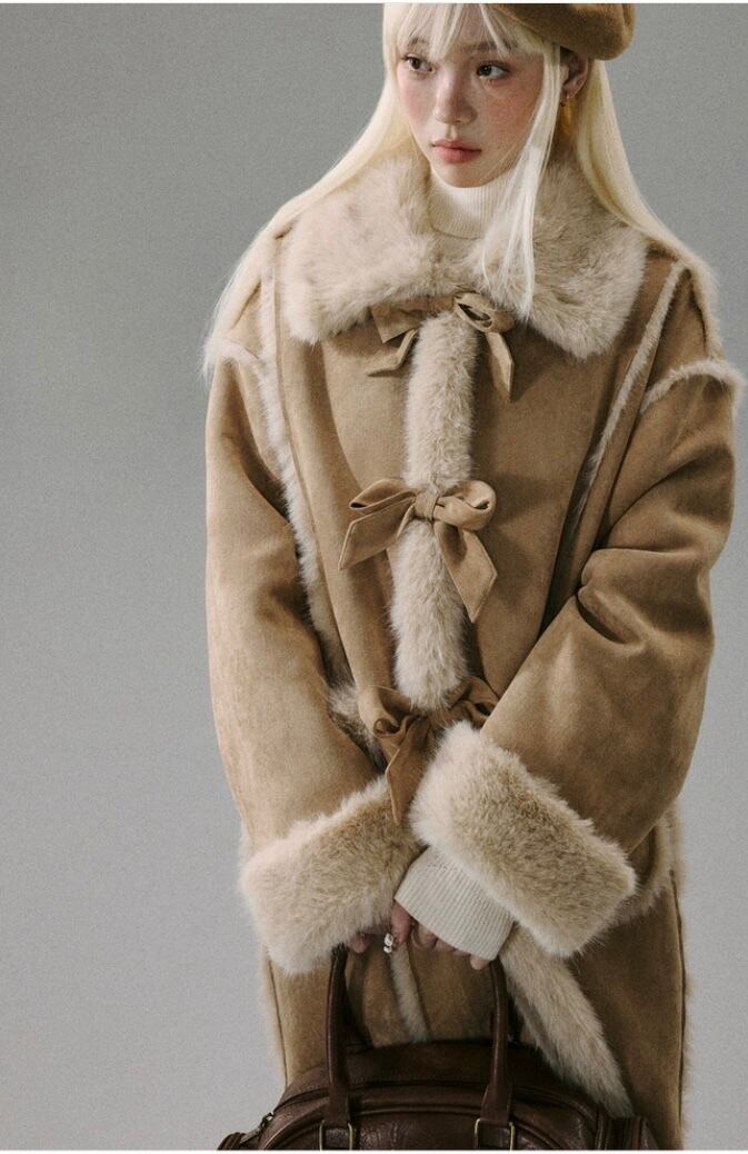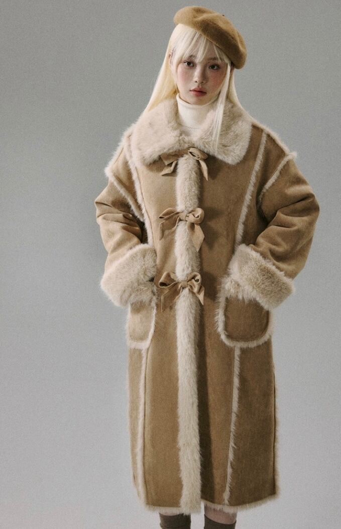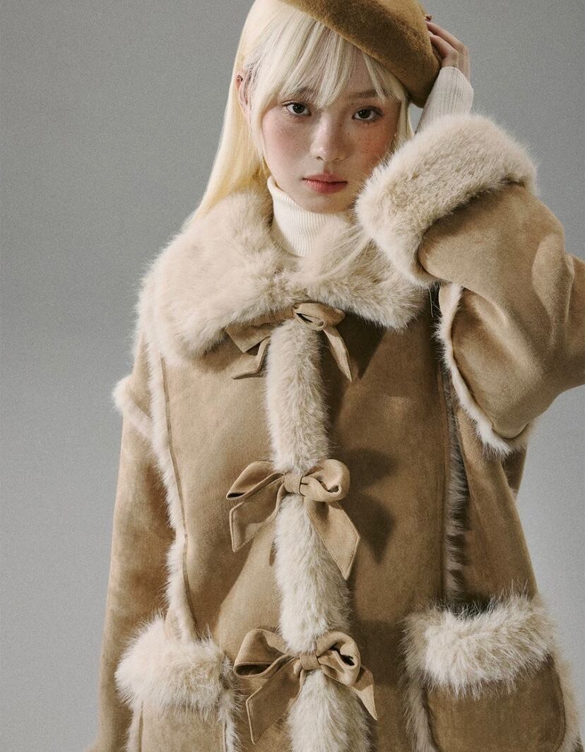 茶色 ファー レザー風 リボン ムートン ジャケット コート ポケット アウター 可愛い 原宿 お嬢様 エレガント ブラウン ポケット 丸襟 フード
