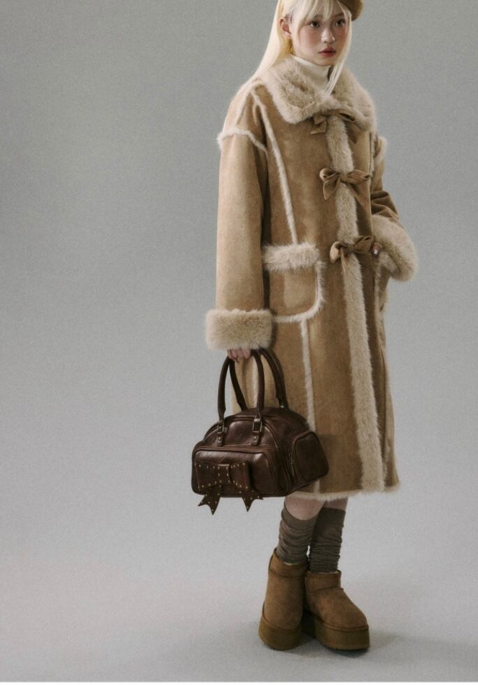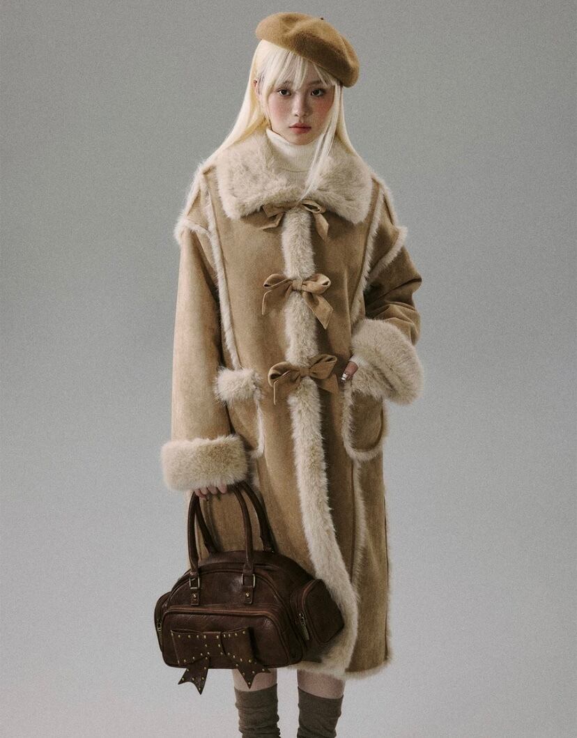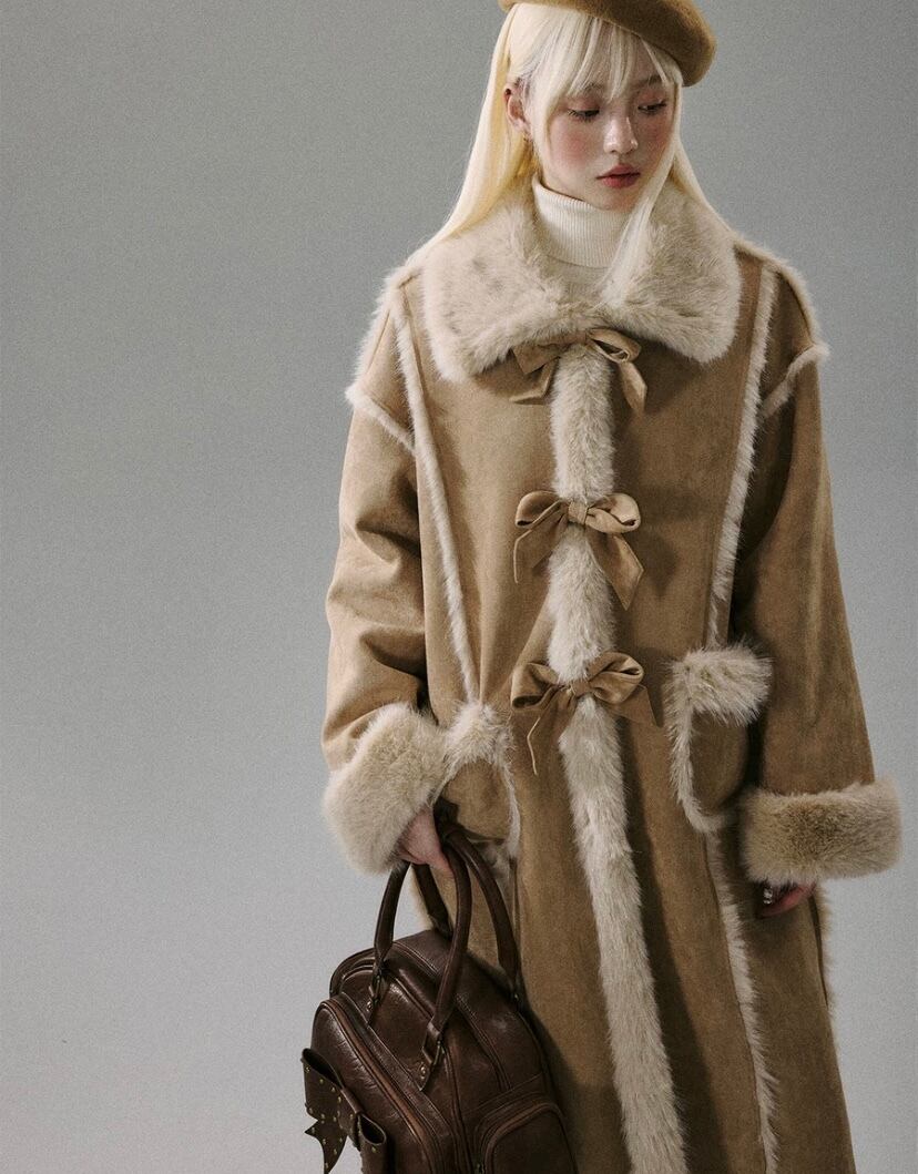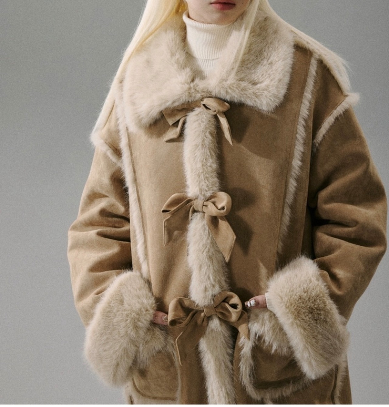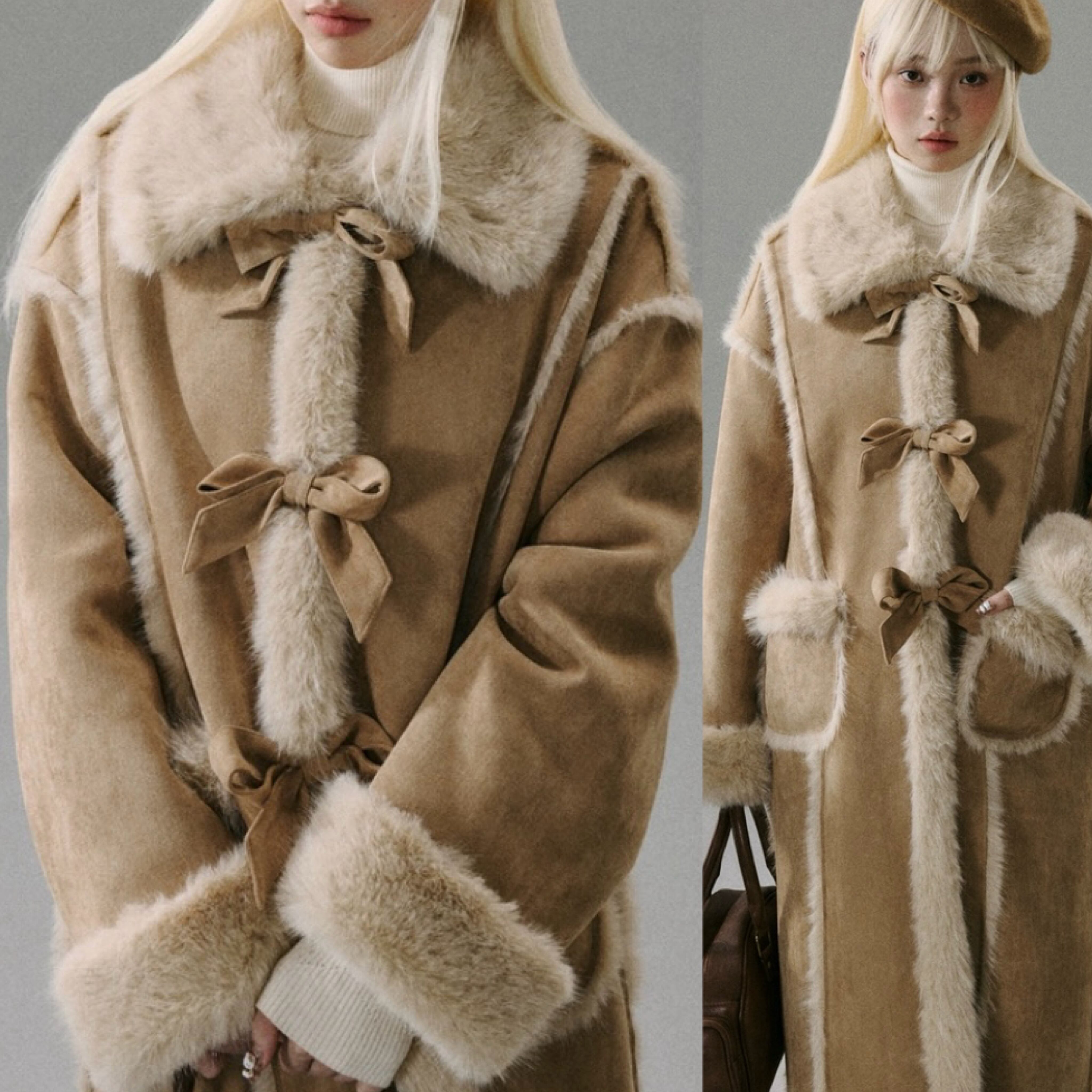 茶色 ファー レザー風 リボン ムートン ジャケット コート ポケット アウター 可愛い 原宿 お嬢様 エレガント ブラウン ポケット 丸襟 フード