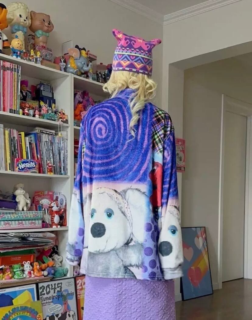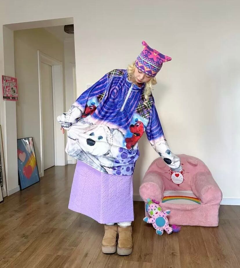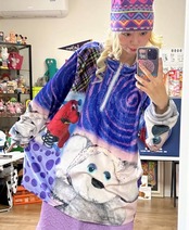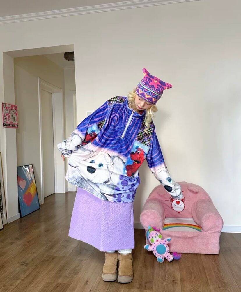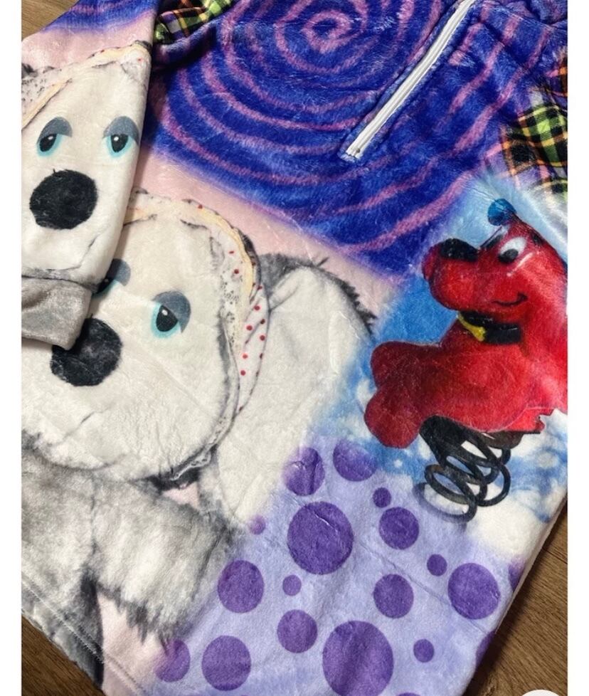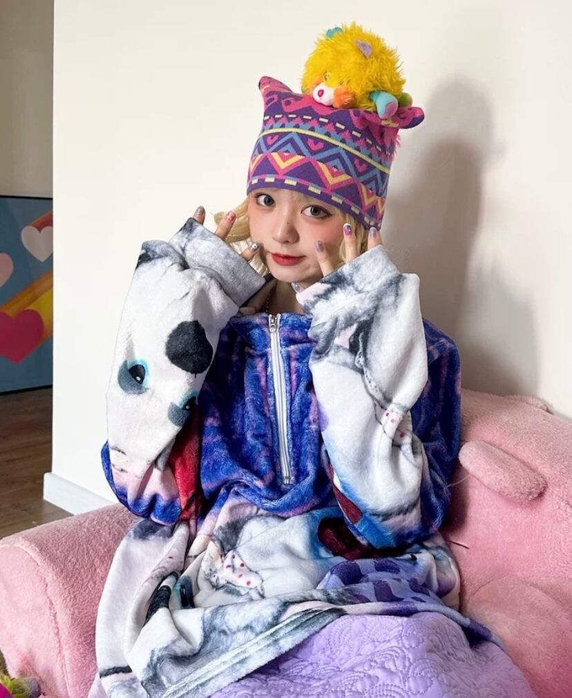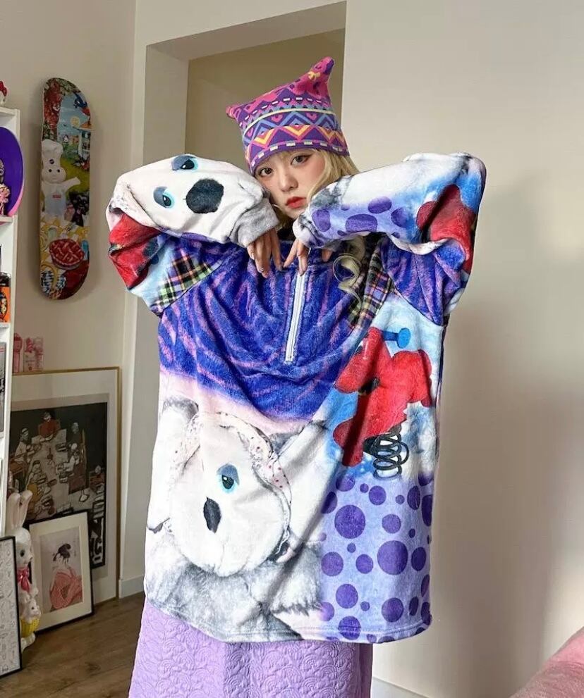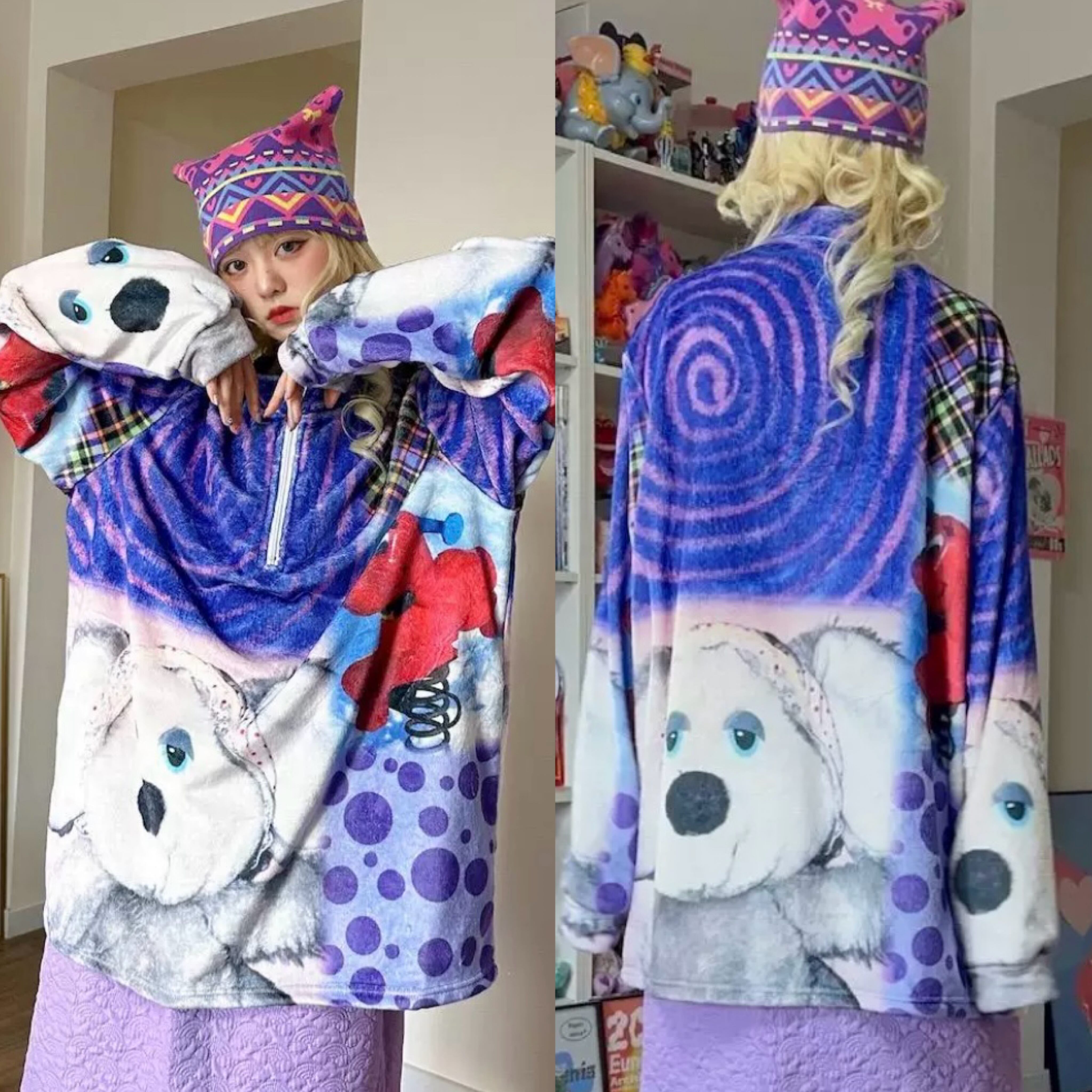 犬 紫 化学模様 アニマル ハーフジップ スウェット トレーナー 原宿 個性的 可愛い ハイネック フリース パーカー スウェット
