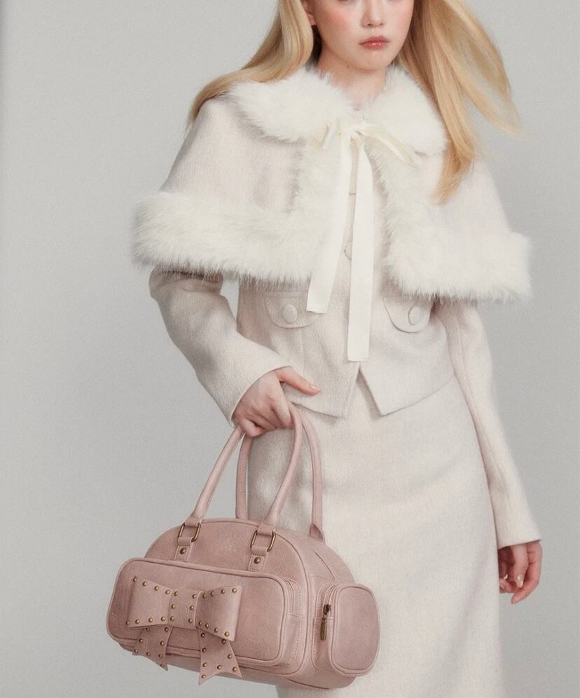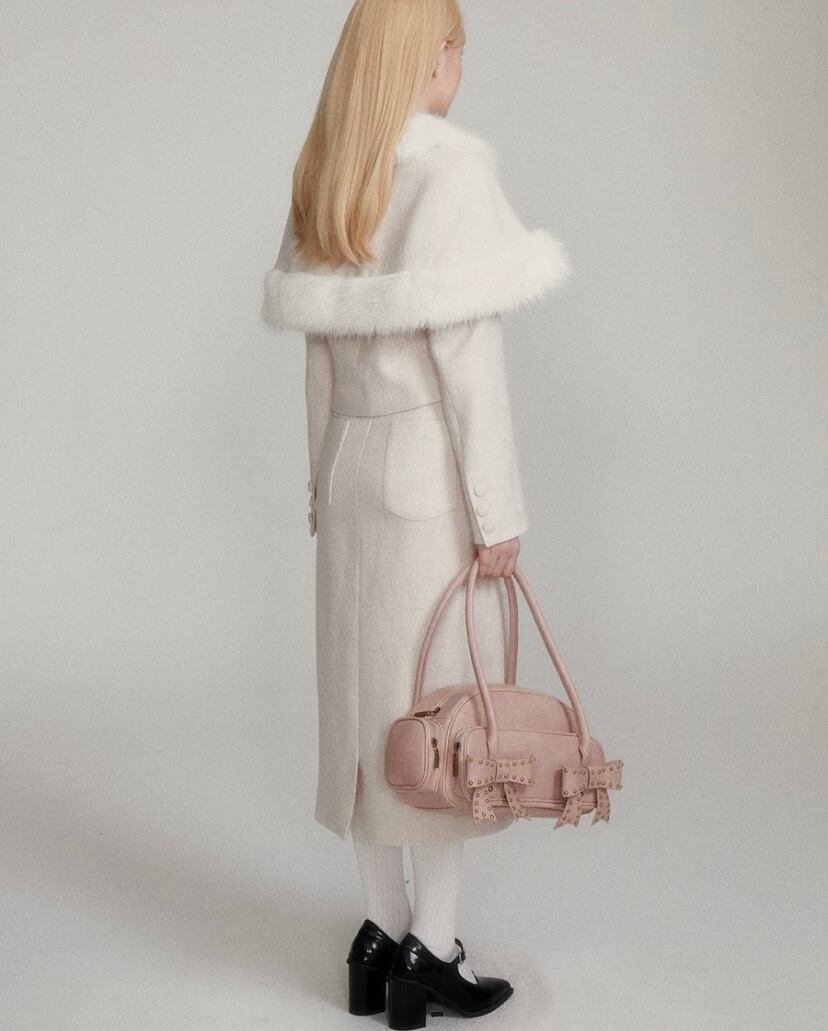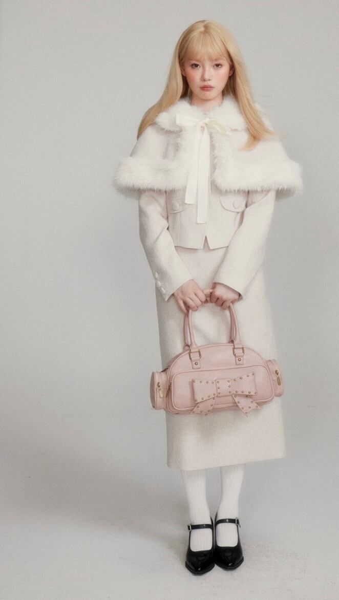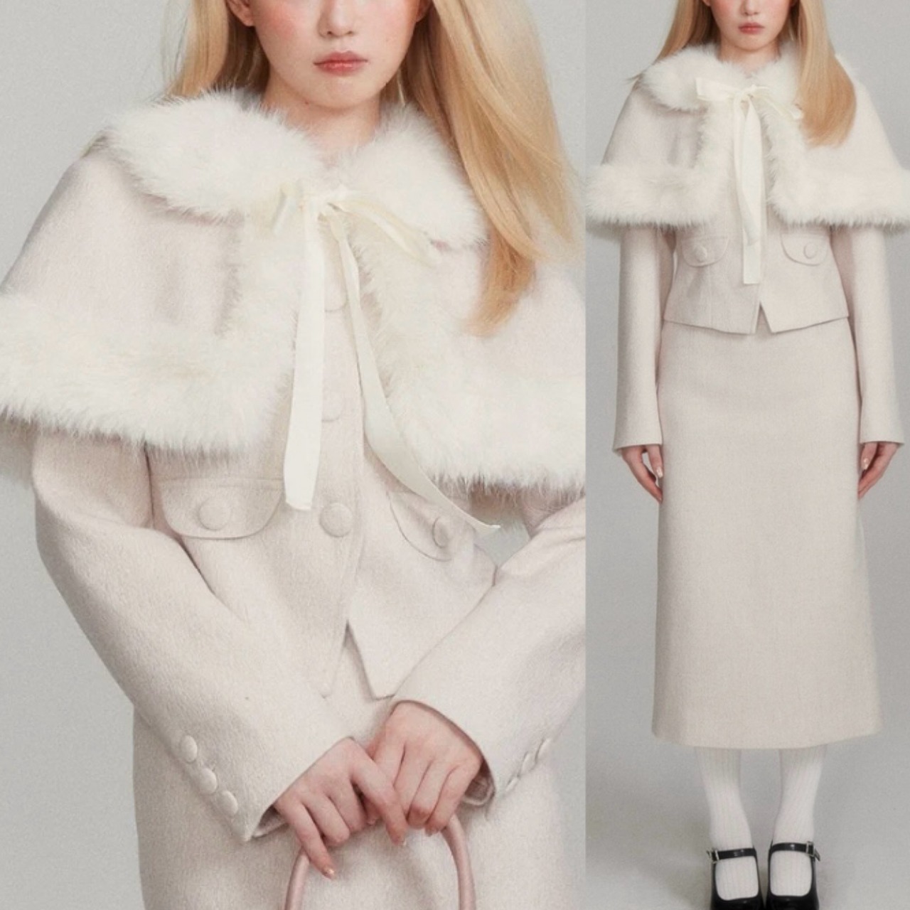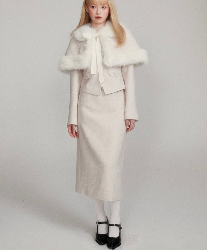 【セットアップ】ホワイト 白 お嬢様 リボン ファー スカート スーツ ツーピースピー ポンチョ コート かわいい 原宿 お嬢様 エレガント