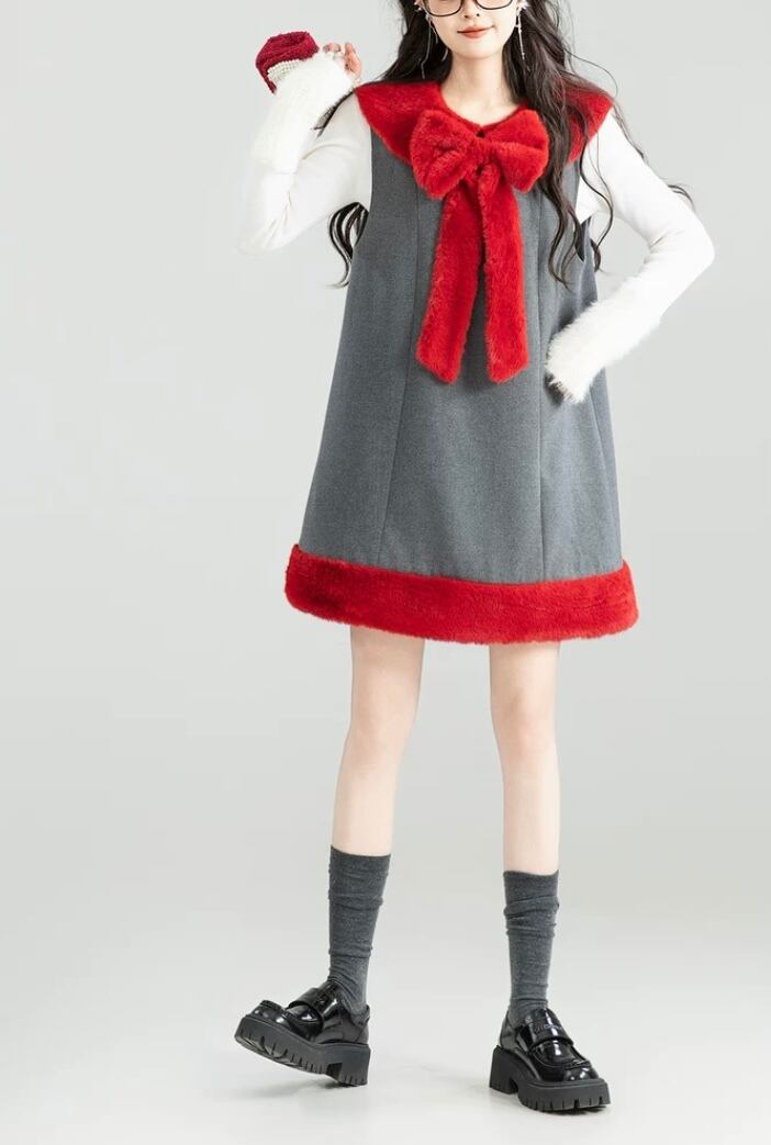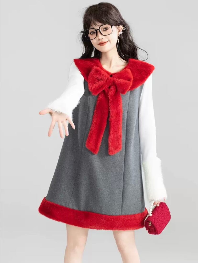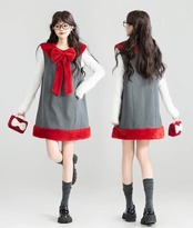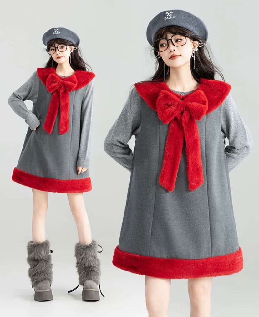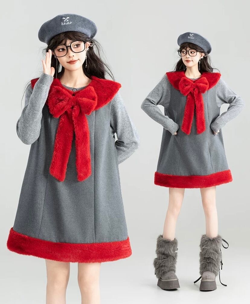 赤 リボン グレー ワンピース 原宿 可愛い XL えり ガーリー チュニック ミニス ワンピース
