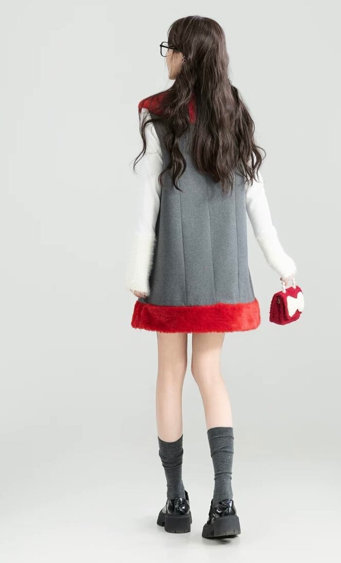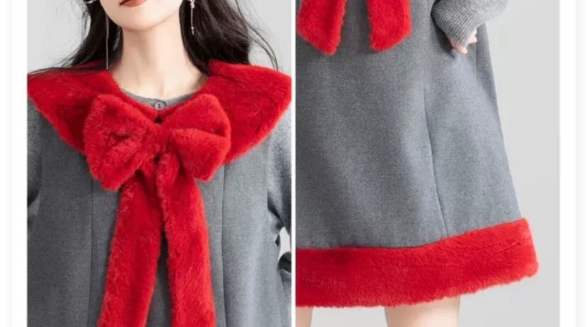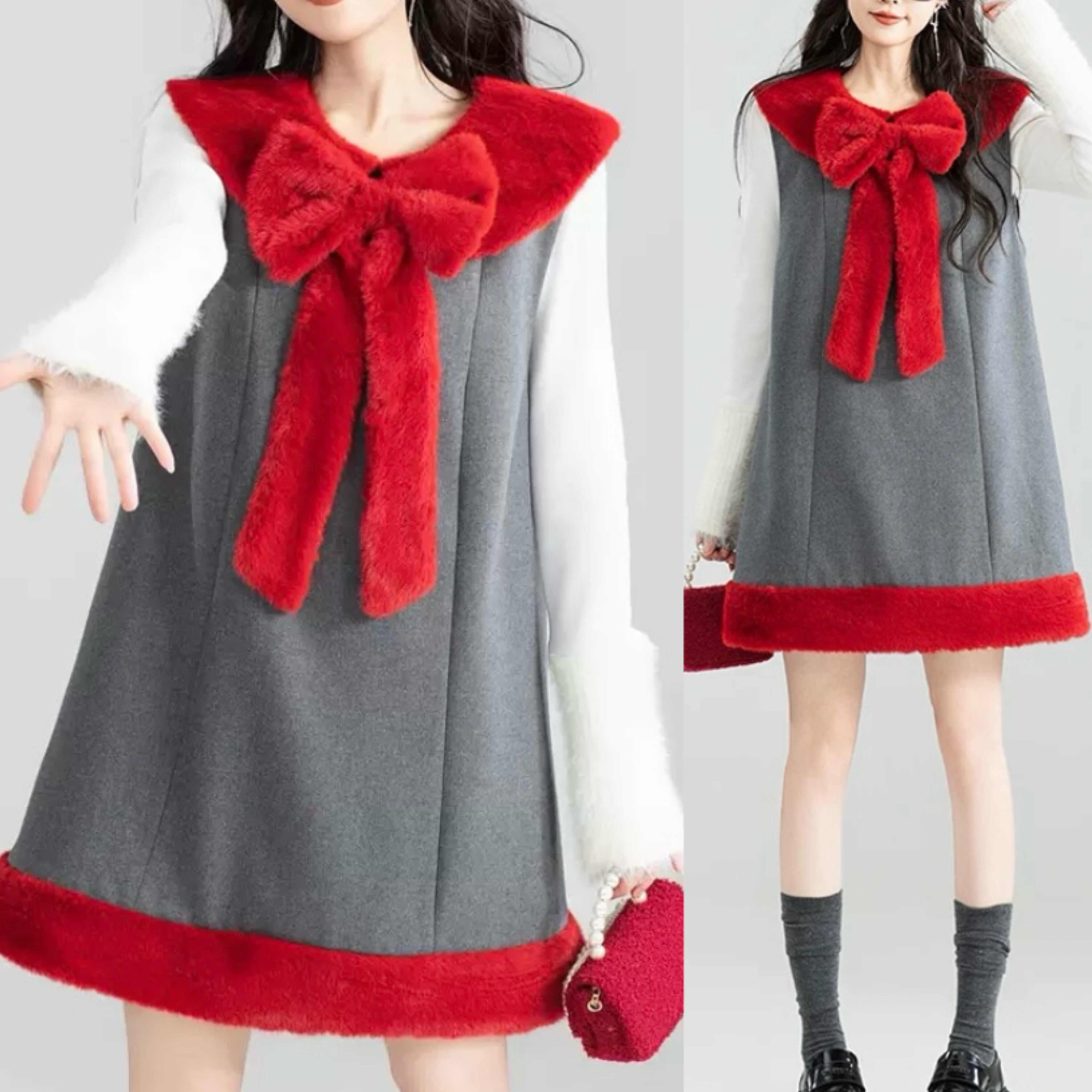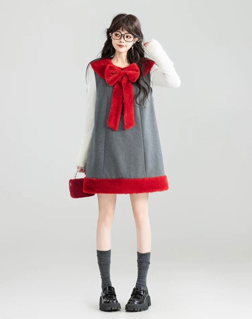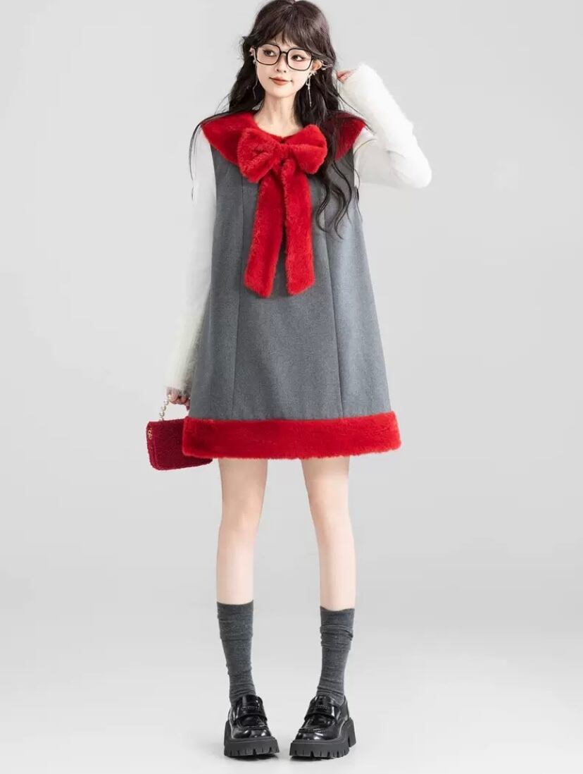赤 リボン グレー ワンピース 原宿 可愛い XL えり ガーリー チュニック ミニス ワンピース