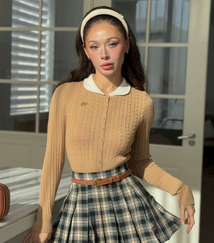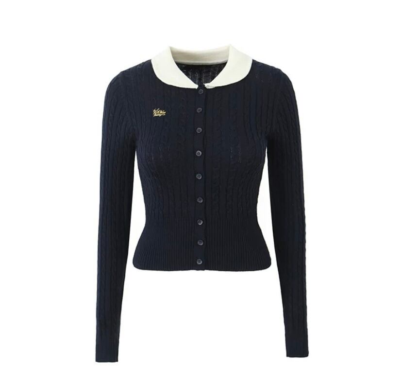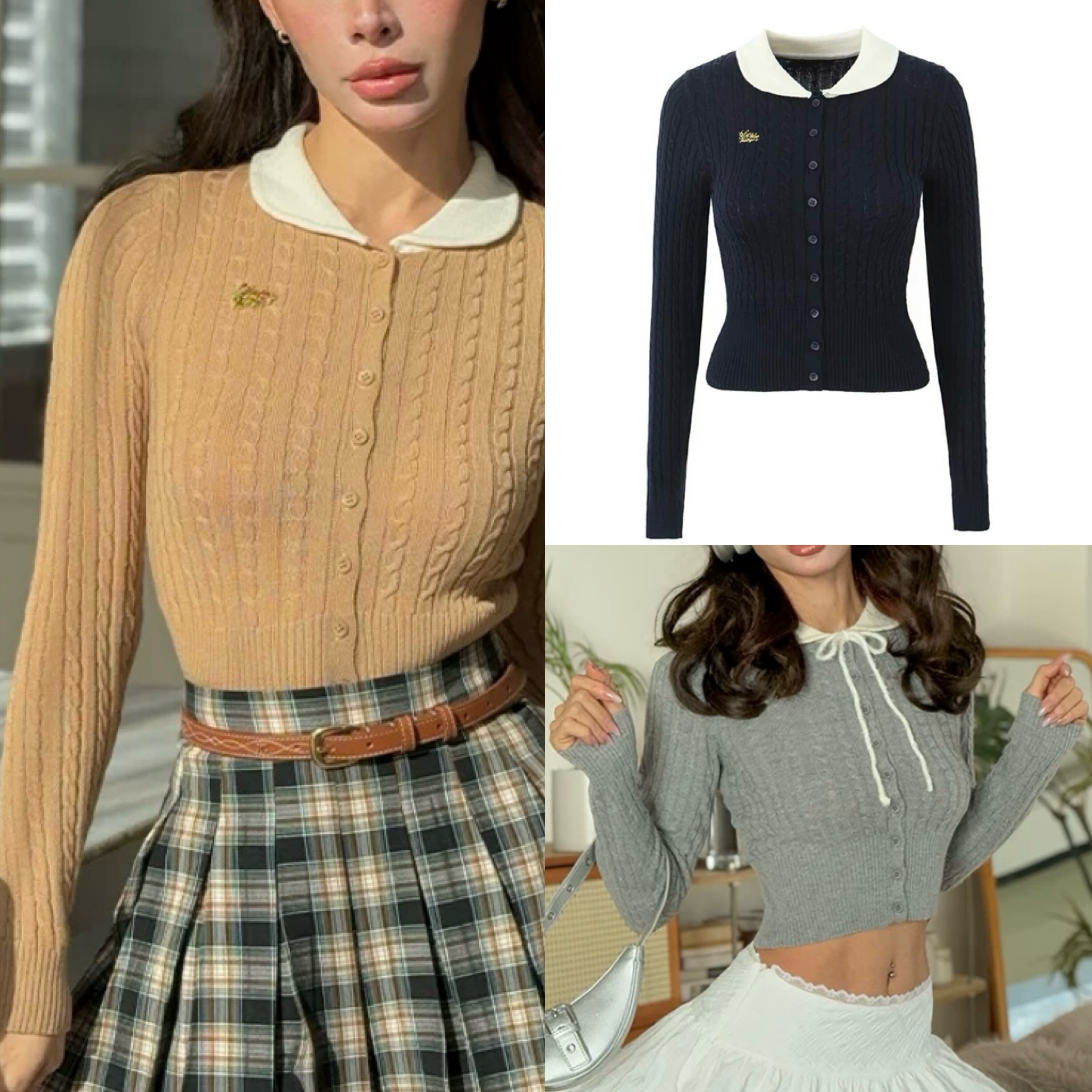 カーディガン 丸襟 グレ ベージュ ネイビー トップス セーター アウター スクール ニット ブラウス カジュアル ショート ギャル