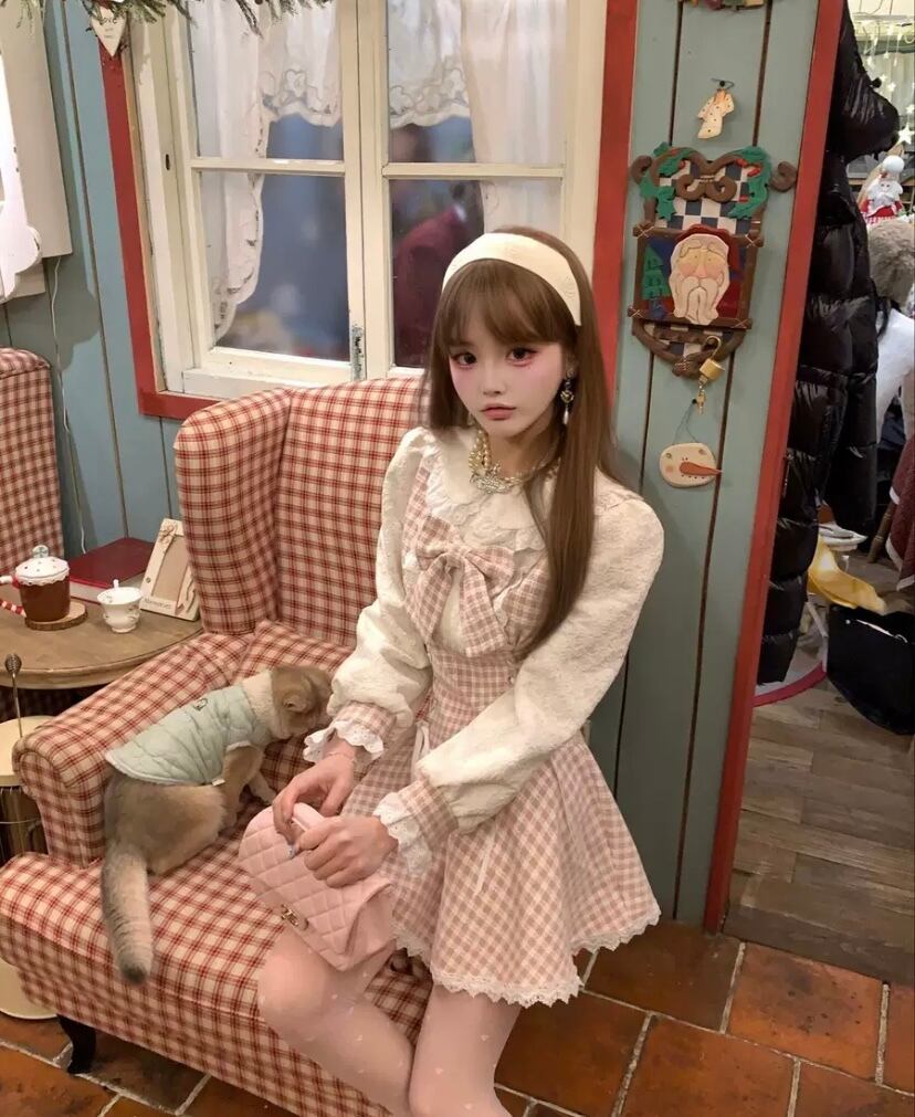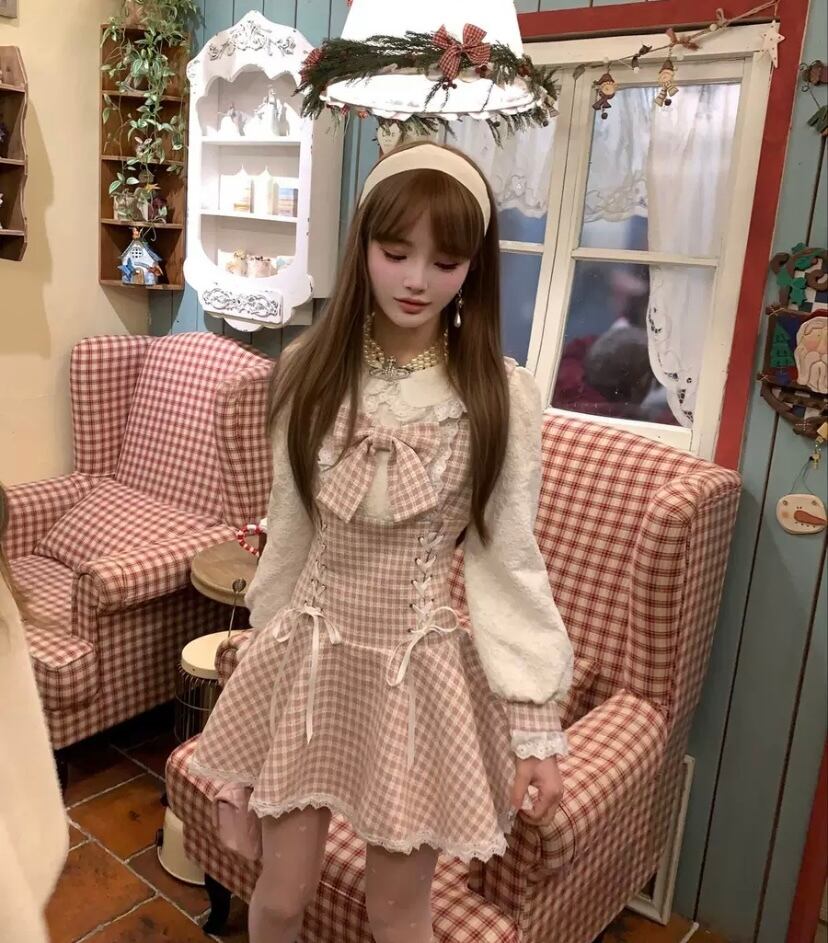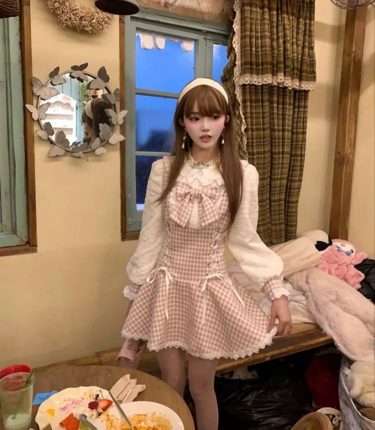 姫 ピンク チェック ブラウス リボン ワンピース ロリータ 原宿 かわいい ガーリー