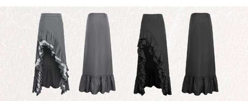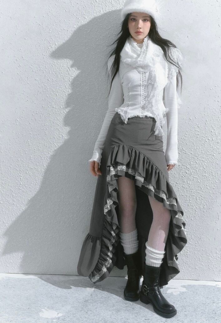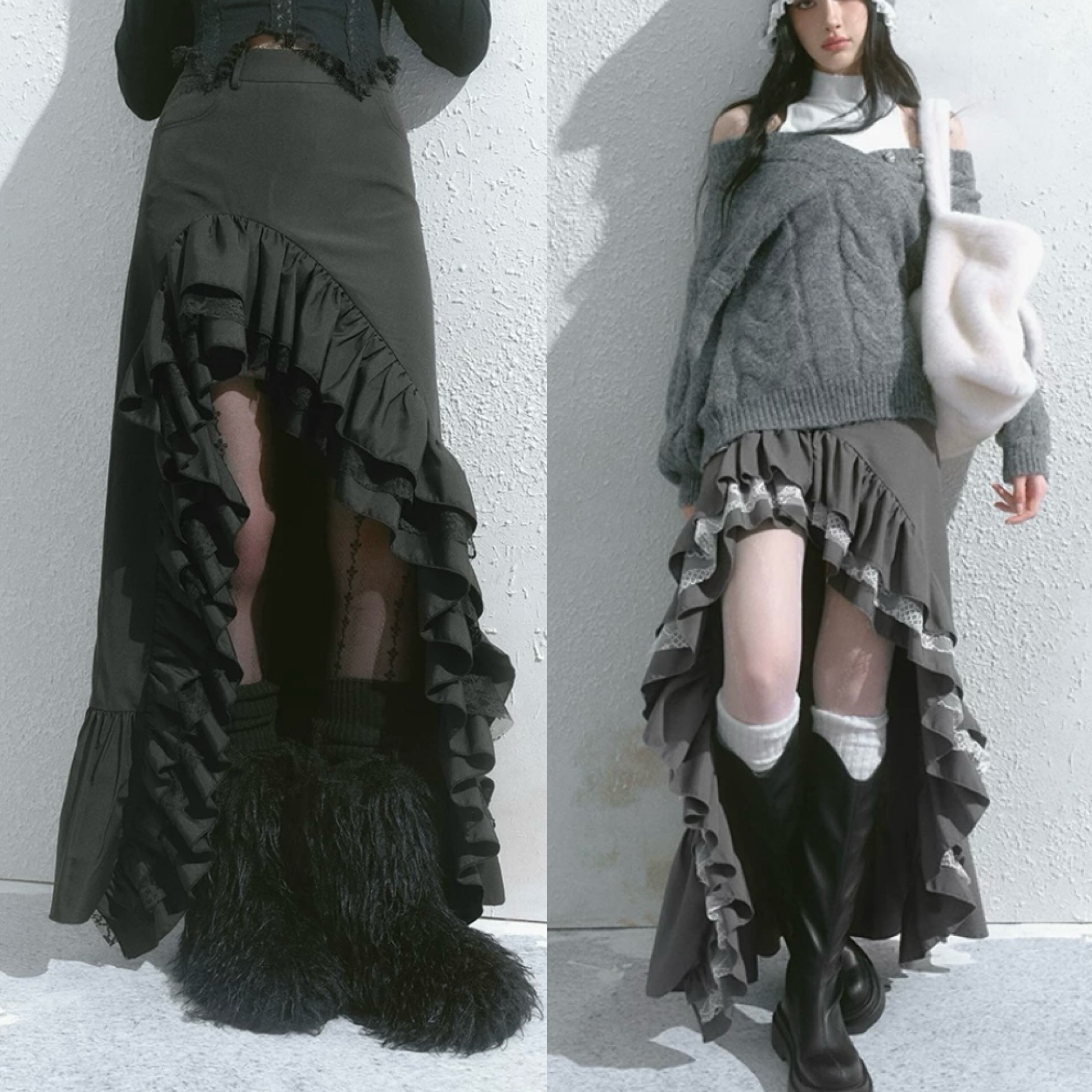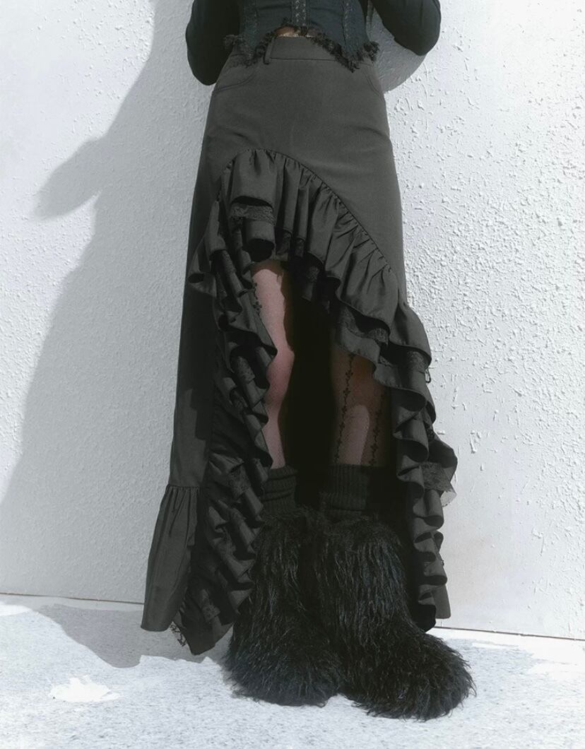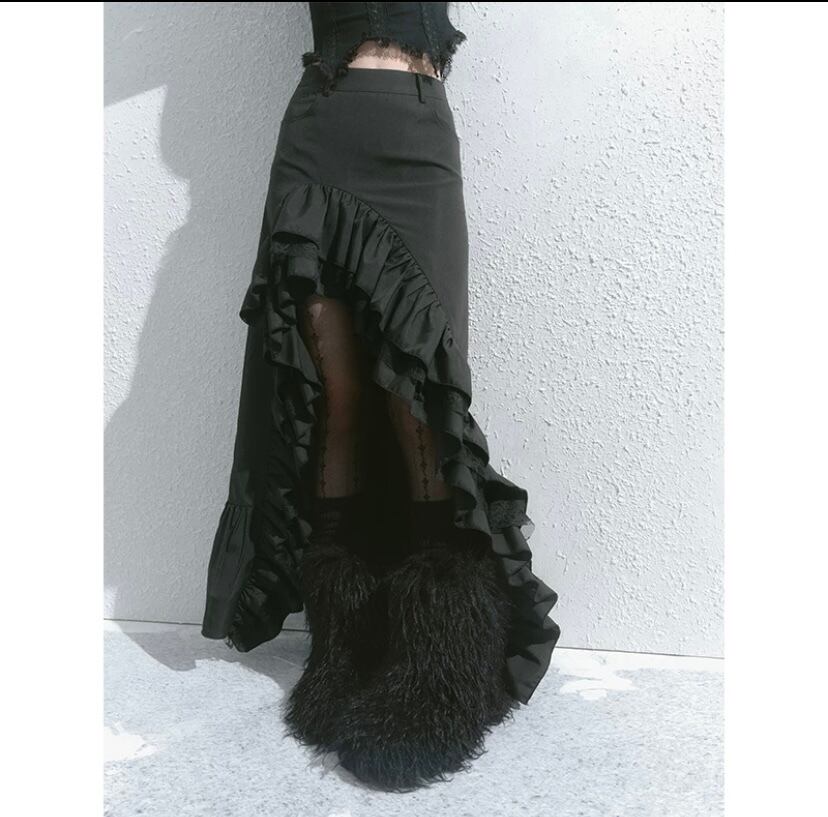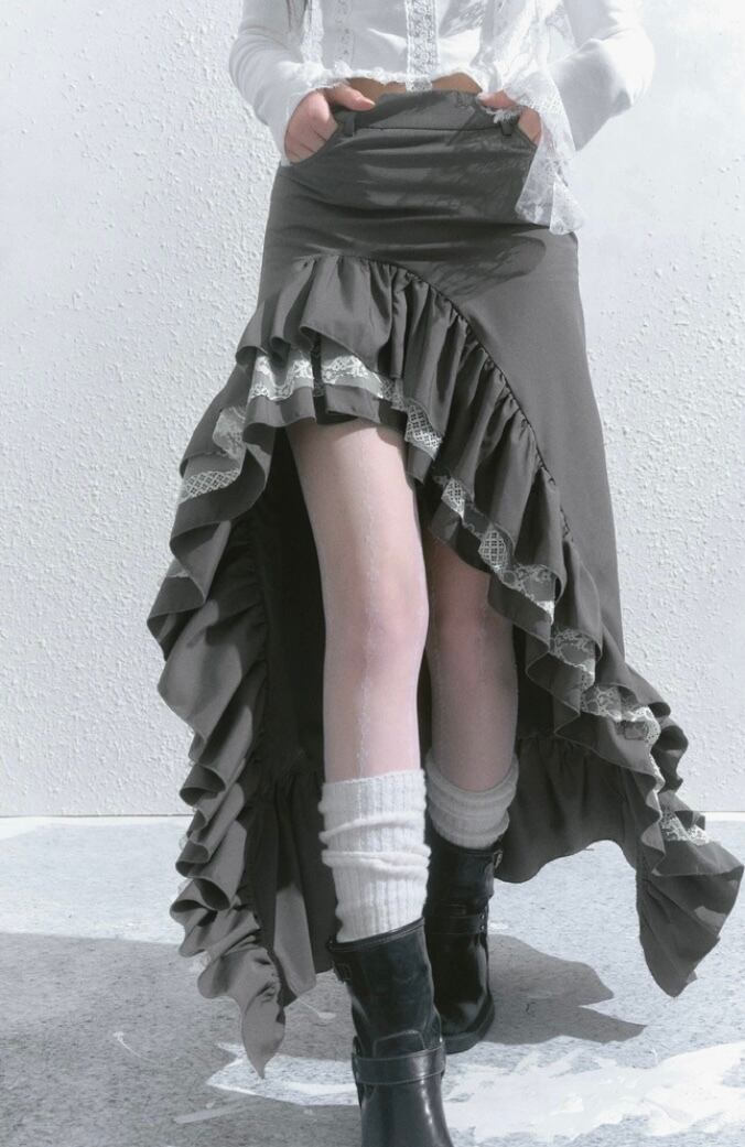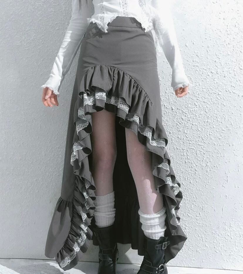 スカート グレー 黒 ボトムス アシンメトリー フリル スリット ロング マキシ ショート ミニスカート 原宿 可愛い ガーリー
