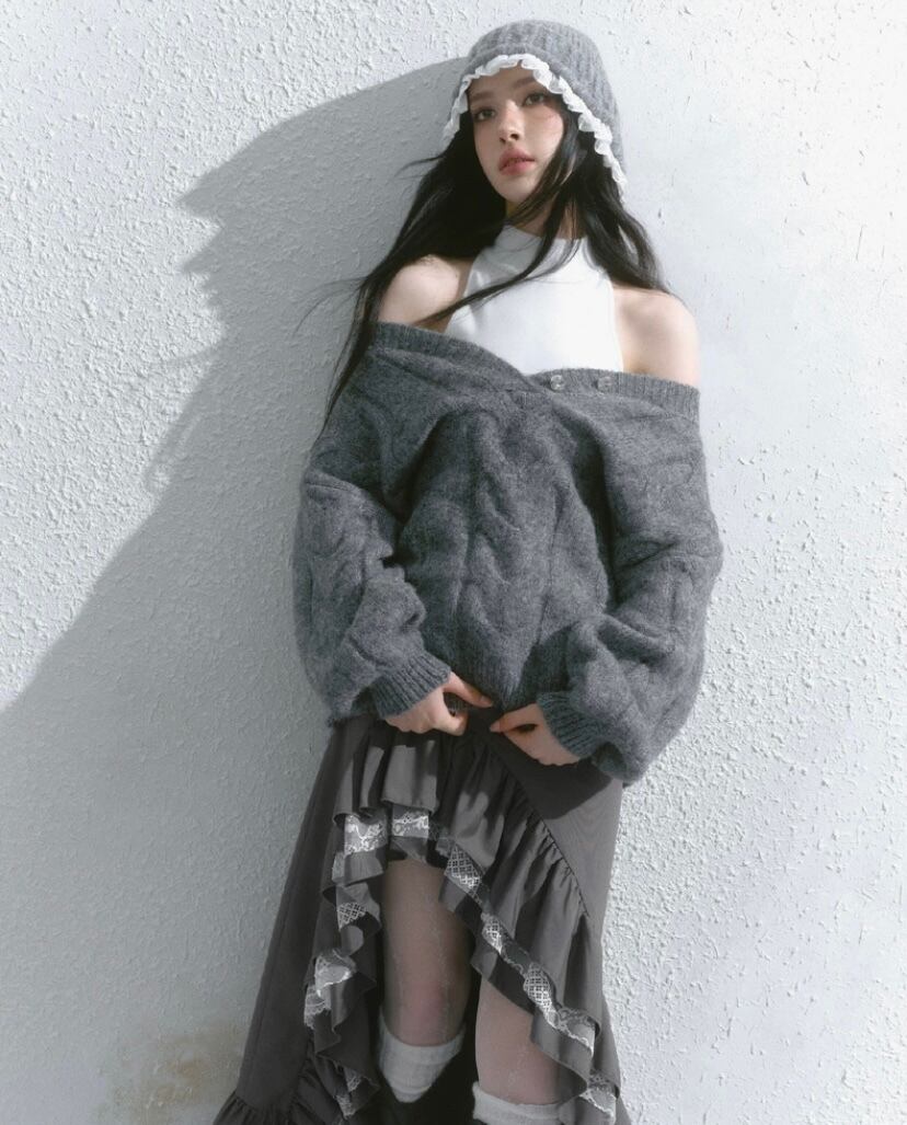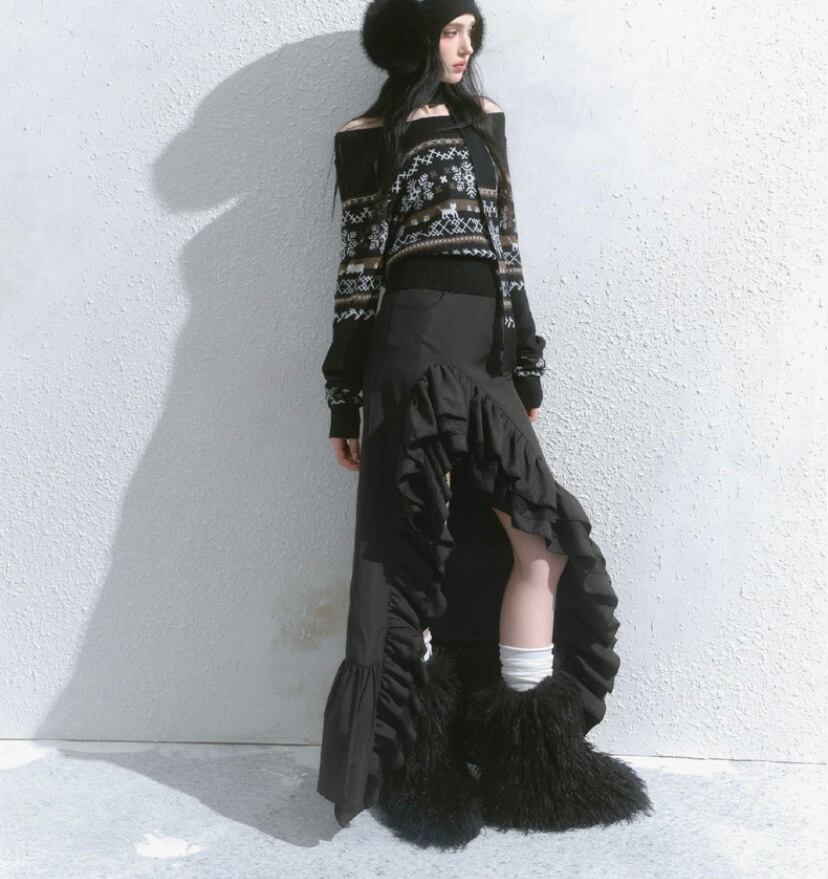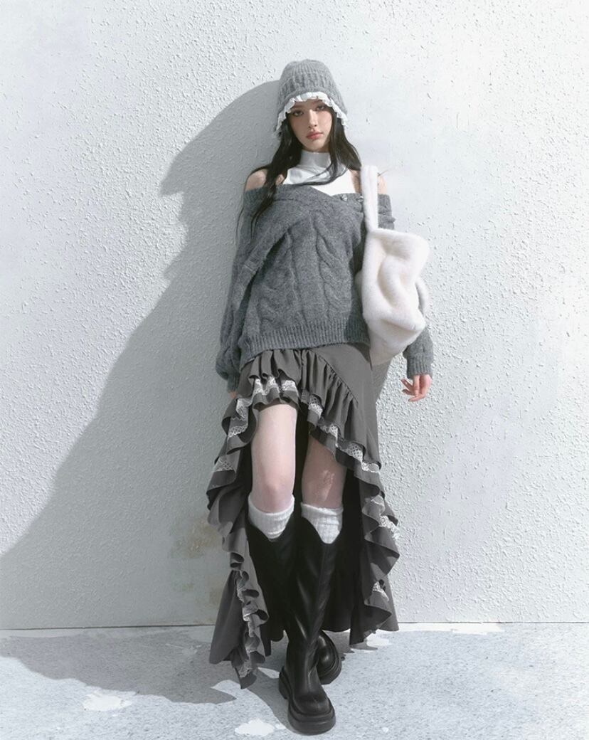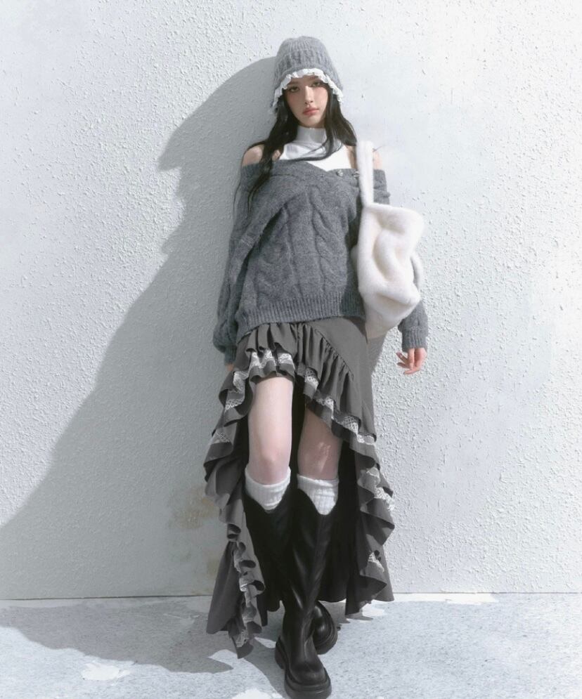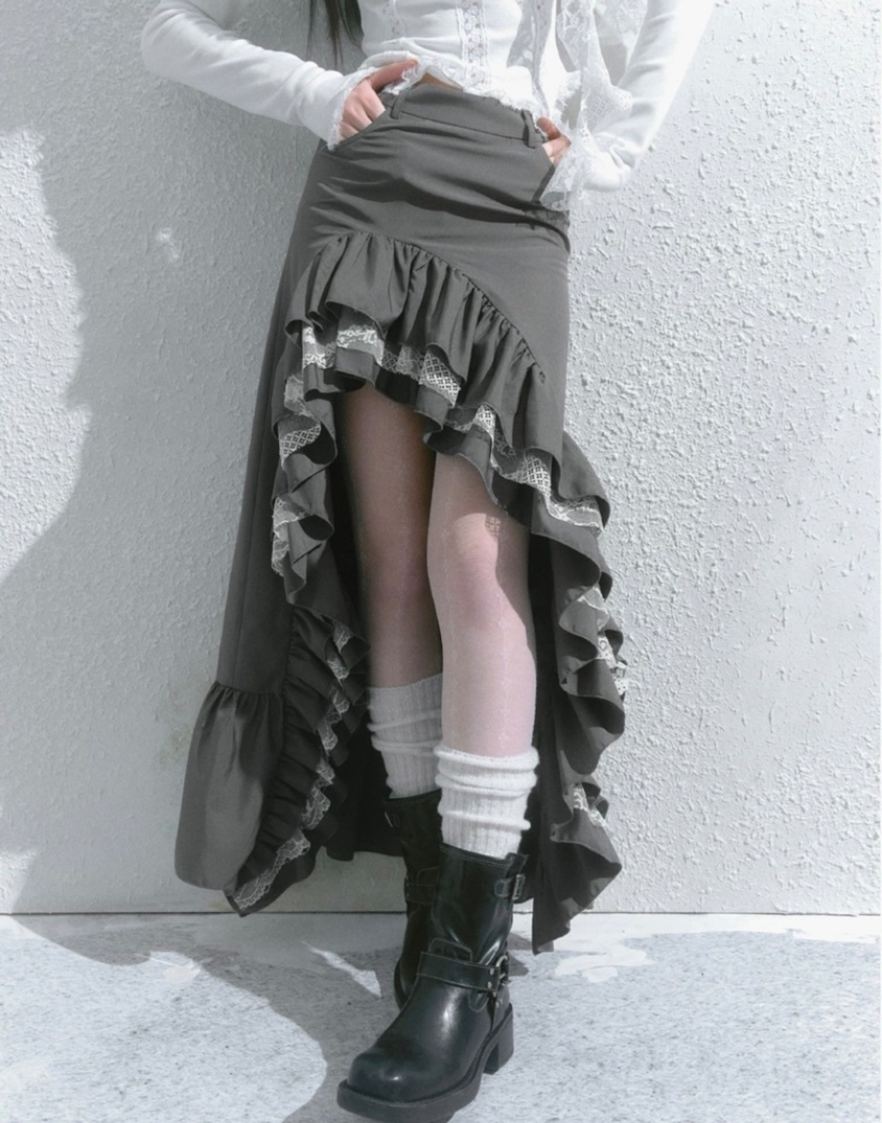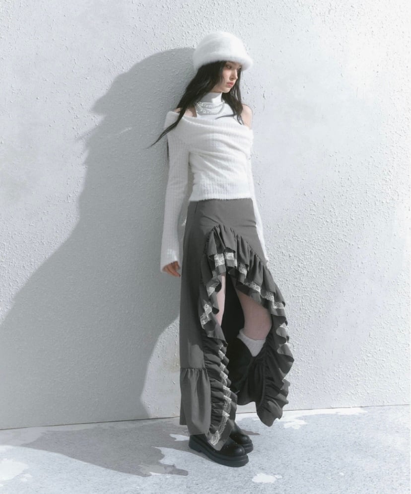 スカート グレー 黒 ボトムス アシンメトリー フリル スリット ロング マキシ ショート ミニスカート 原宿 可愛い ガーリー