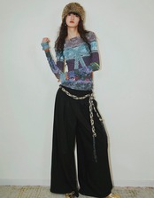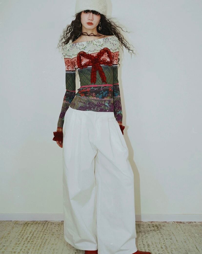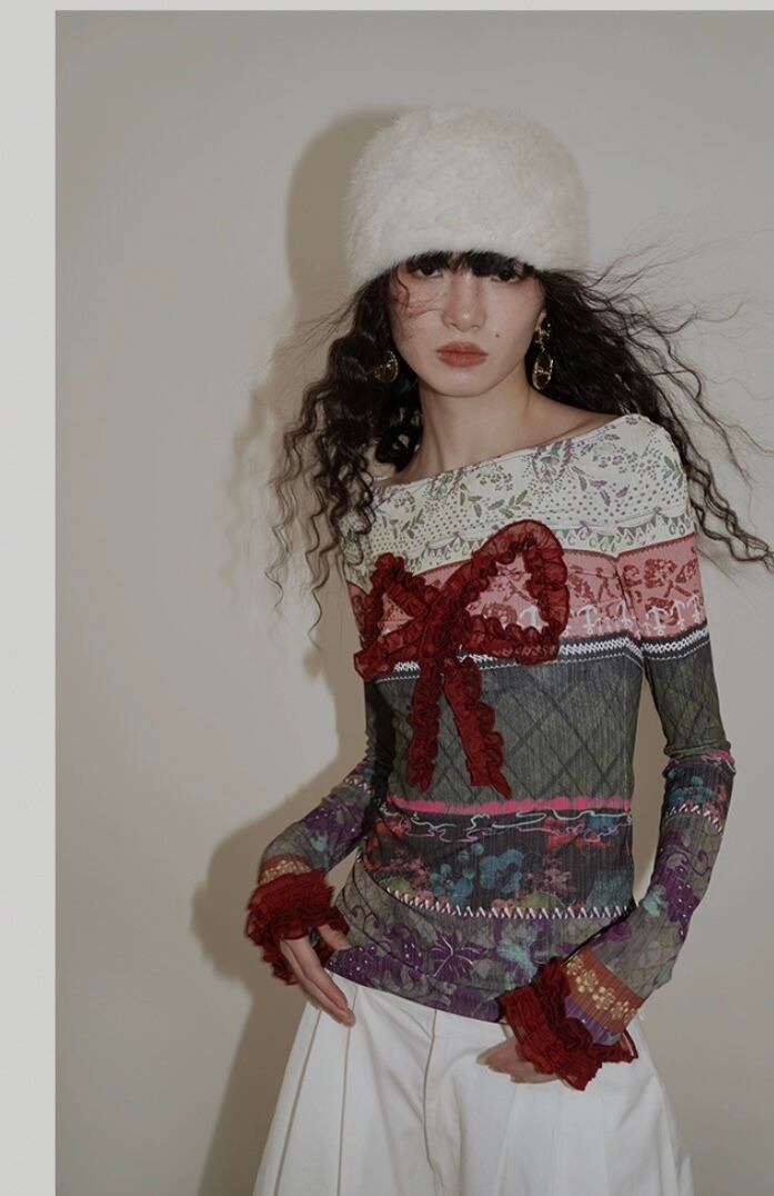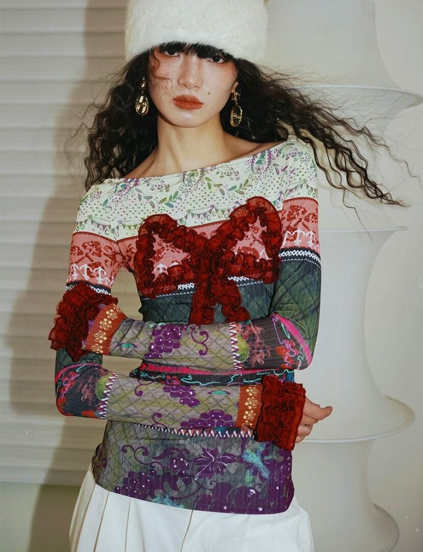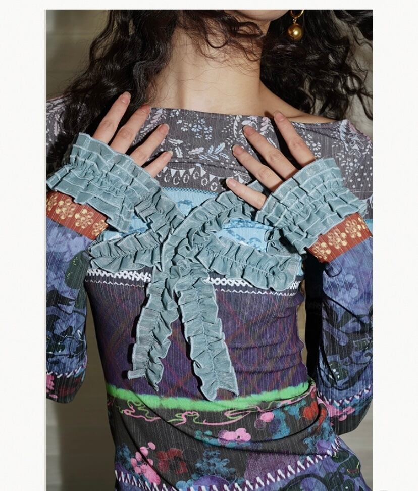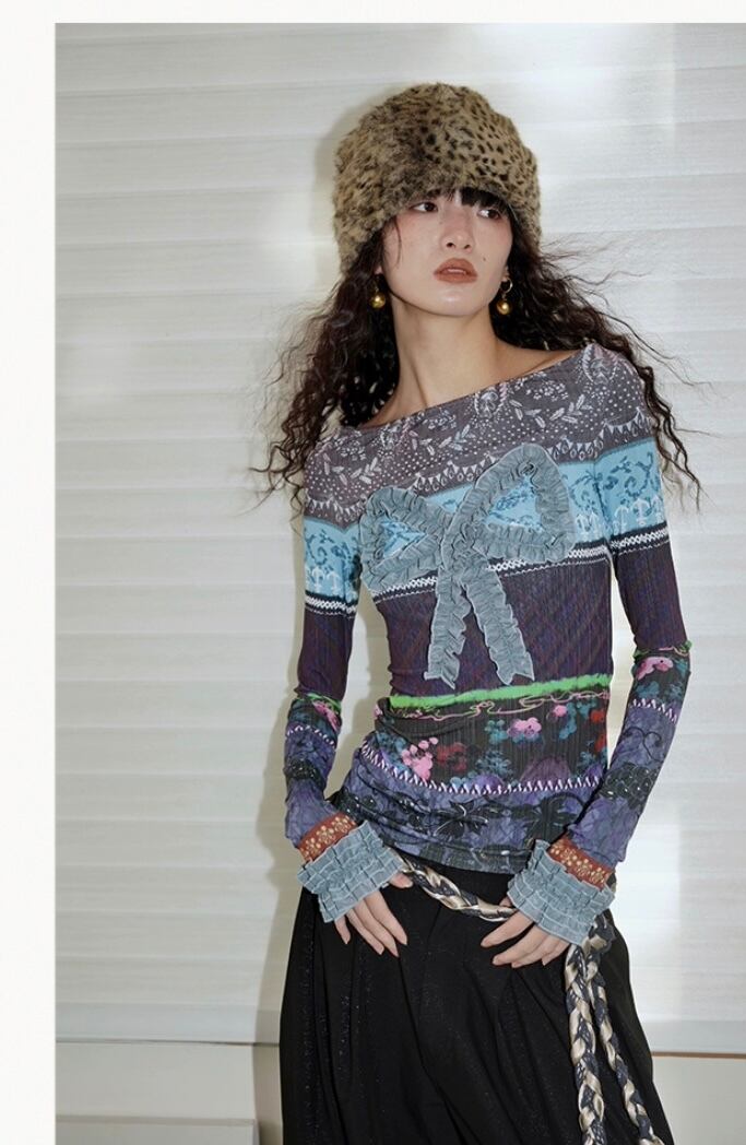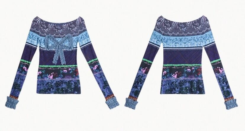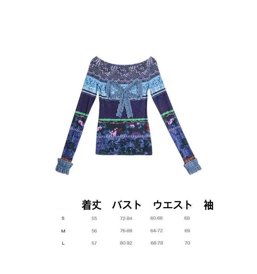 ブラウス Tシャツ トップス 水色 フリル 袖 リボン ボヘミアン パッチワーク ボーダー グラデーション アジア エスニック