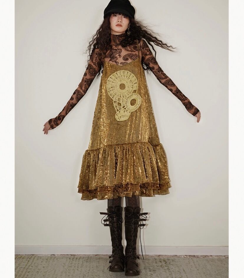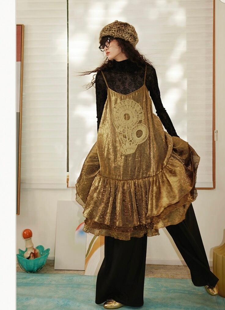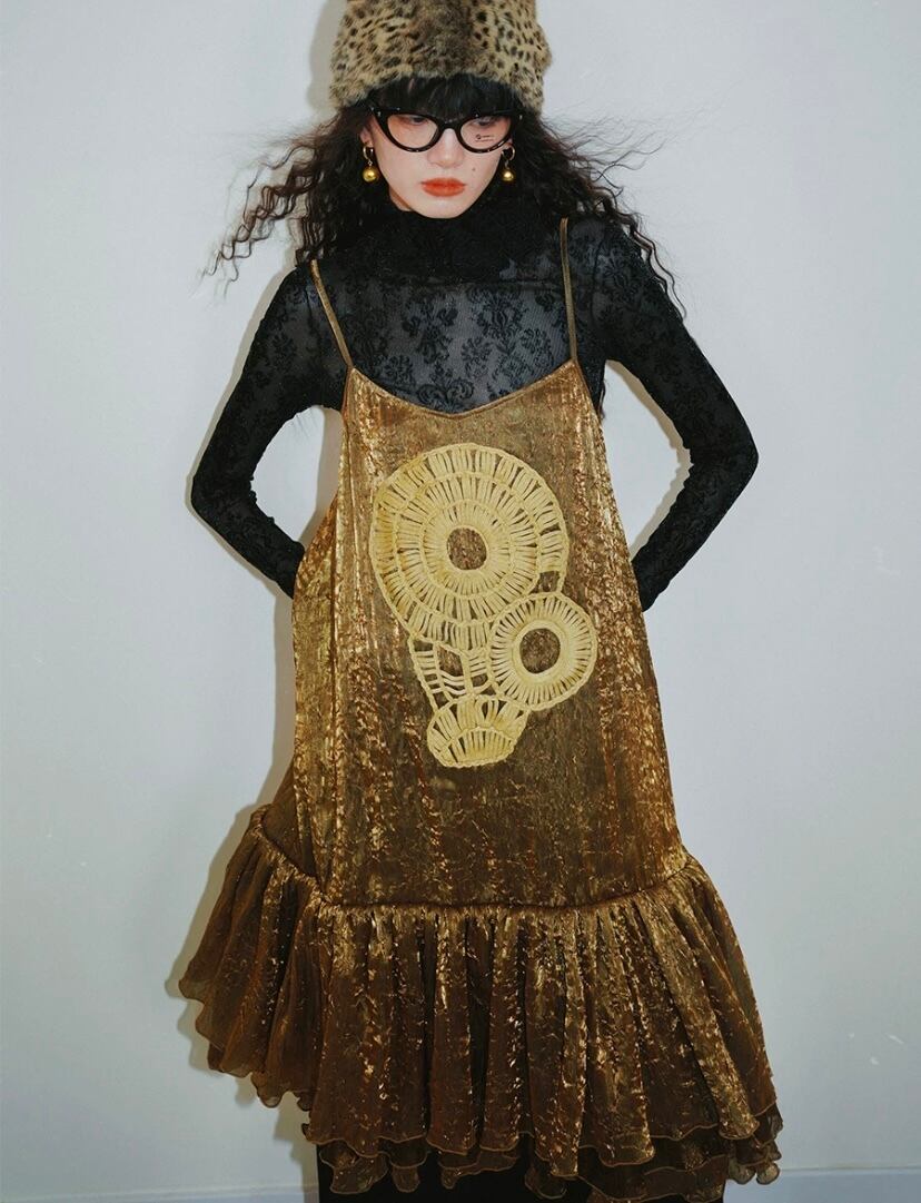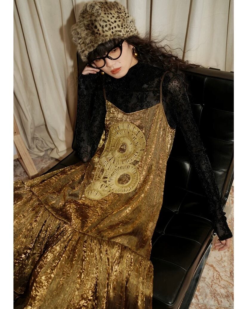 黄色 ゴールド リボン 刺繍 キャミソール ベルベット ワンピース ドレス ゆったり ゴージャス フリル スカート パーティー 原宿 クラシック レトロ