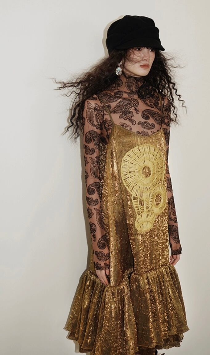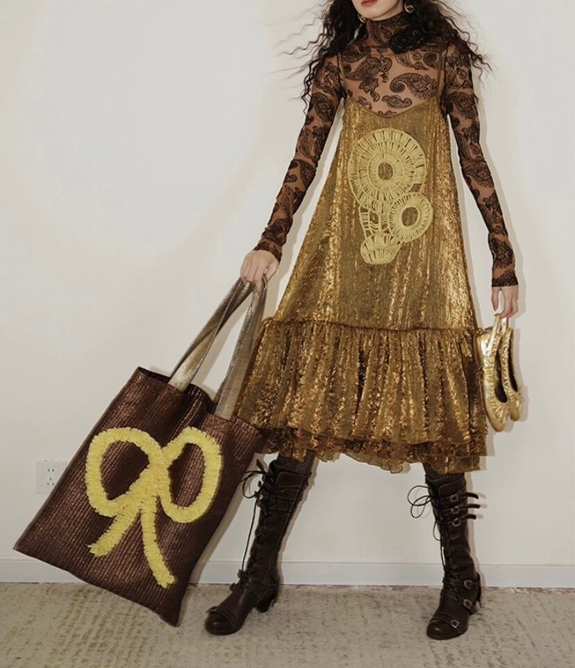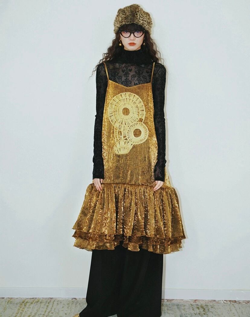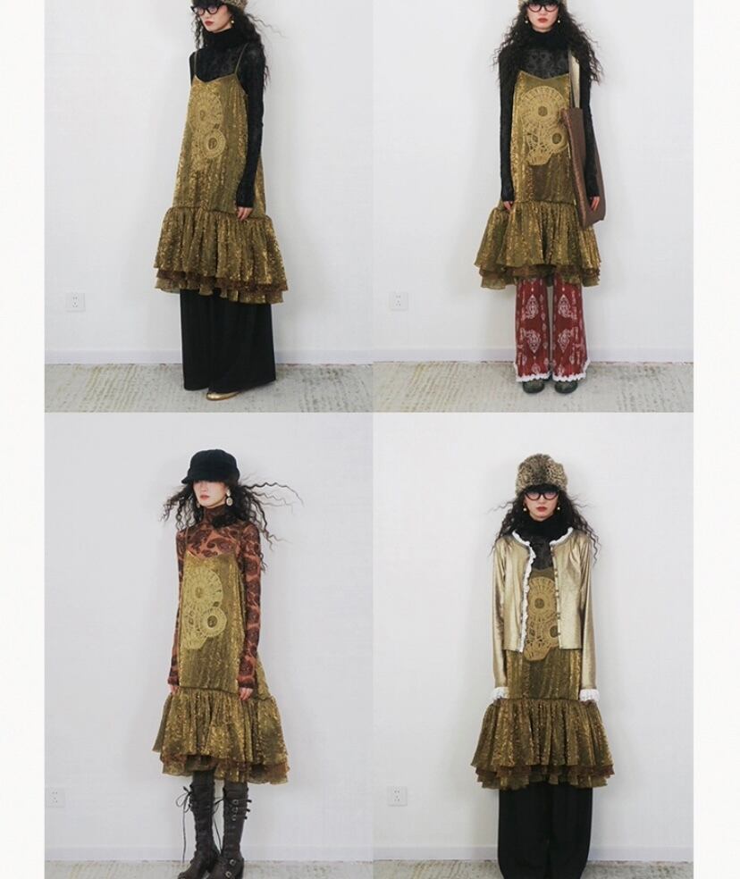 黄色 ゴールド リボン 刺繍 キャミソール ベルベット ワンピース ドレス ゆったり ゴージャス フリル スカート パーティー 原宿 クラシック レトロ