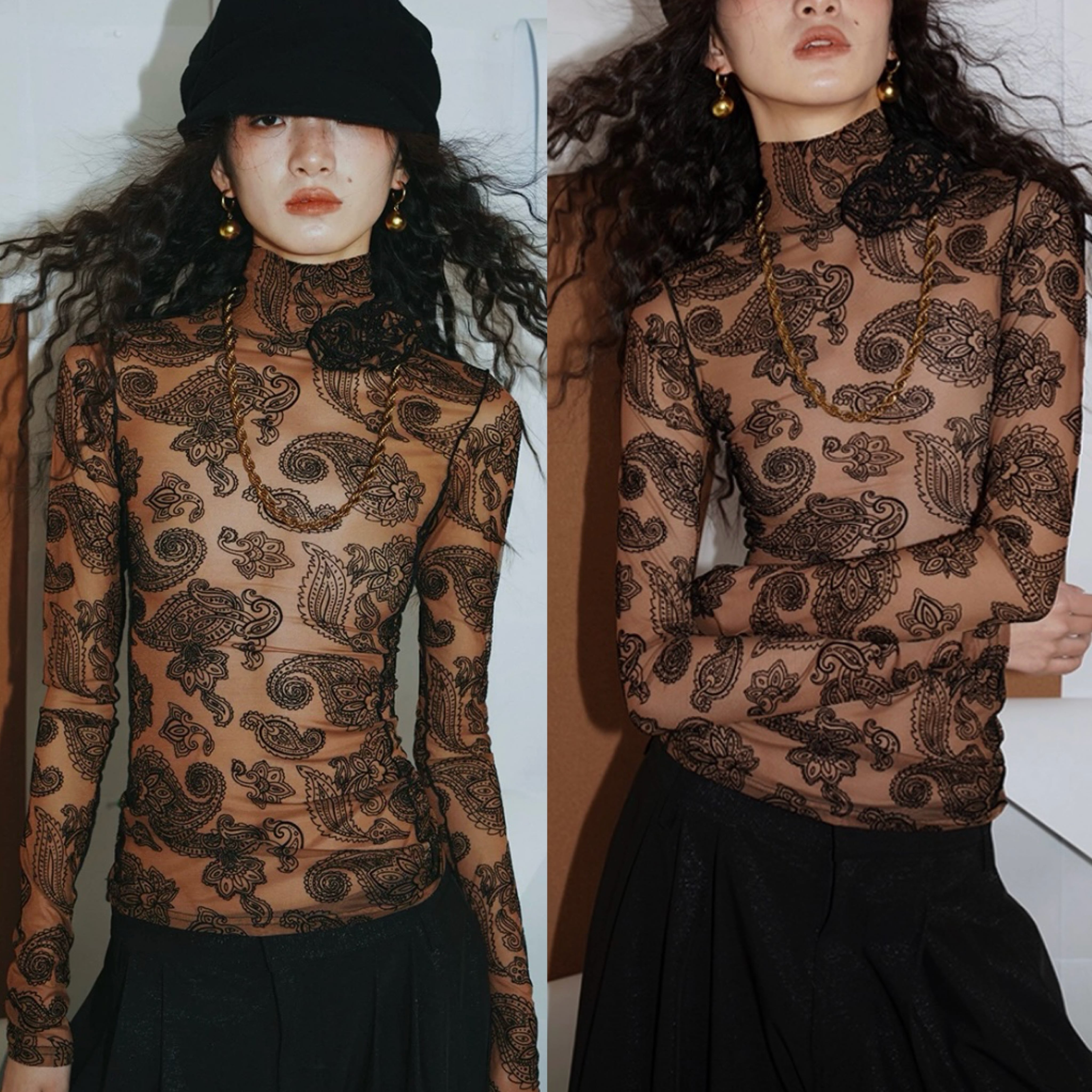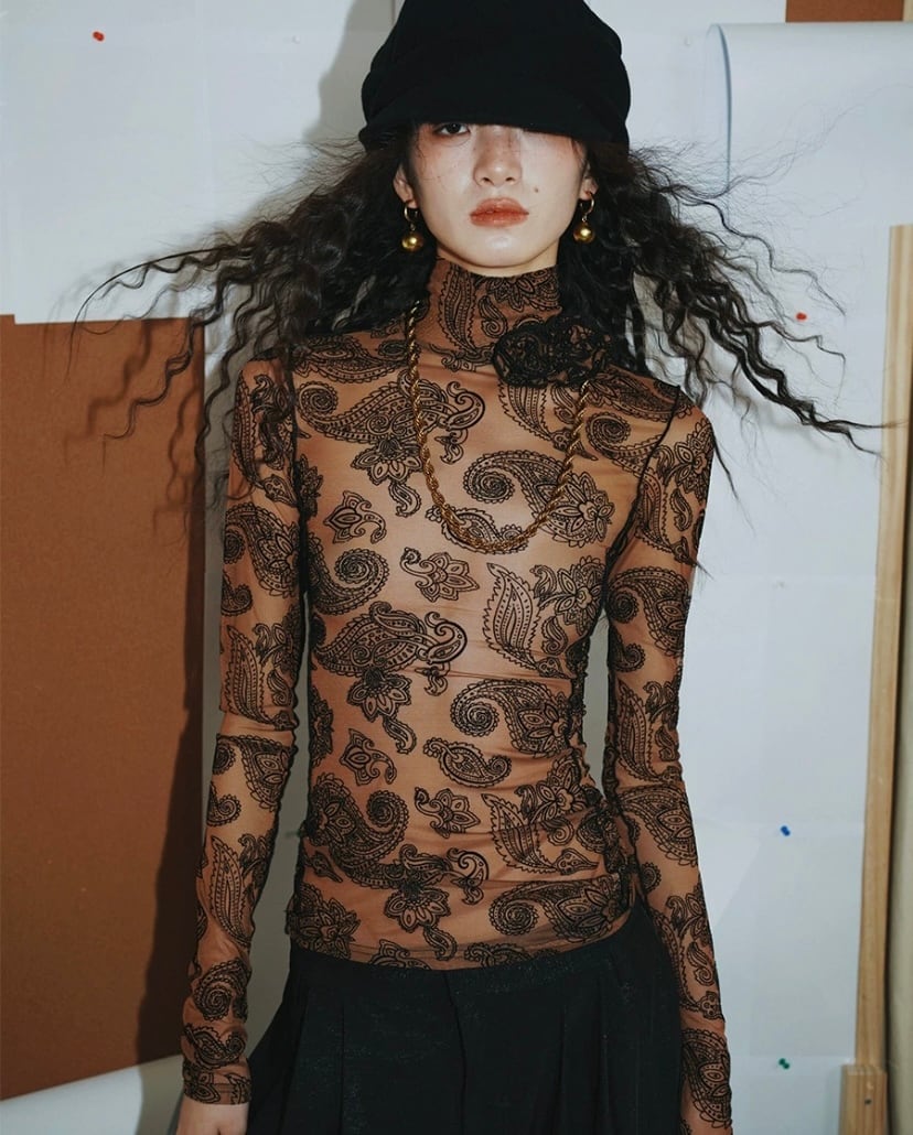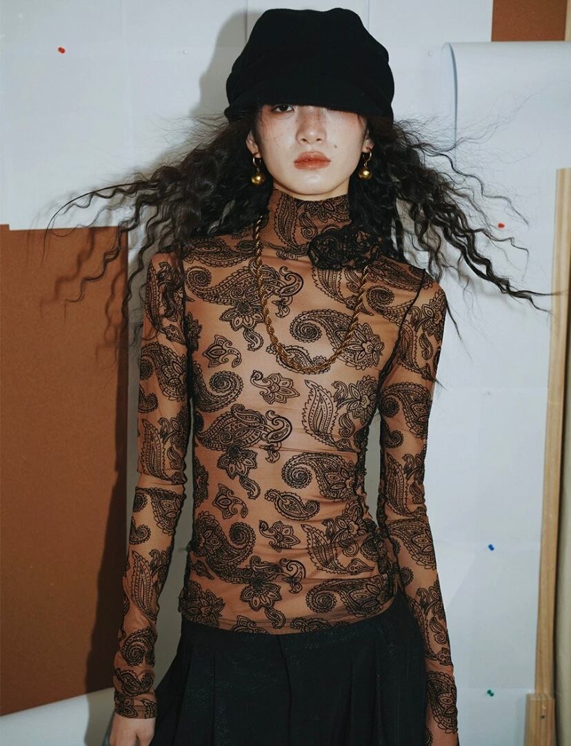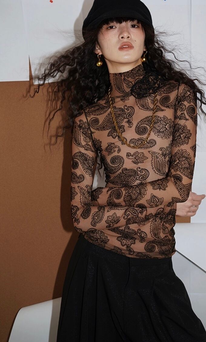 ベージュ 花柄 トップス ハイネック ブラウス シースルー クラブ タトゥー 刺青 ヌーディ レトロ 裏裏原宿