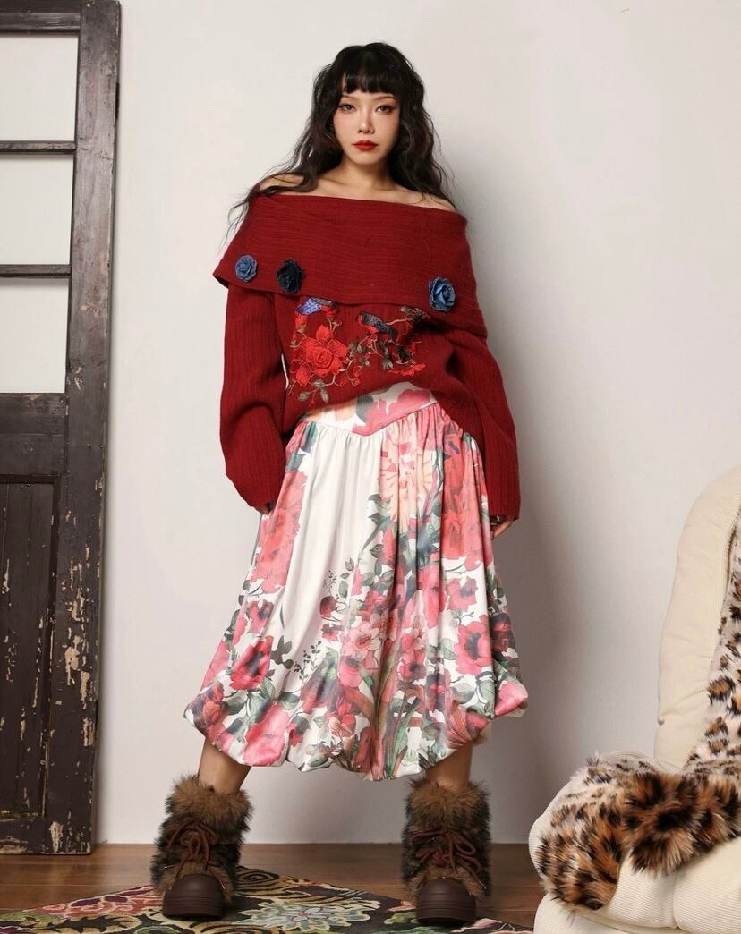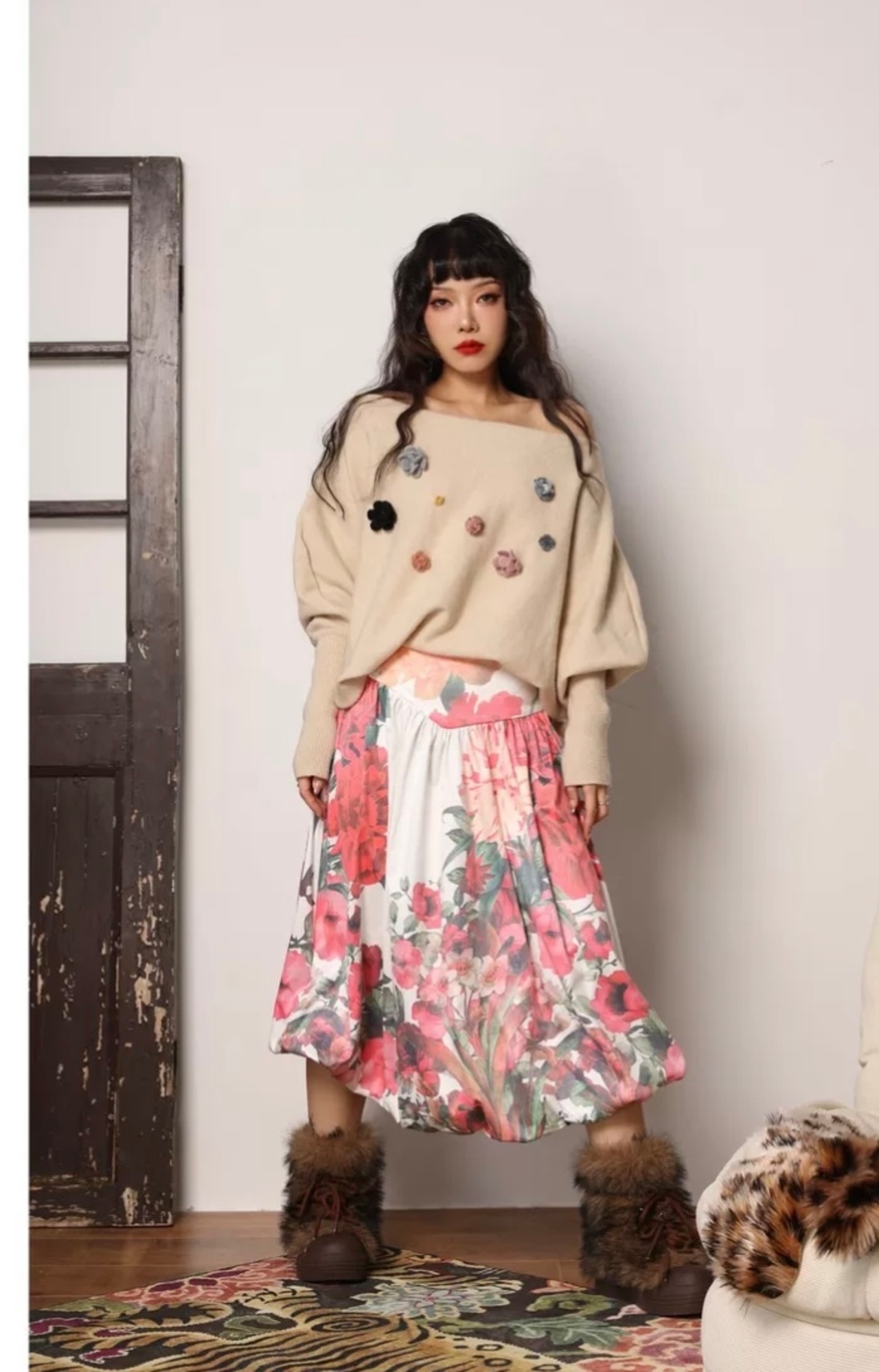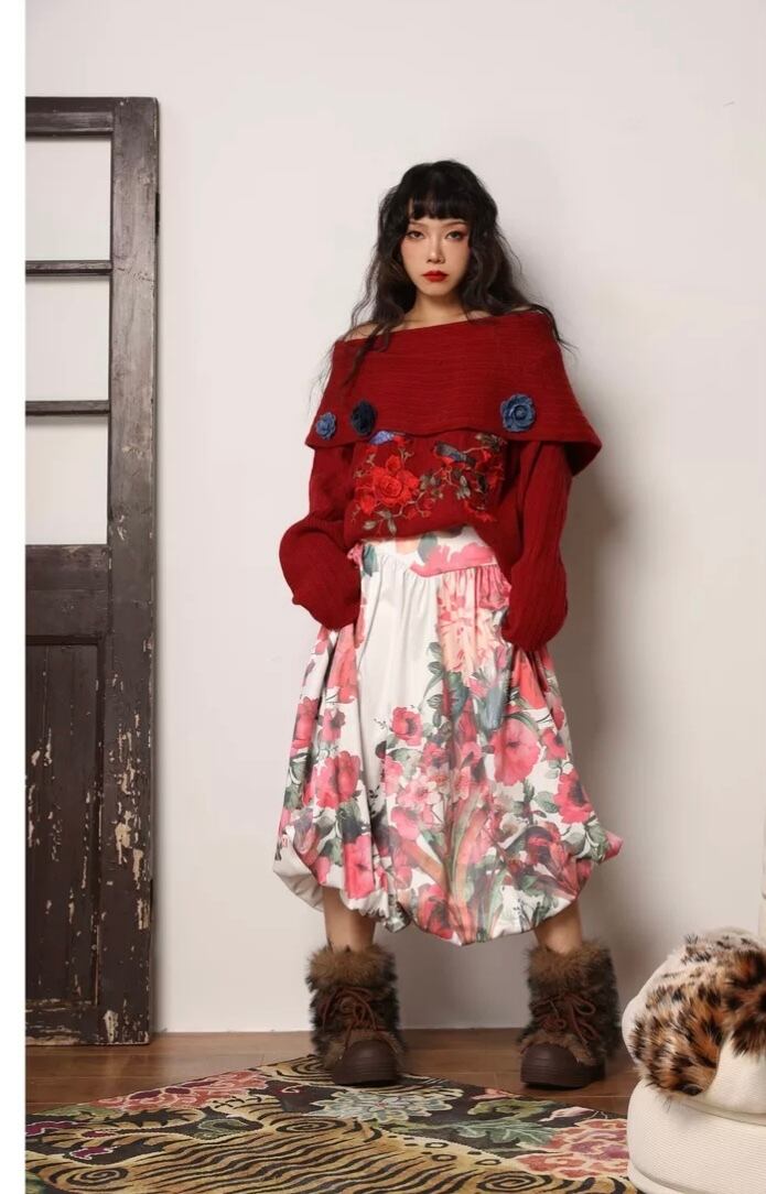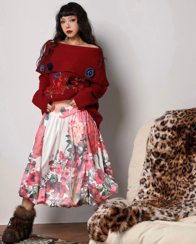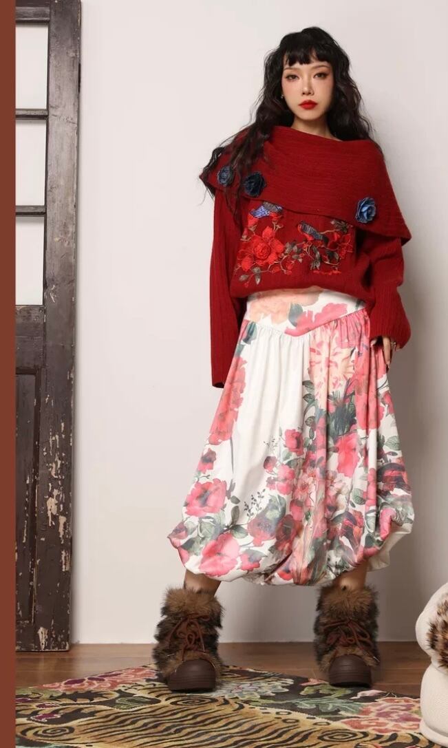 花柄 赤 白 薔薇 フラワ バルーン スカート ボトムス エスニック エレガント 華やか かわいい 膝丈 スカート 銀座 表参道