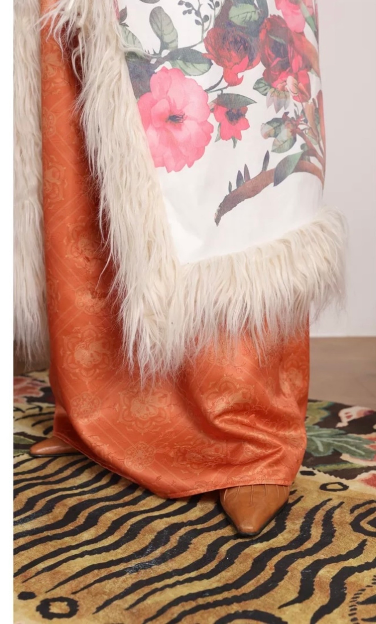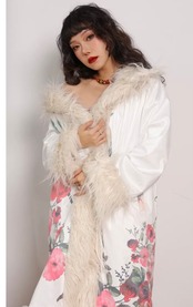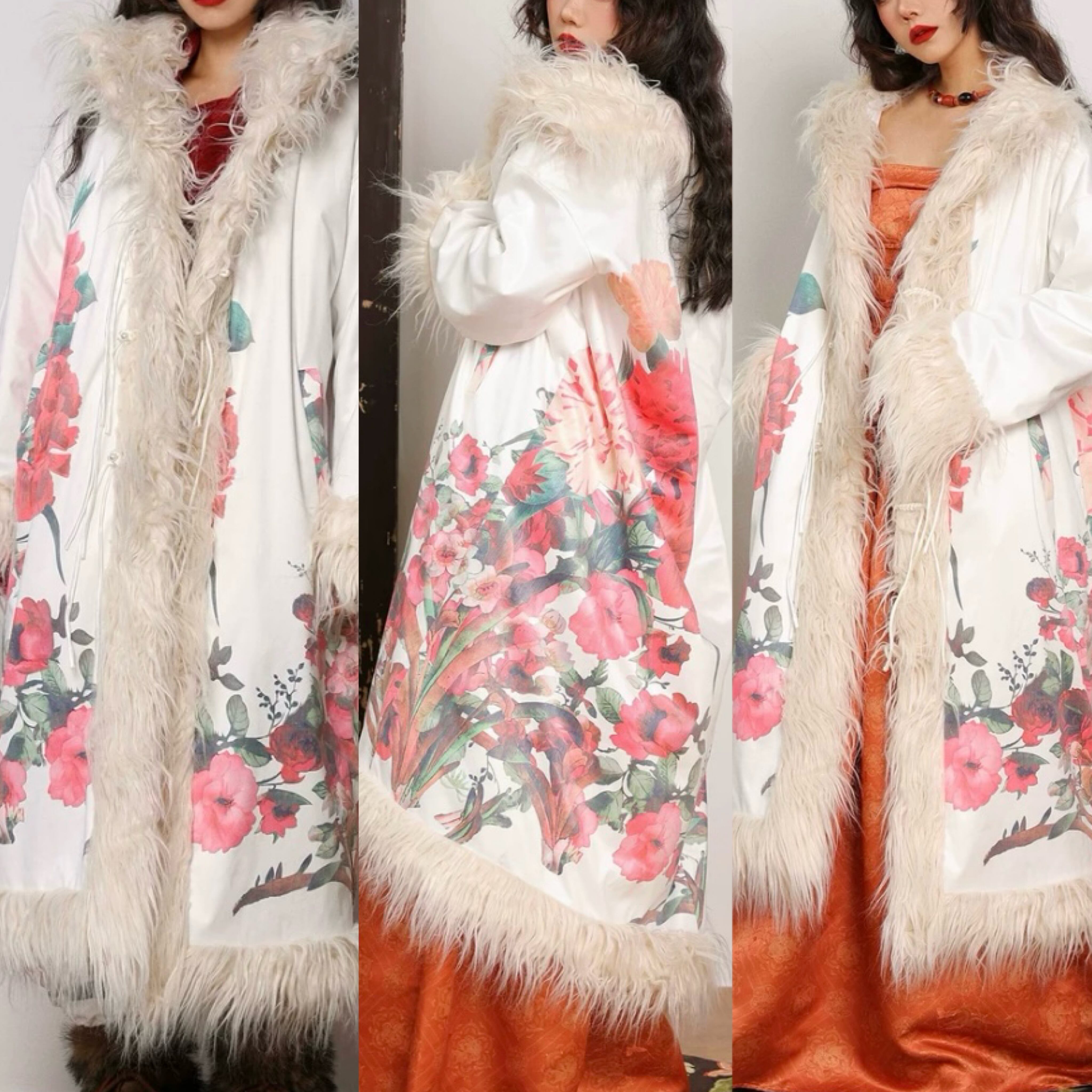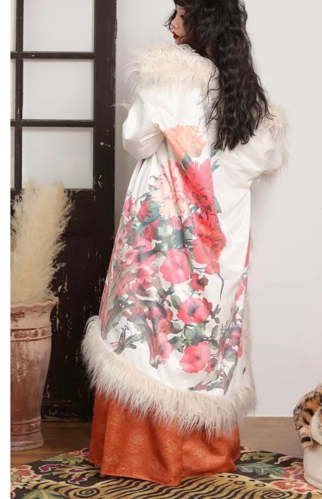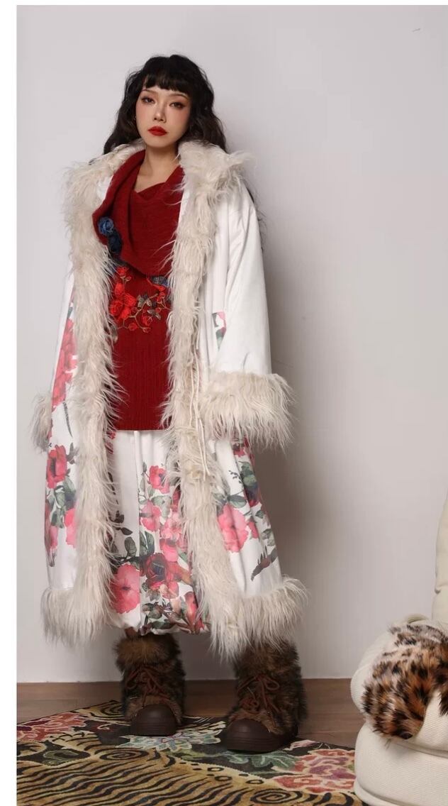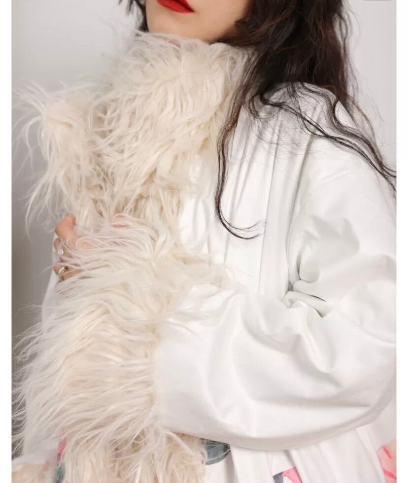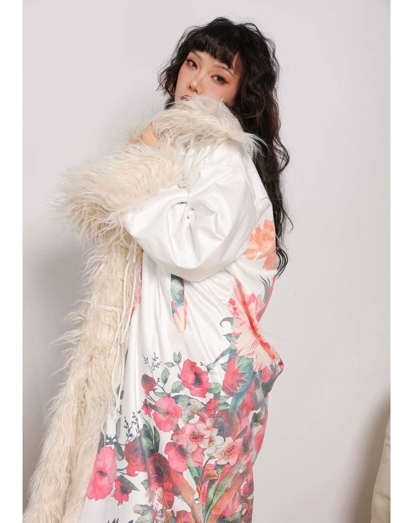 白 ホワイト 花柄 ピンク 赤 ファー ジャケット アウター コート ゴージャス 和柄 和風 着物 レトロ 個性 原宿 銀座