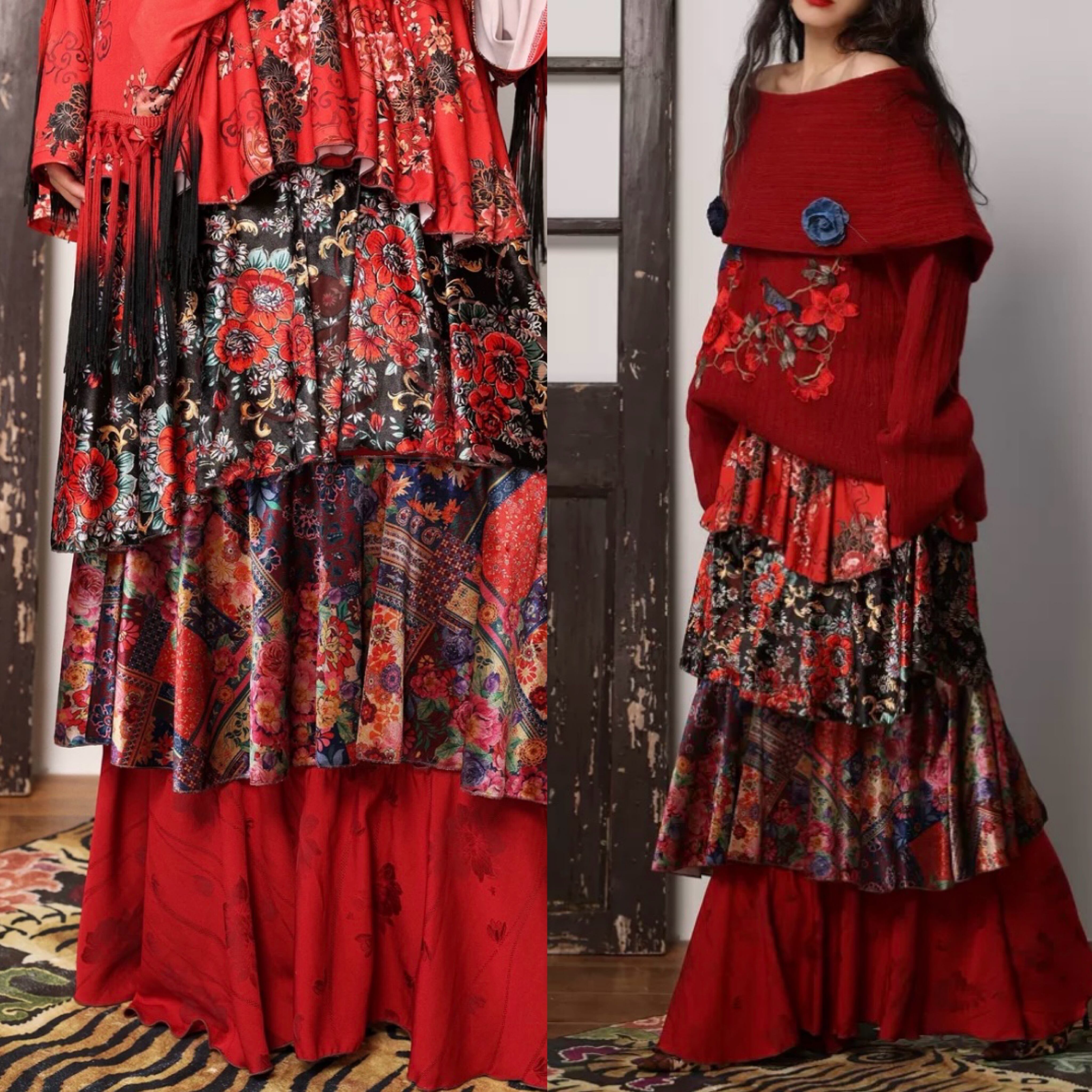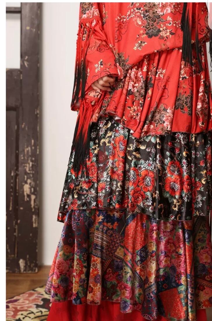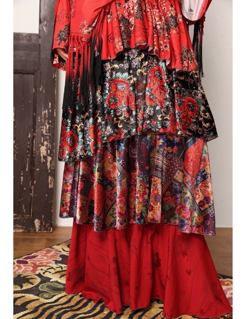 ボトムス 赤 エスニック 和柄 マキシ ロング スカート フリル だんだん ゴージャス 原宿 レトロ パッチワーク フラワー 着物