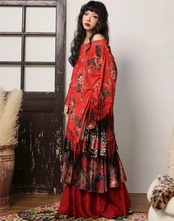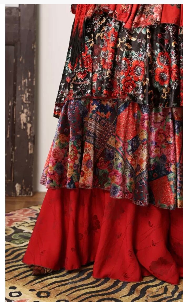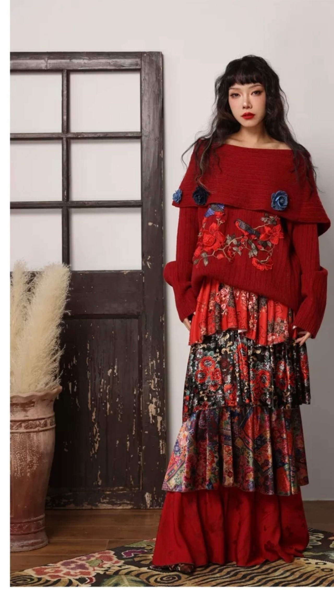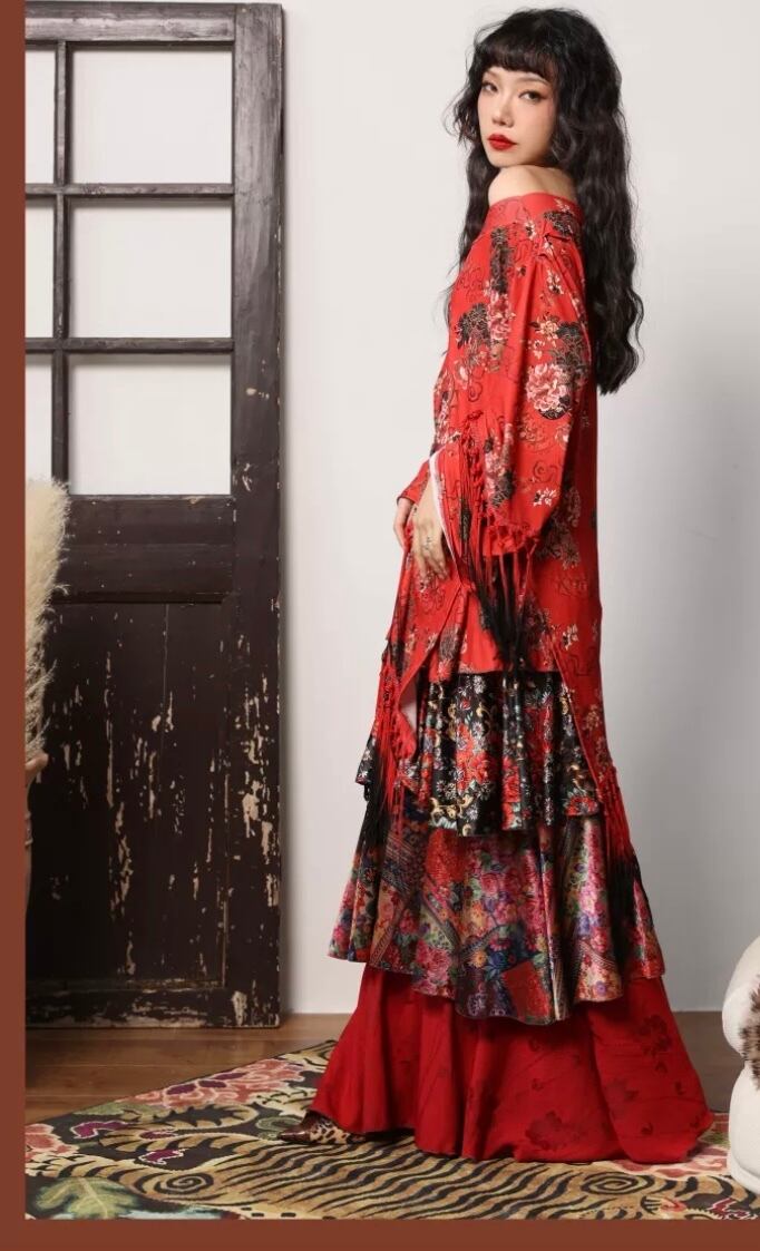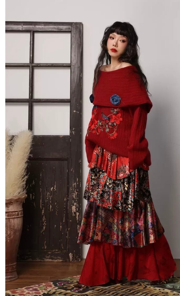 ボトムス 赤 エスニック 和柄 マキシ ロング スカート フリル だんだん ゴージャス 原宿 レトロ パッチワーク フラワー 着物