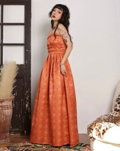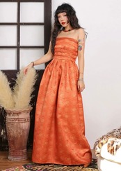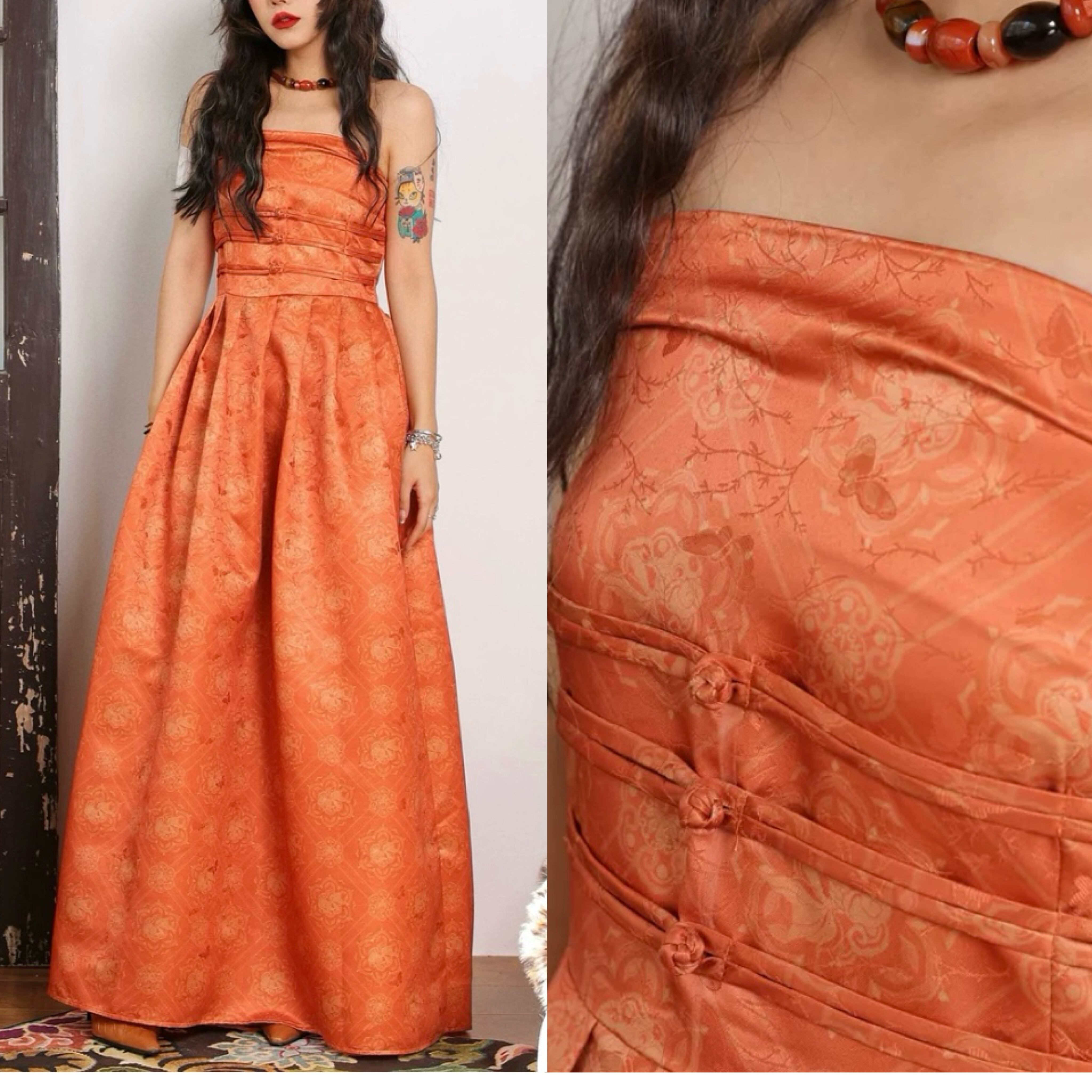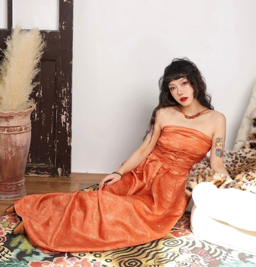 ベアトップ 花柄 和風 和柄 着物 浴衣 チャイナ ドレス オフショルダー マキシ ワンピース パーティー 浴衣 レトロ オレンジ