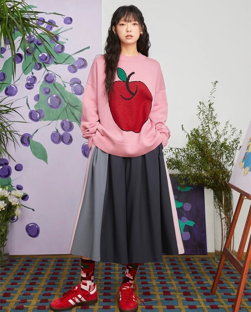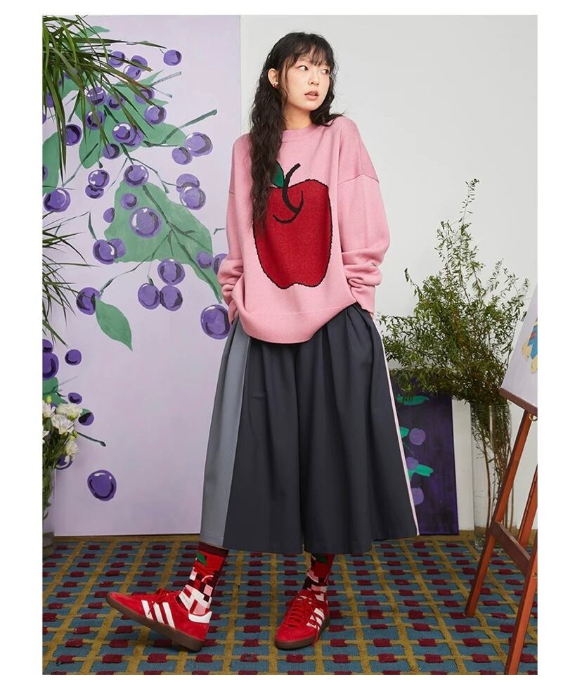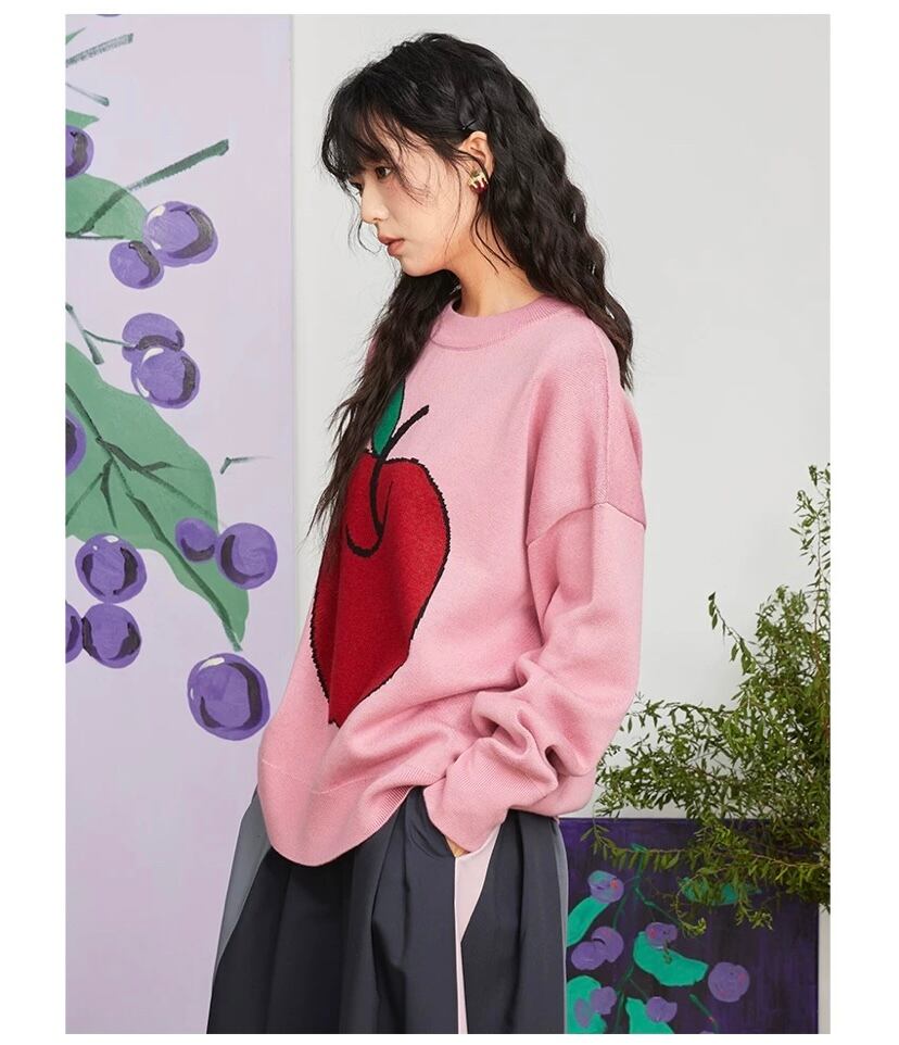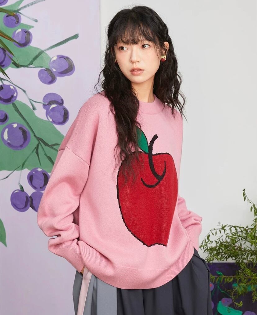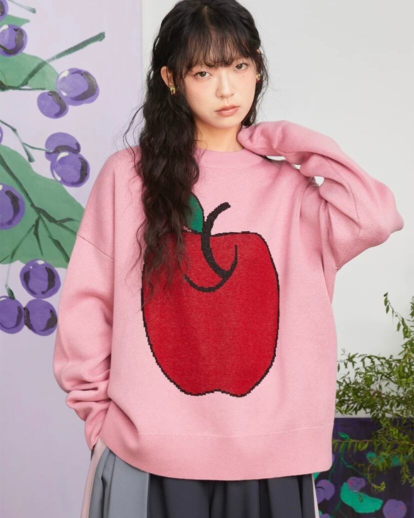 ピンク 赤 フルーツ セーター カーディガン トップ ニット トップス 赤 りんご アップル かわいい ゆったり 原宿