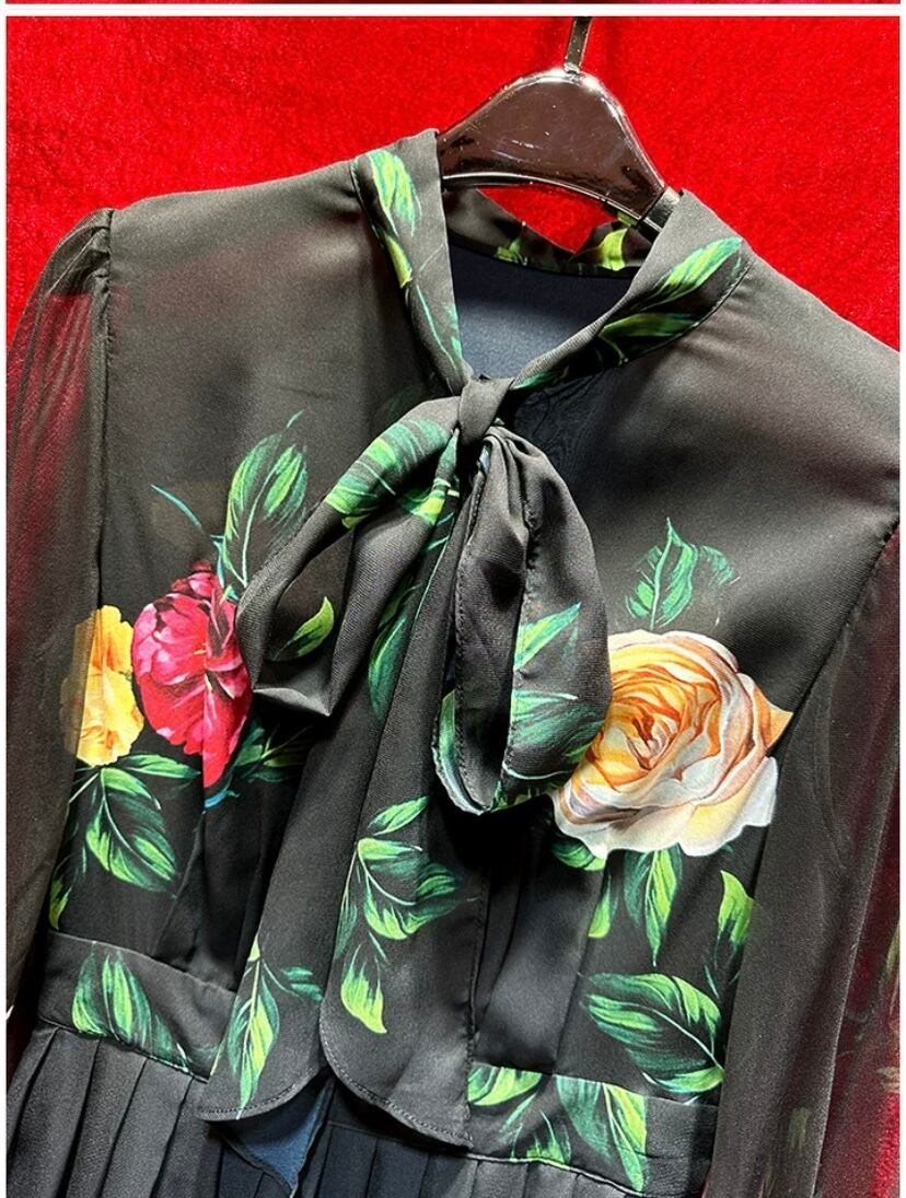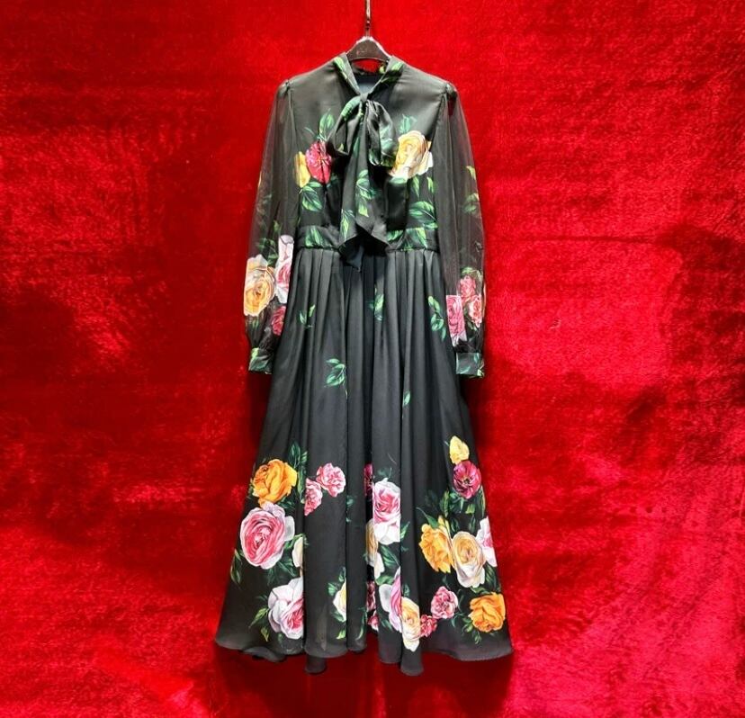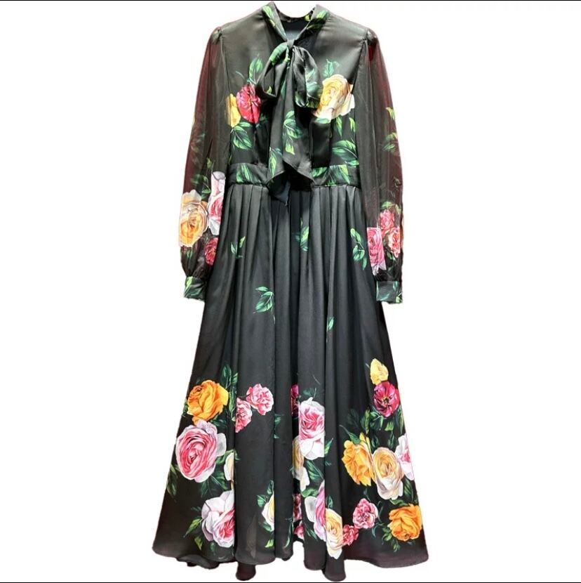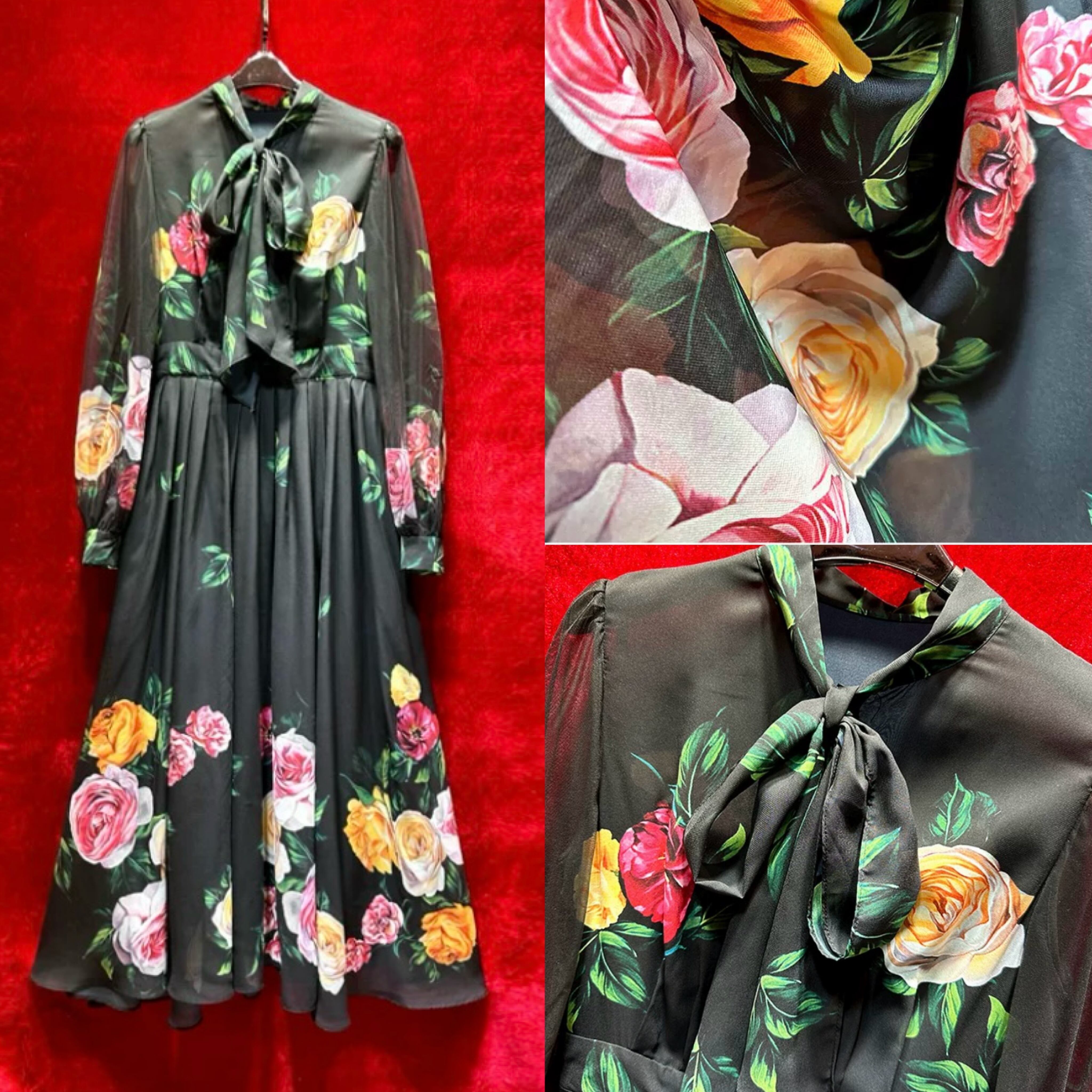 黒 花柄 フラワー リボン エレガント XL マキシ ロングワンピース ブラウス カラフル バラ 花柄 黄 赤 ピンク