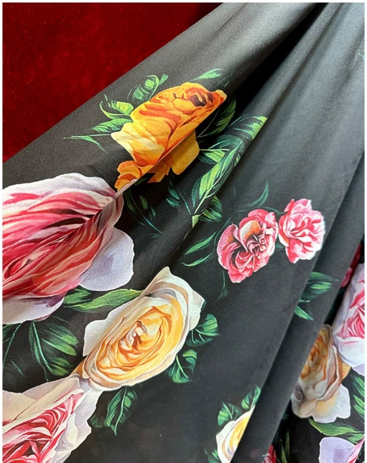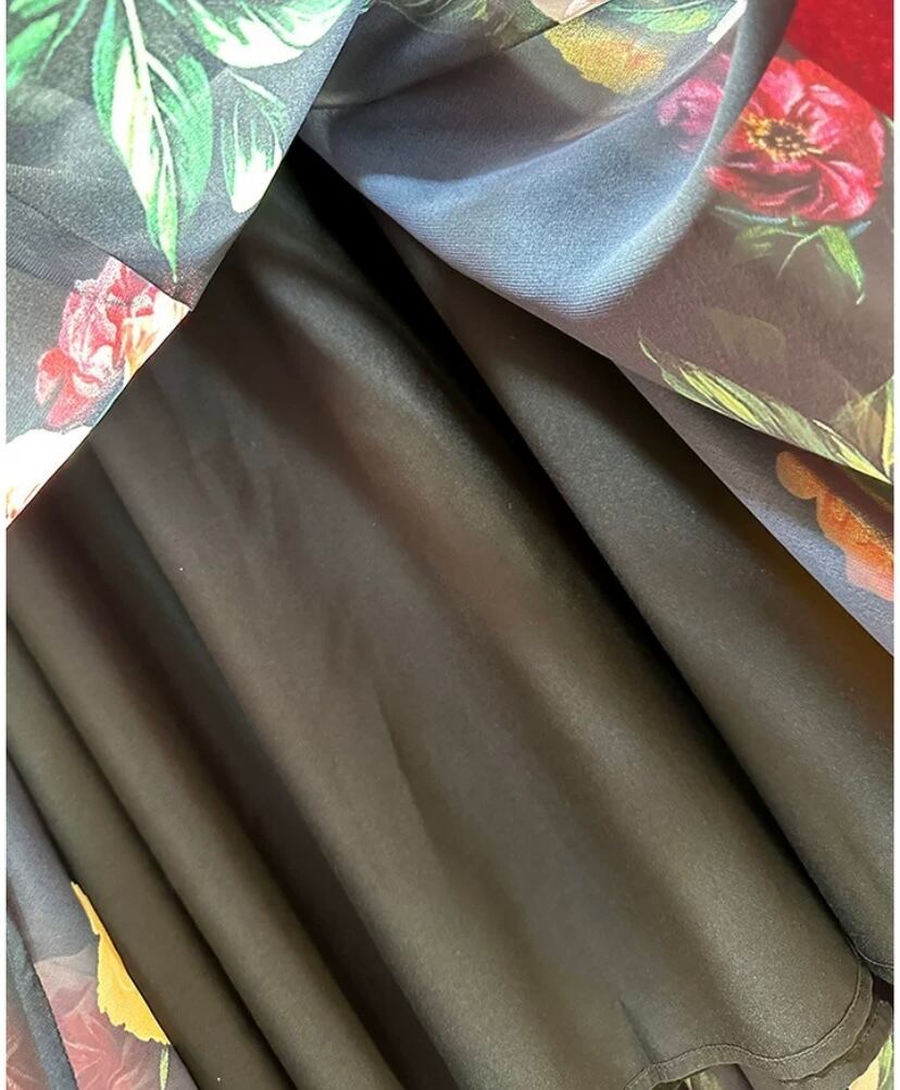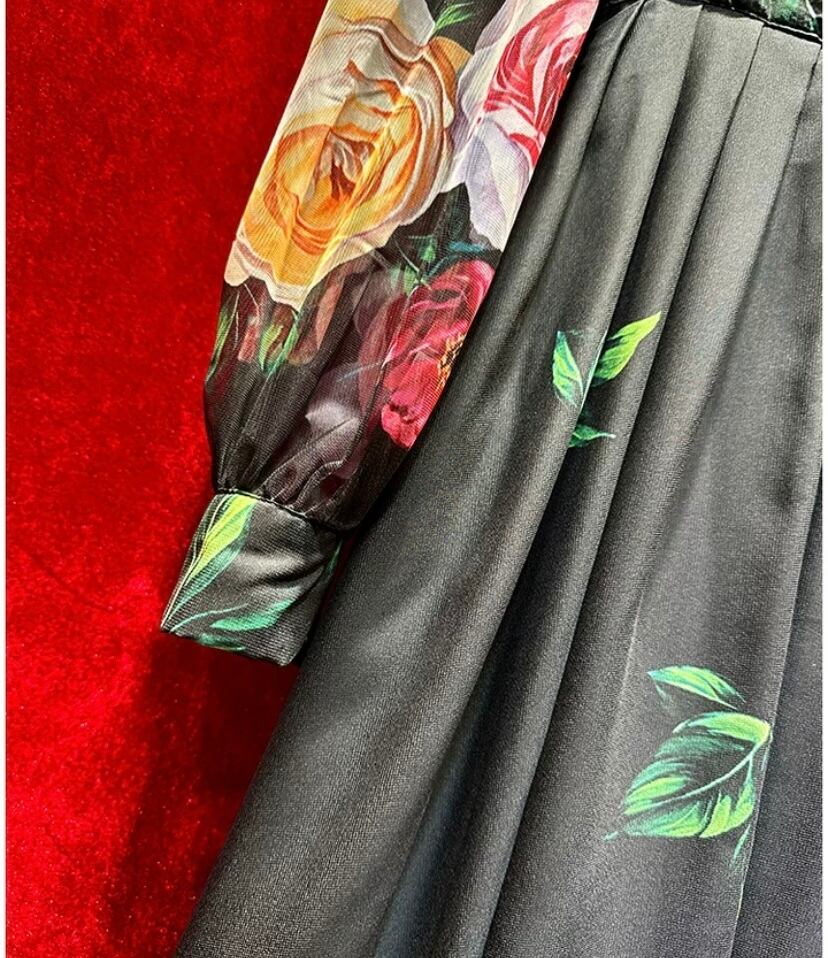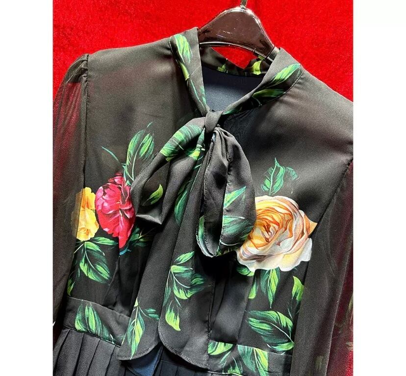 黒 花柄 フラワー リボン エレガント XL マキシ ロングワンピース ブラウス カラフル バラ 花柄 黄 赤 ピンク