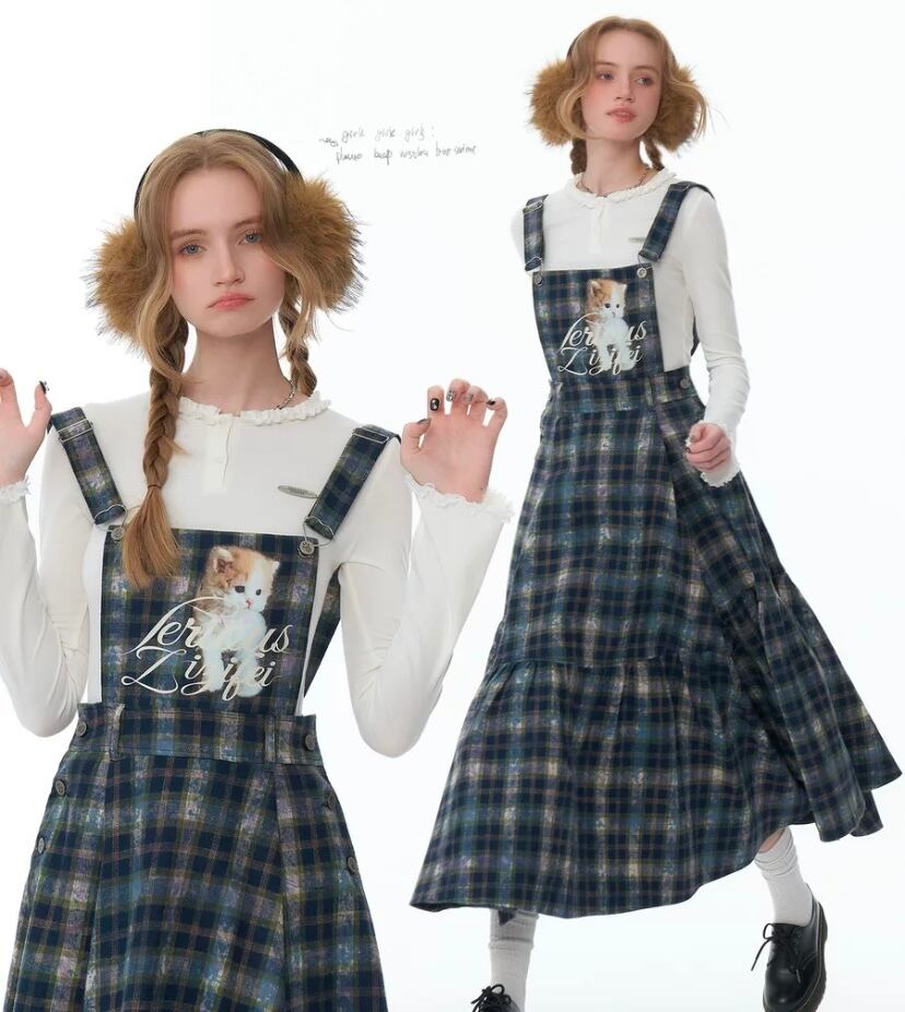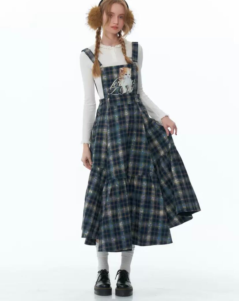 猫 ペット 肉球 マキシワンピース ジャンバースカート オーバーオール ネイビー 可愛い スカート ゆったり 原宿 キャット ロング フレアスカート