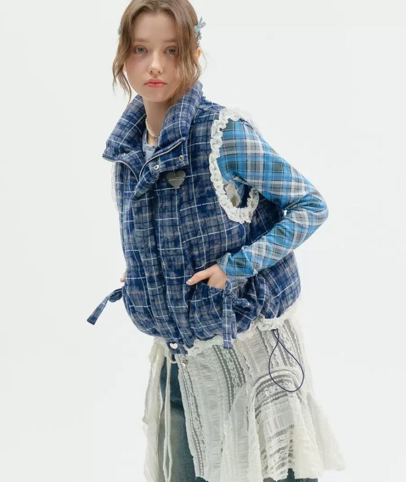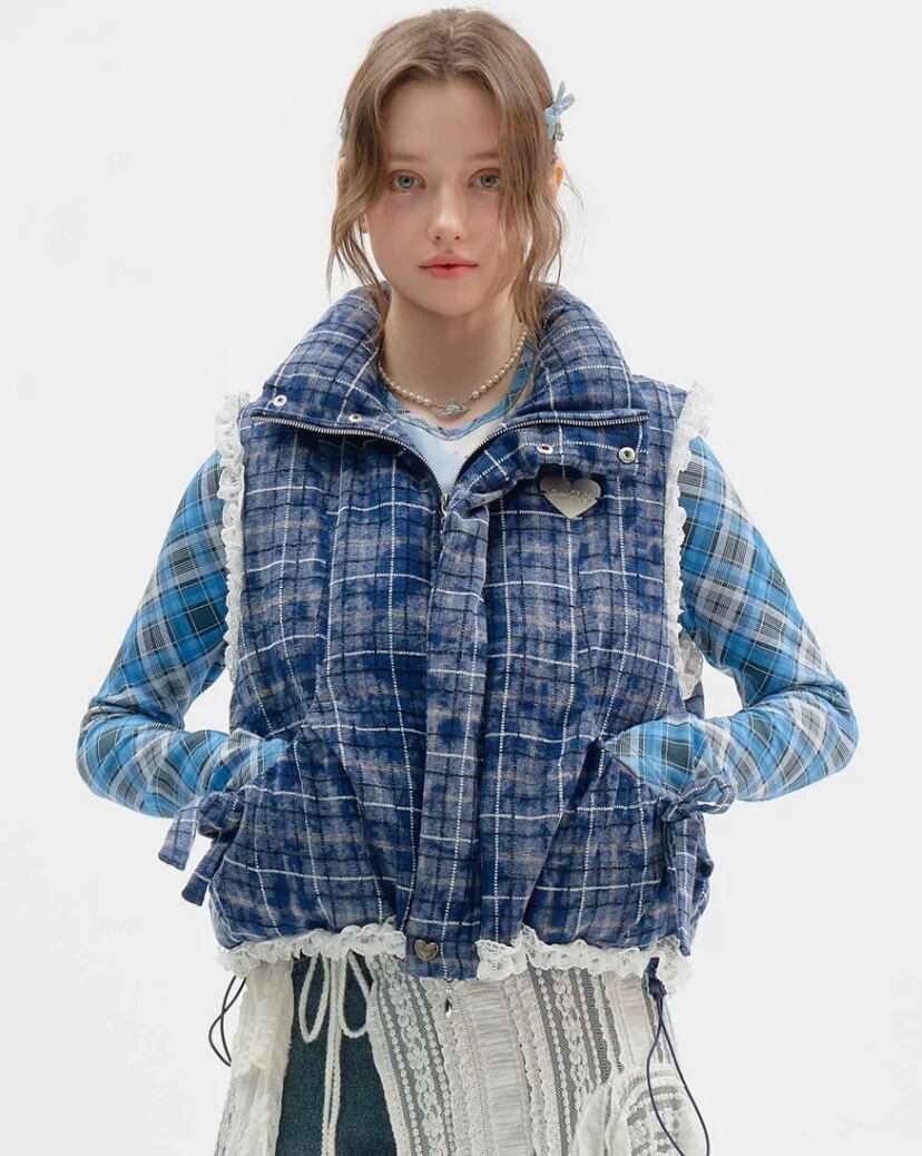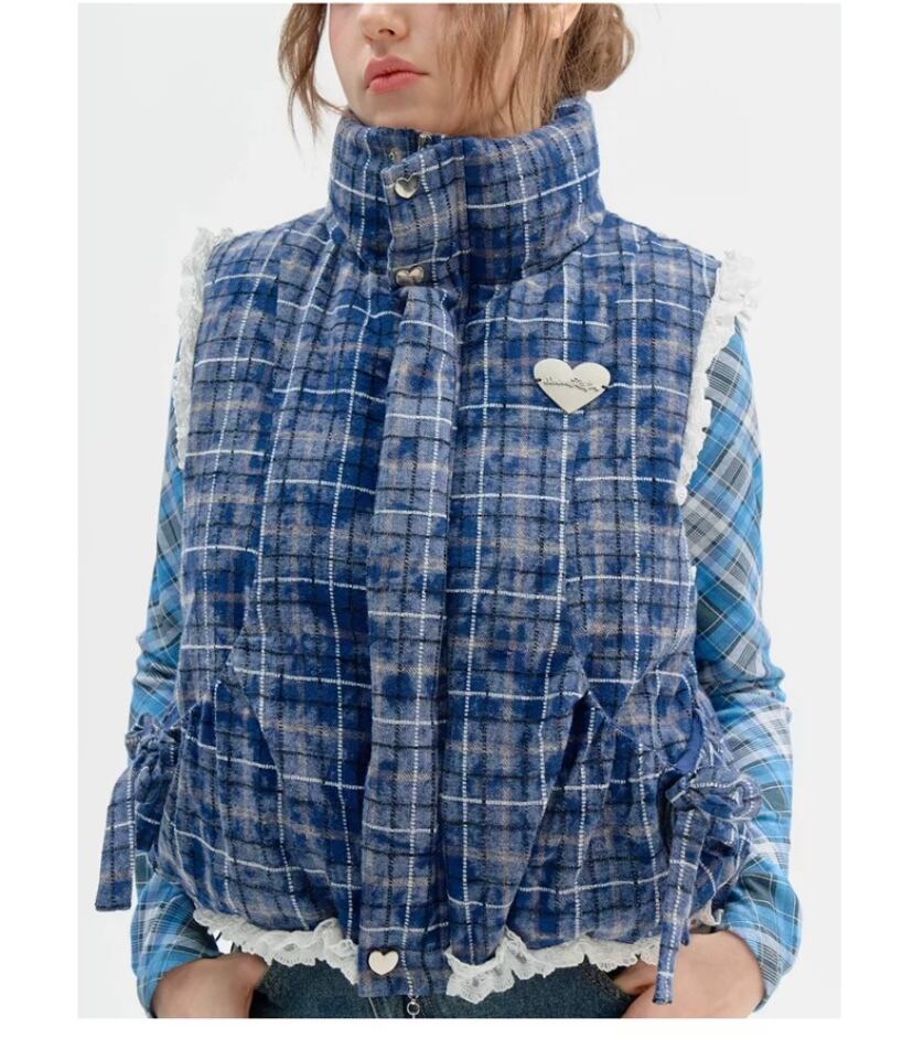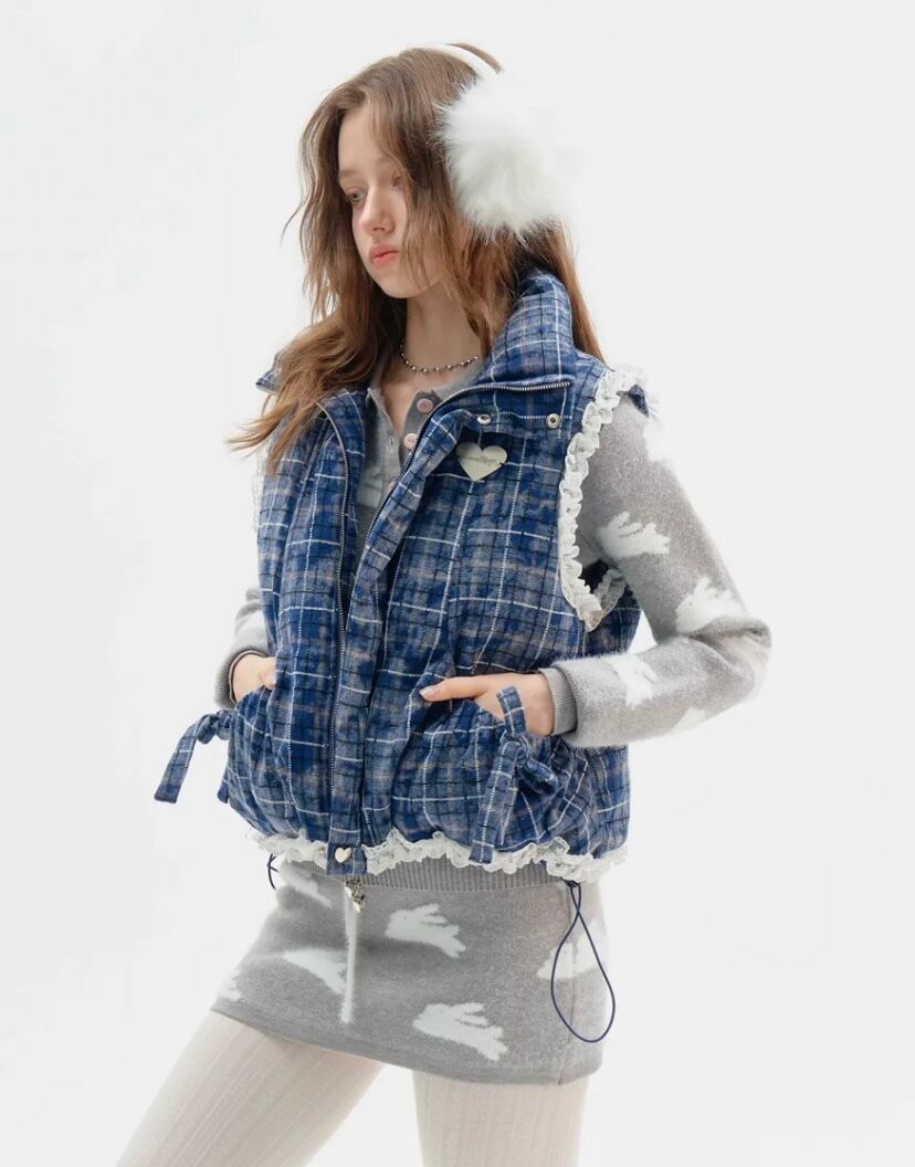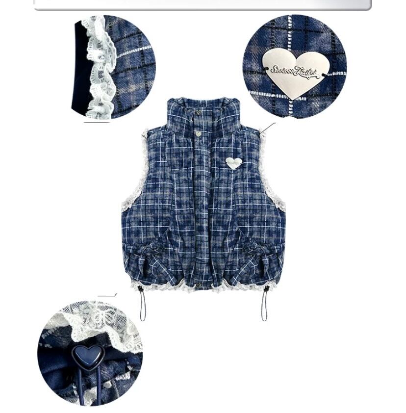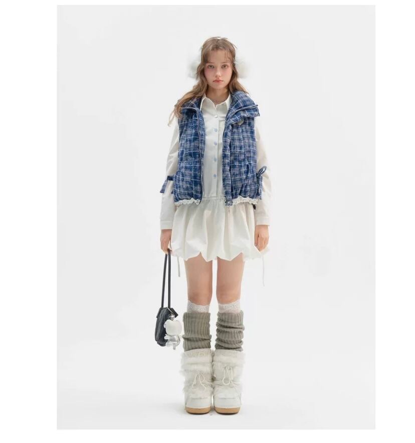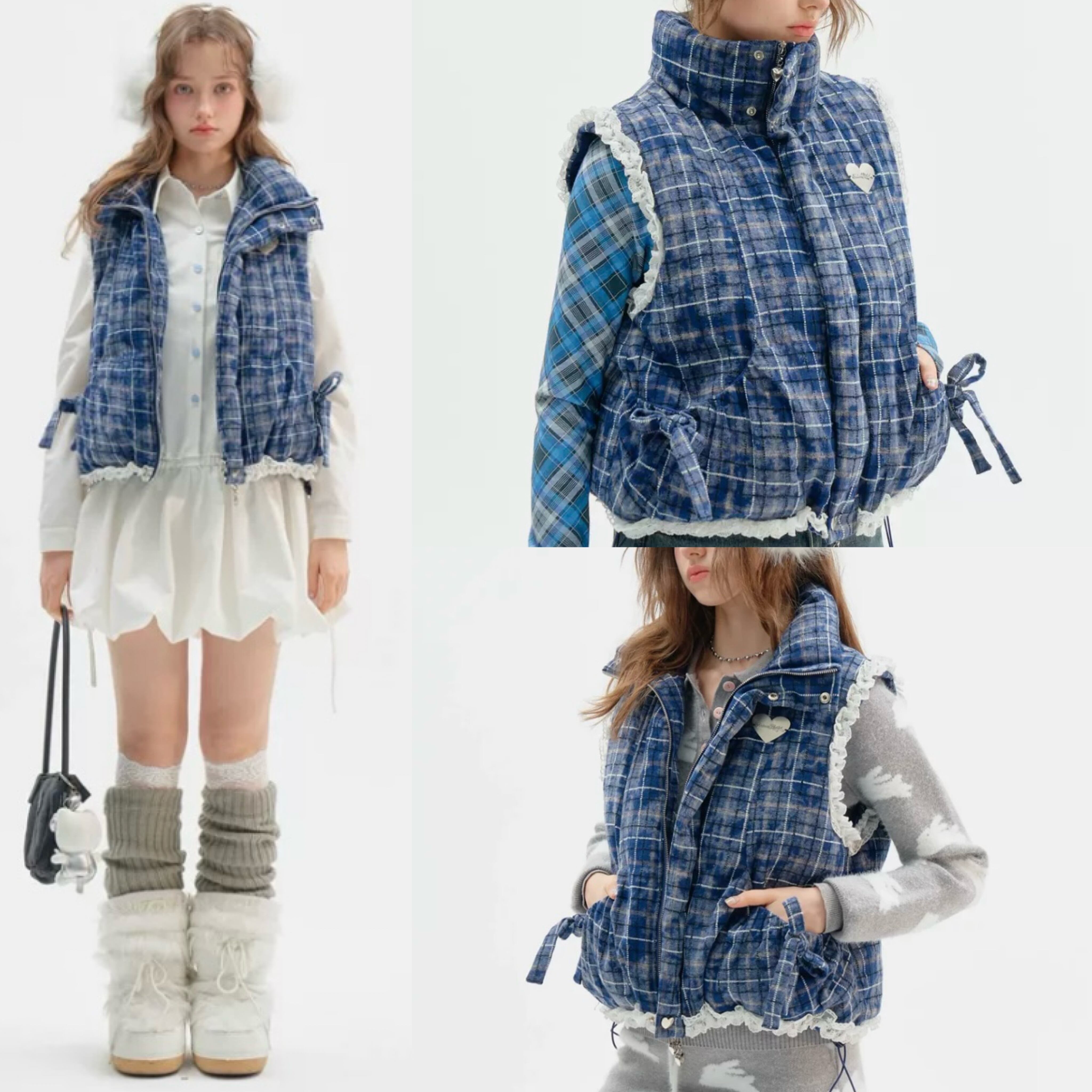 ダウンベスト ダウンコート ネイビー チェック 紺色 リボン ジャケット アウター ポケット フード カーディガン ブルゾンゾ 冬 コート かわいい 原宿 カジュアル ハイネック