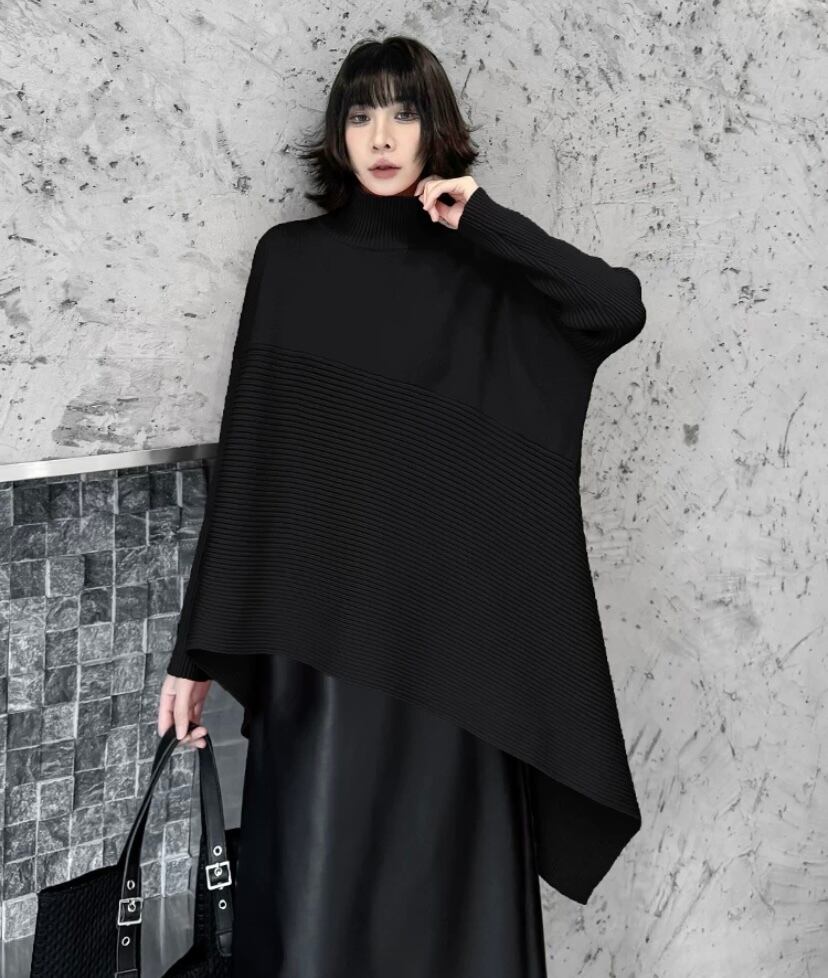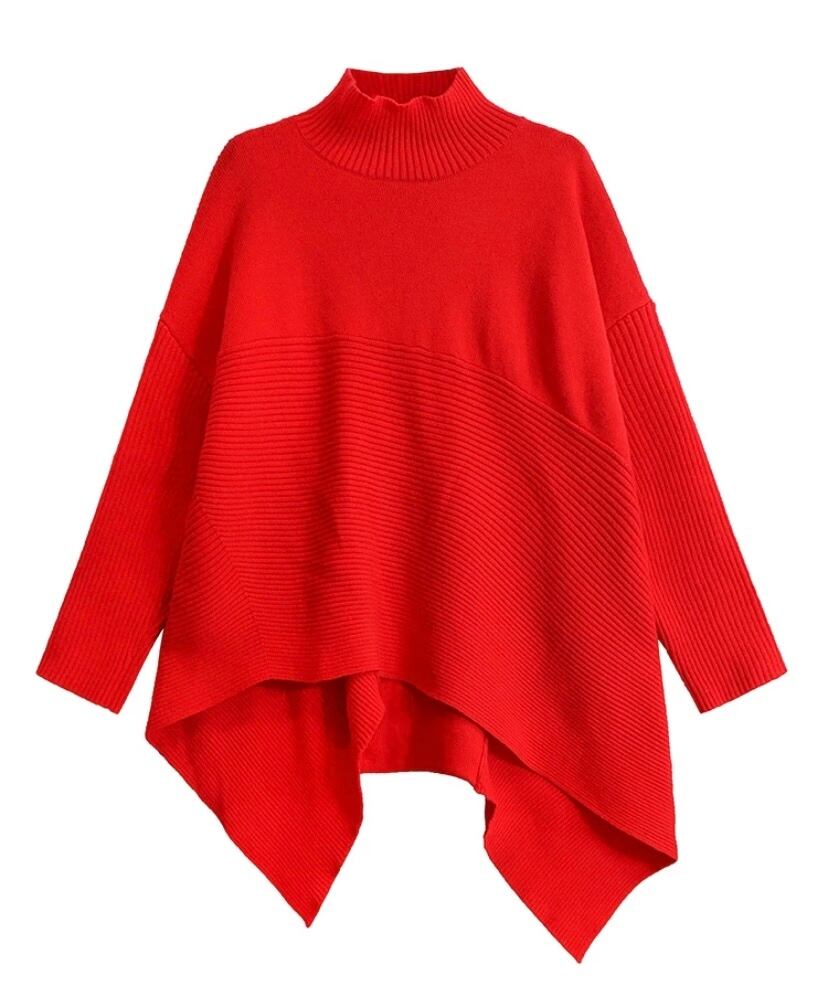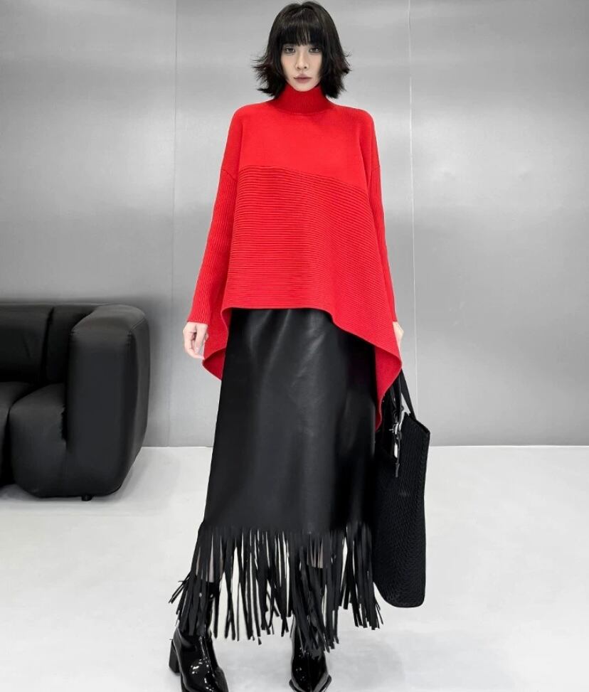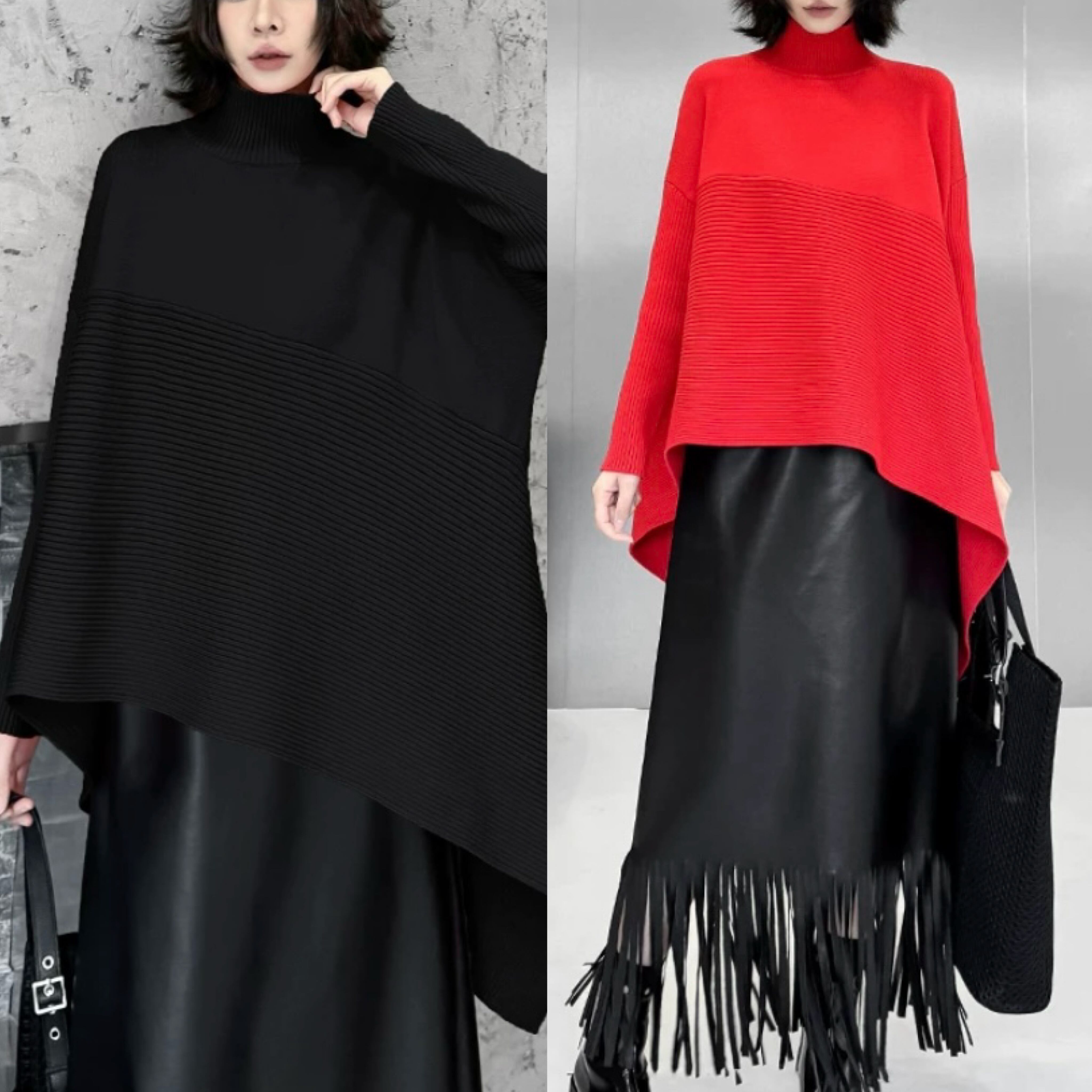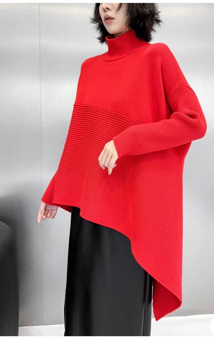 ハイネック チュニック ブラウス セーター トップス アシンメトリー 赤 黒 ブラック カーディガン オーバーサイズ ゆったり
