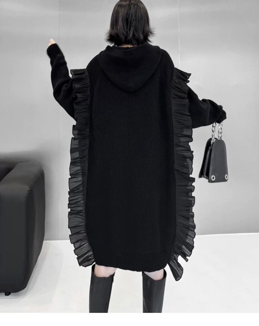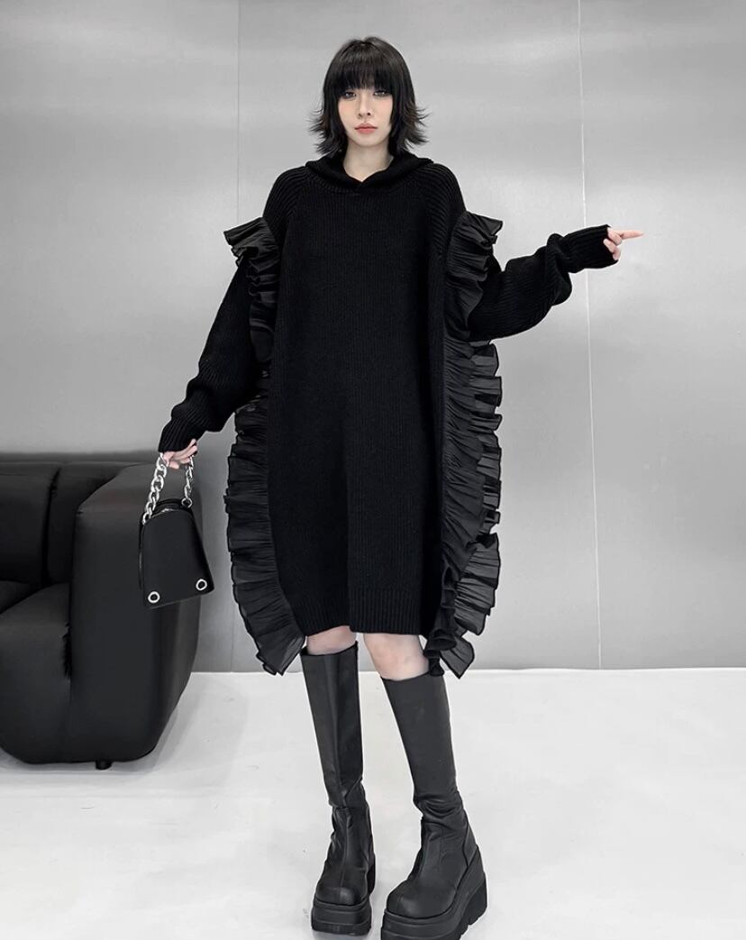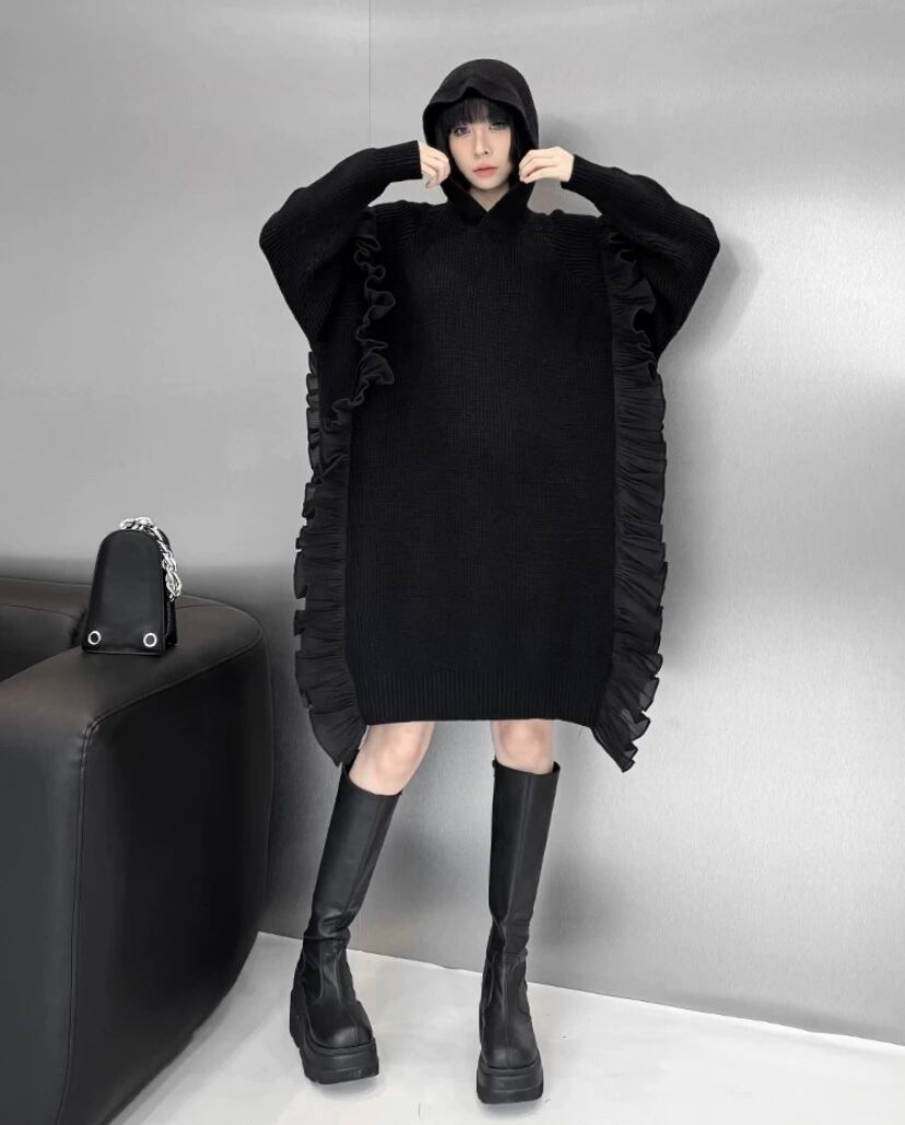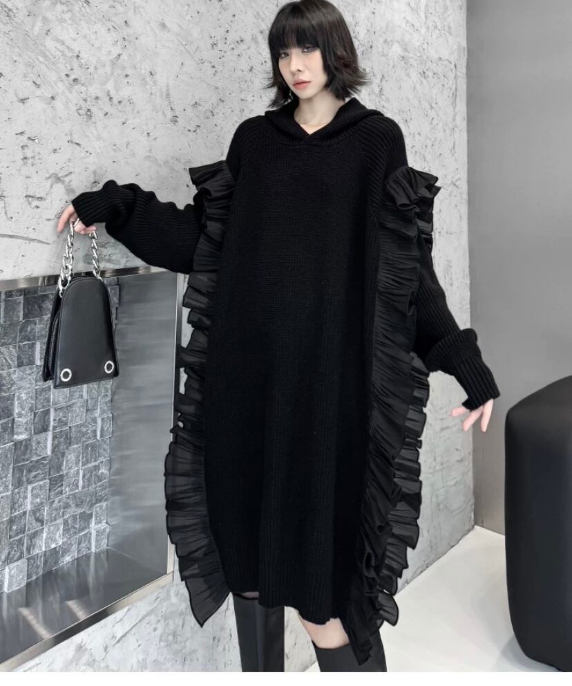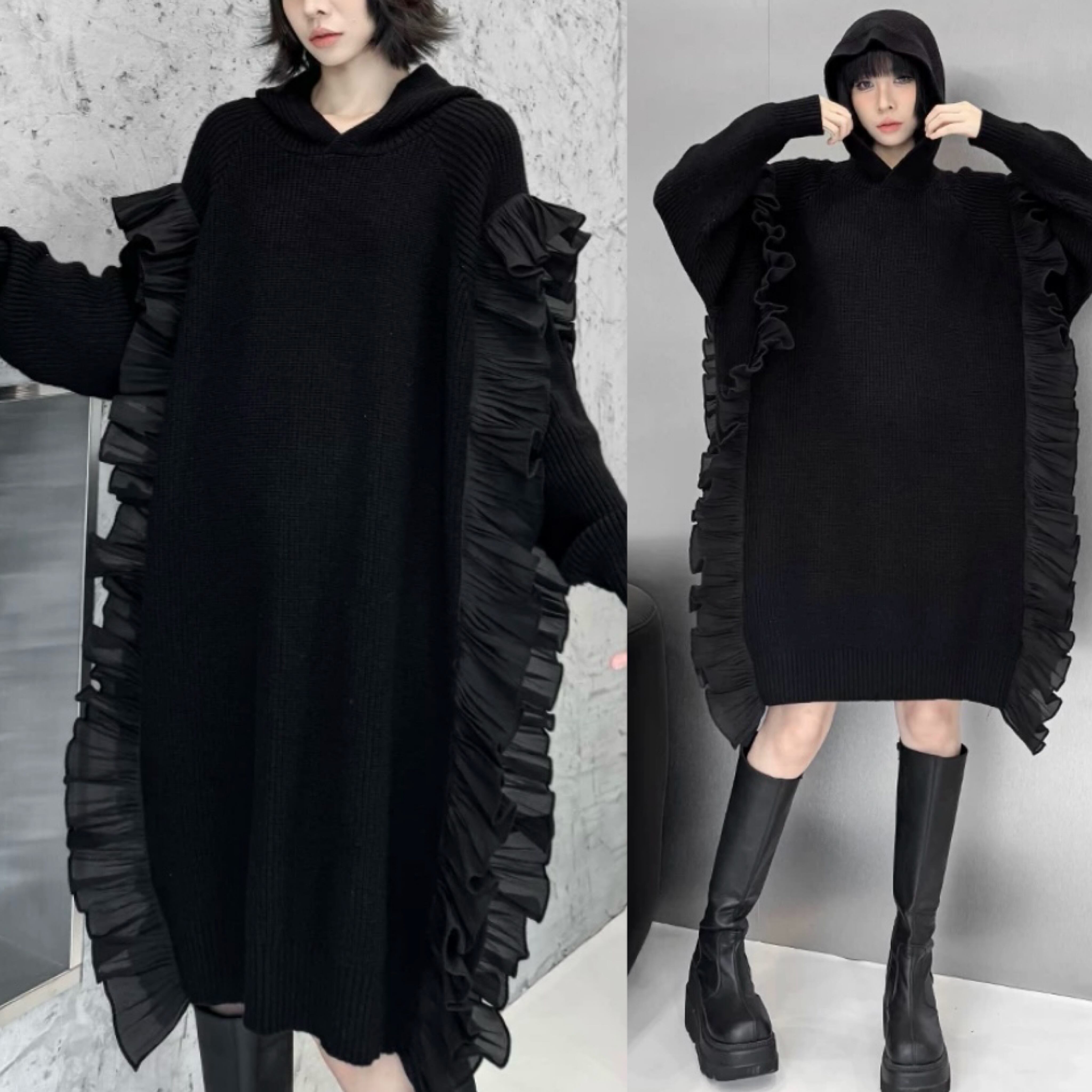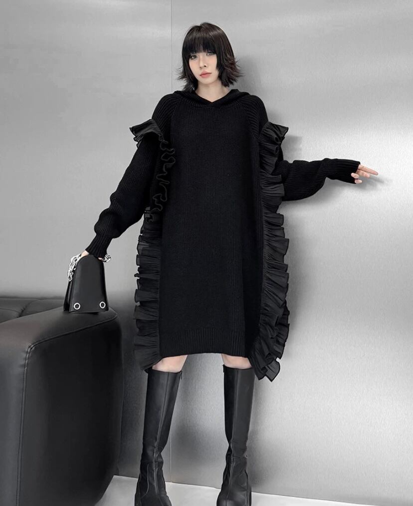 オーバーサイズ 黒 パーカー フード ブラック ワンピース フリル ゆったり カジュアル パーカー