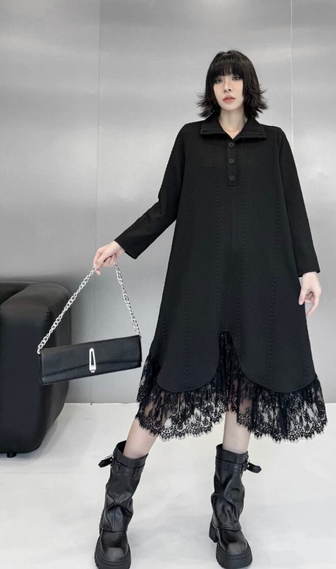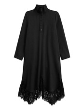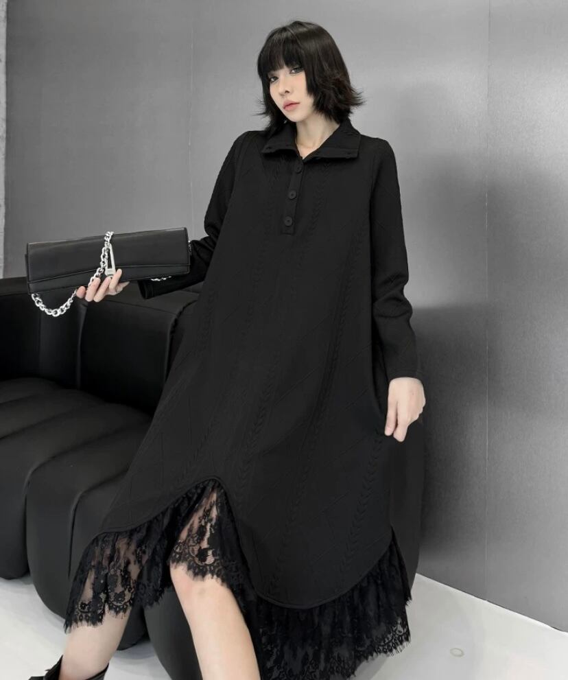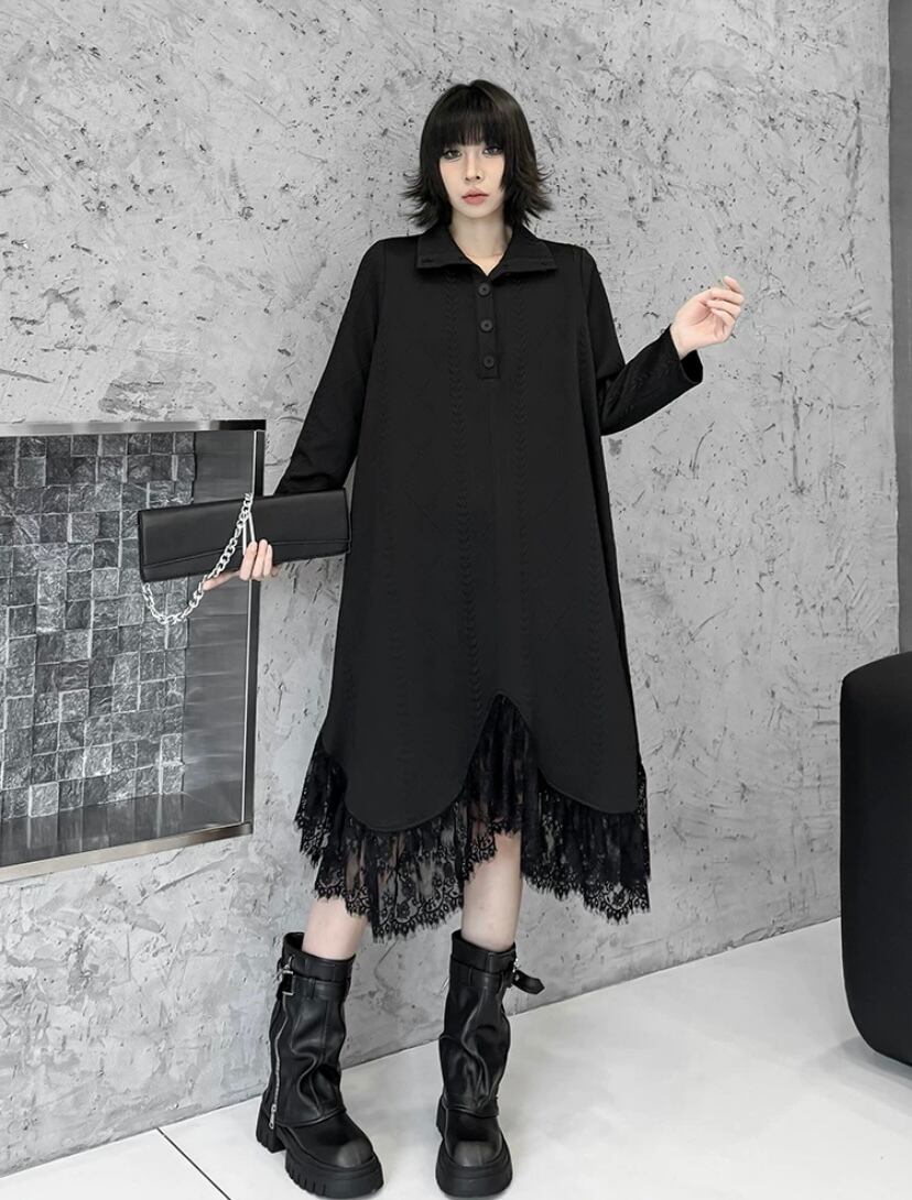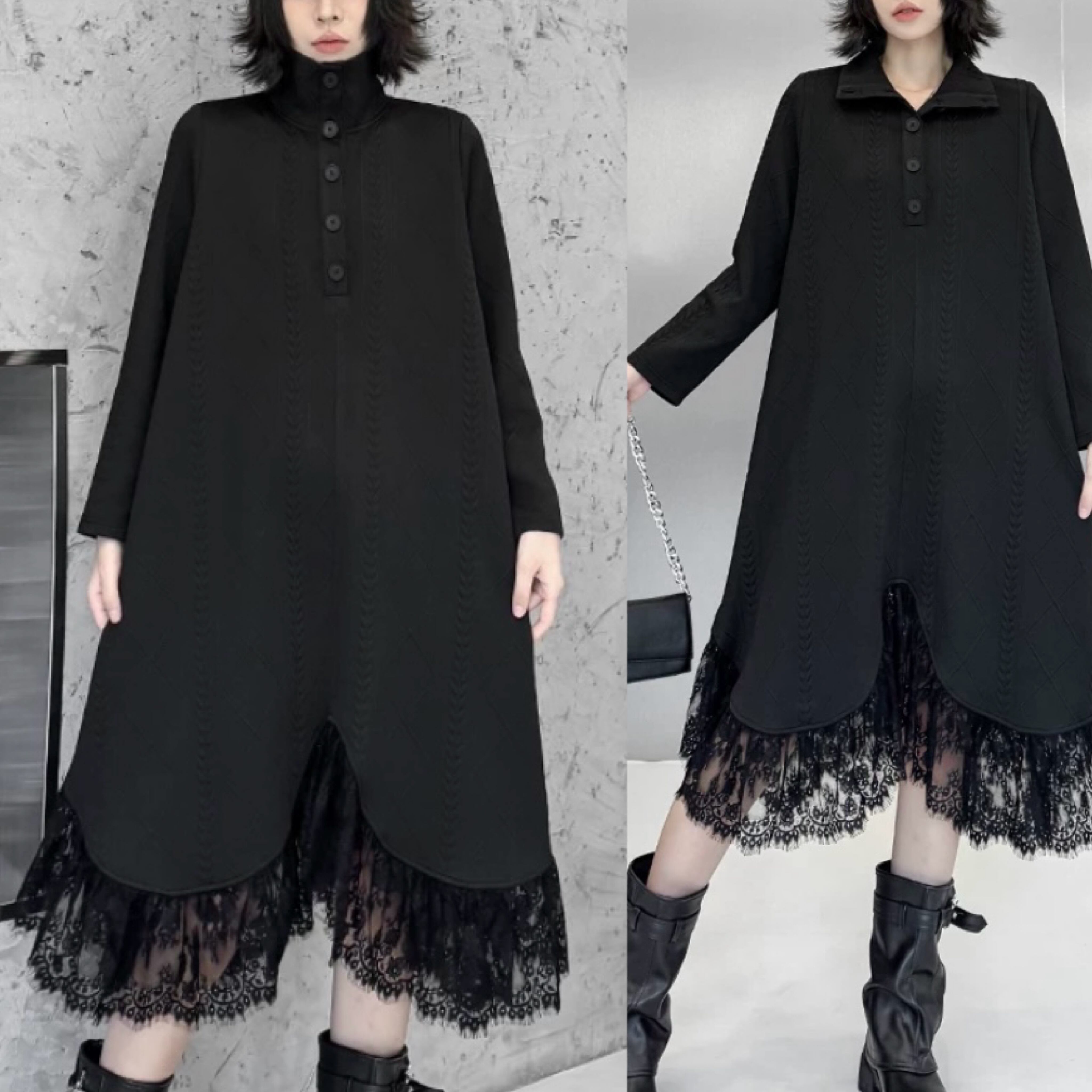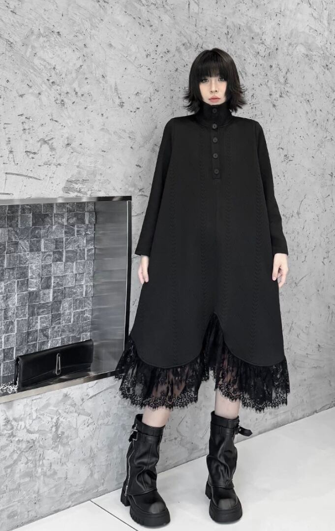 黒 ブラック ブラウス シャツ モード ワンピース 膝丈 レース カジュアル シンプル オーバーサイズ ストリート ハイネック