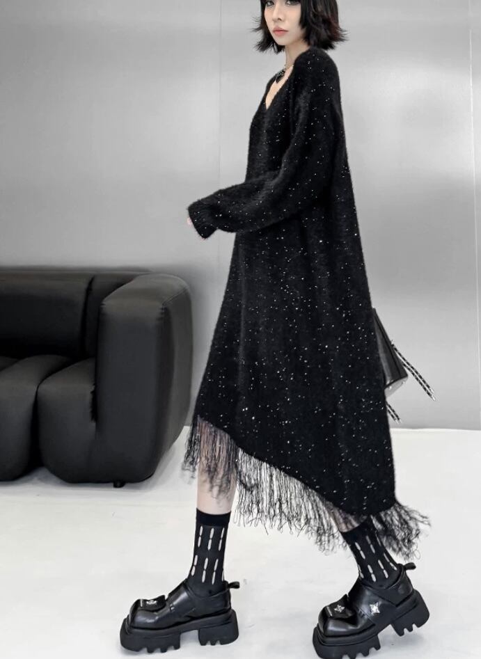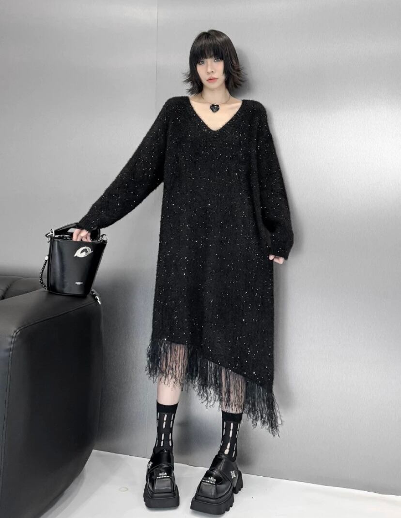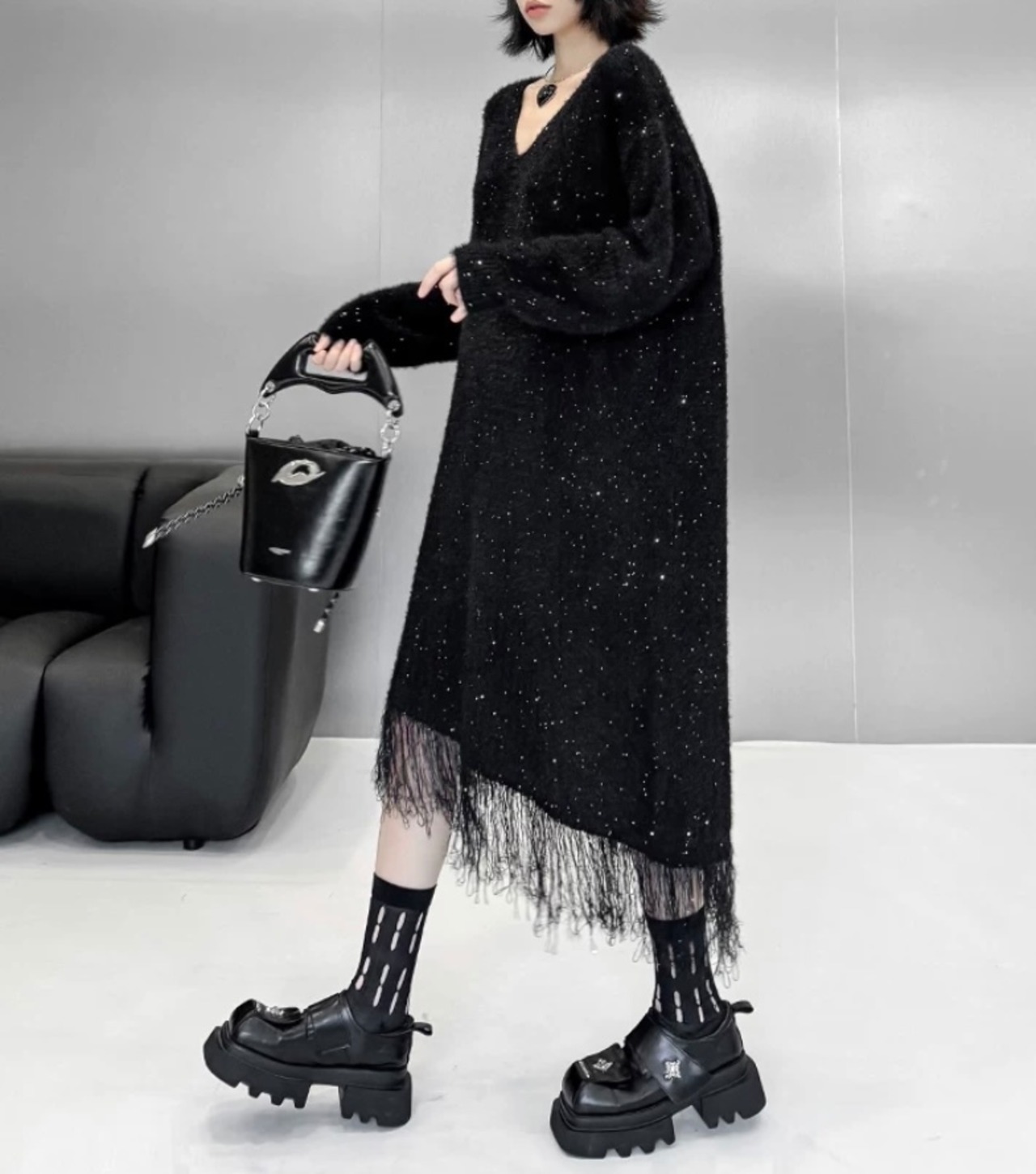 ブイネック きららき ラメ 黒 フリンジ セーター カーディガン トップス ワンピース ブラック シンプル モード