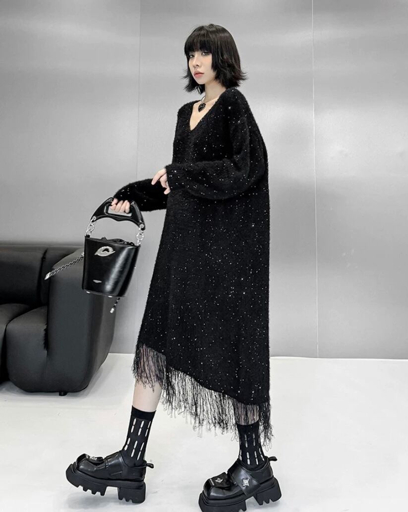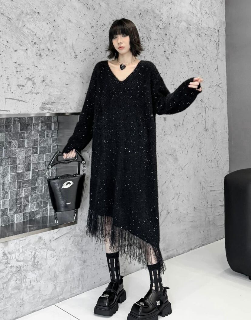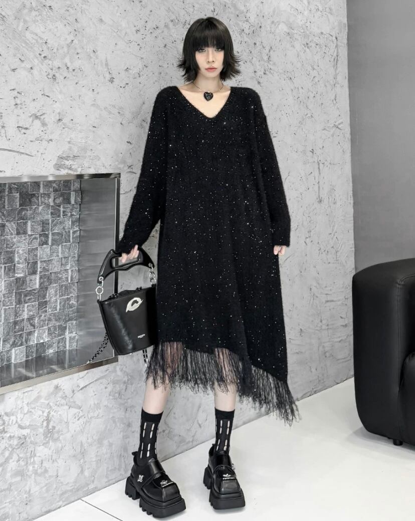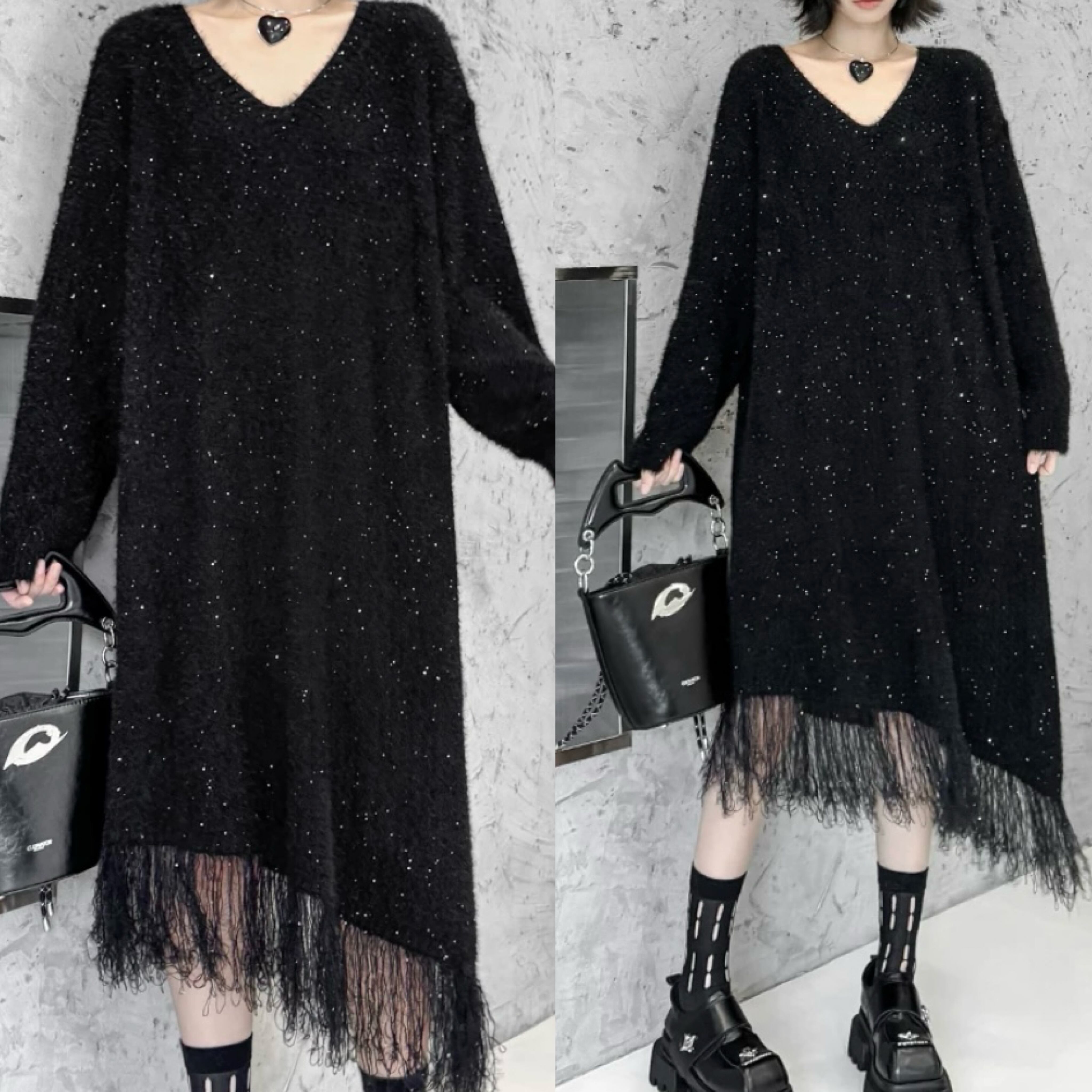 ブイネック きららき ラメ 黒 フリンジ セーター カーディガン トップス ワンピース ブラック シンプル モード
