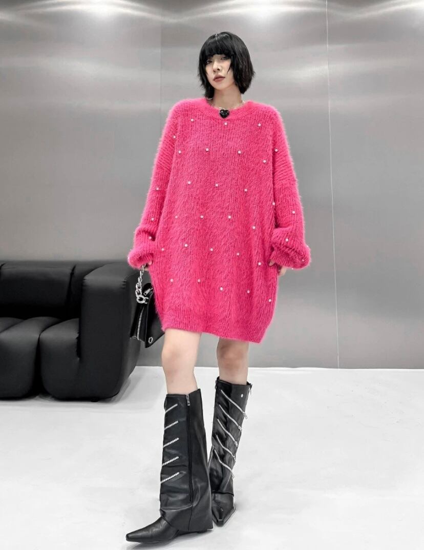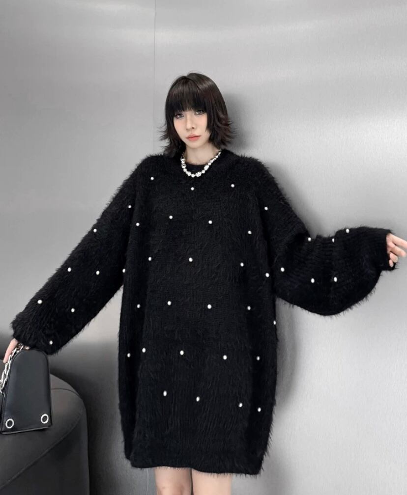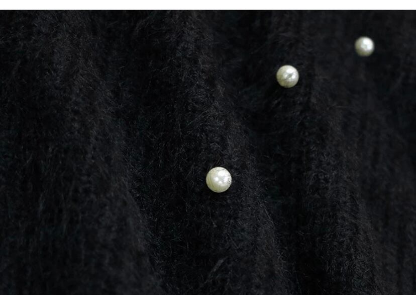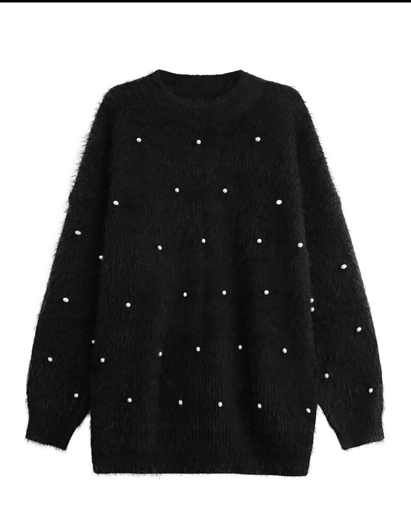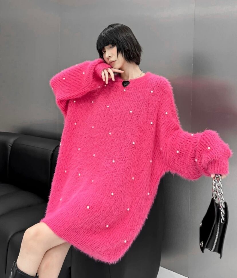 ピンク 黒 パール デコレーション オーバーサイズ ニット セーター カーディガン シンプル トップス カーディガン XL チュニック カジュアル