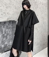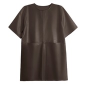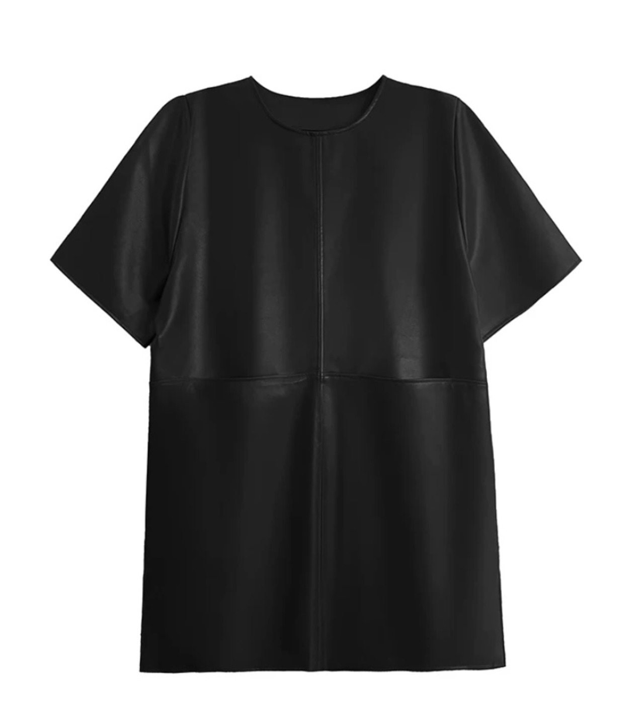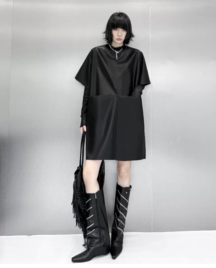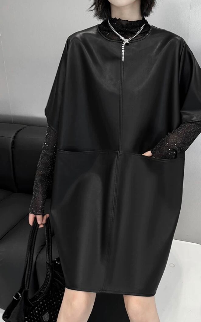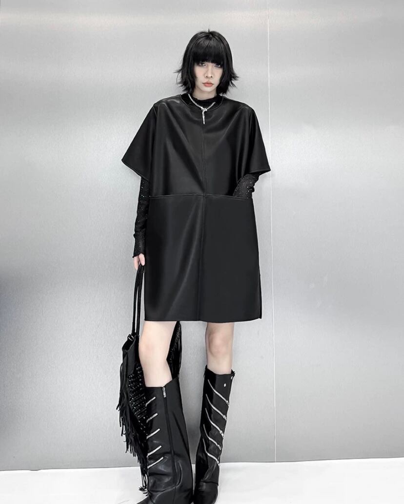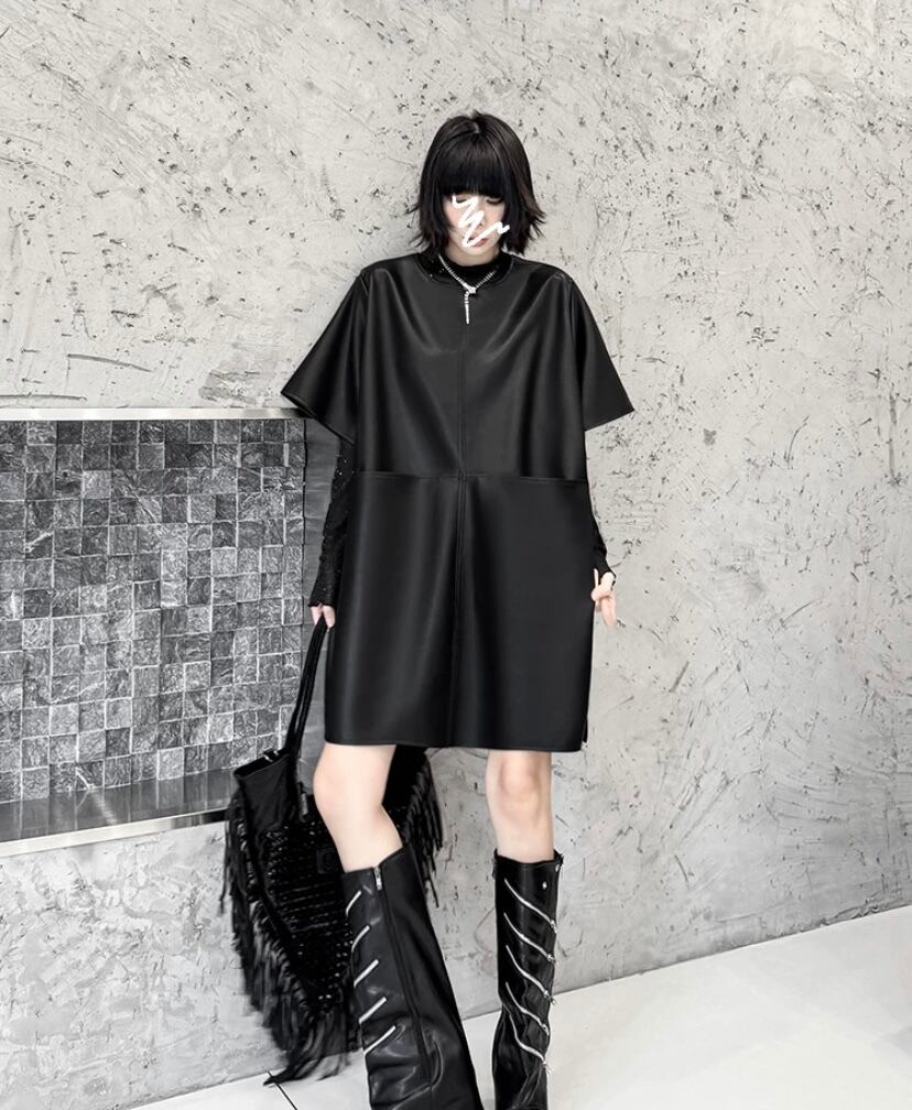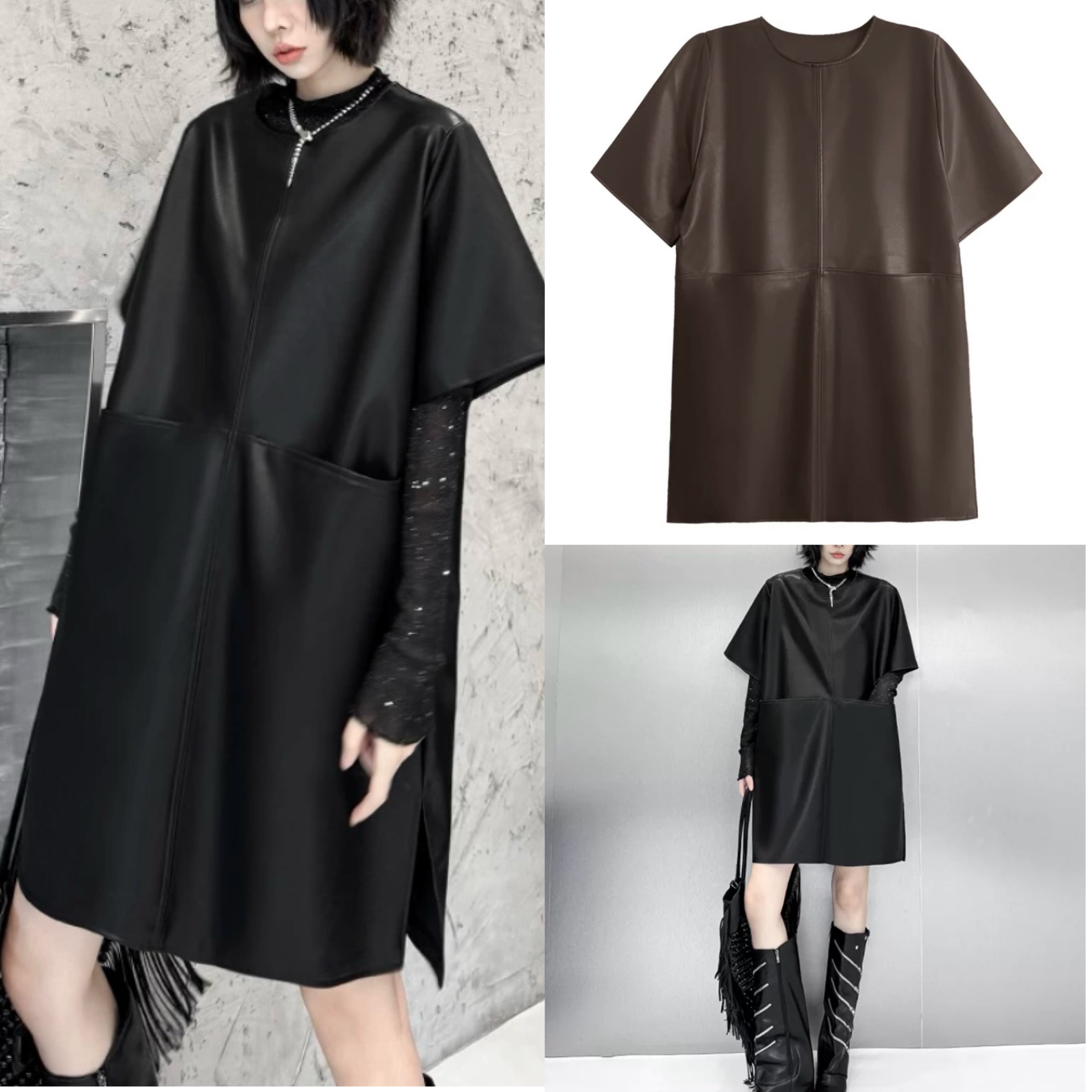 オーバーサイズ 半袖 黒 ブラック 茶色 ワンピース トップス カジュアル ミニスカート 革ジャン レザー チュニック ブラウス