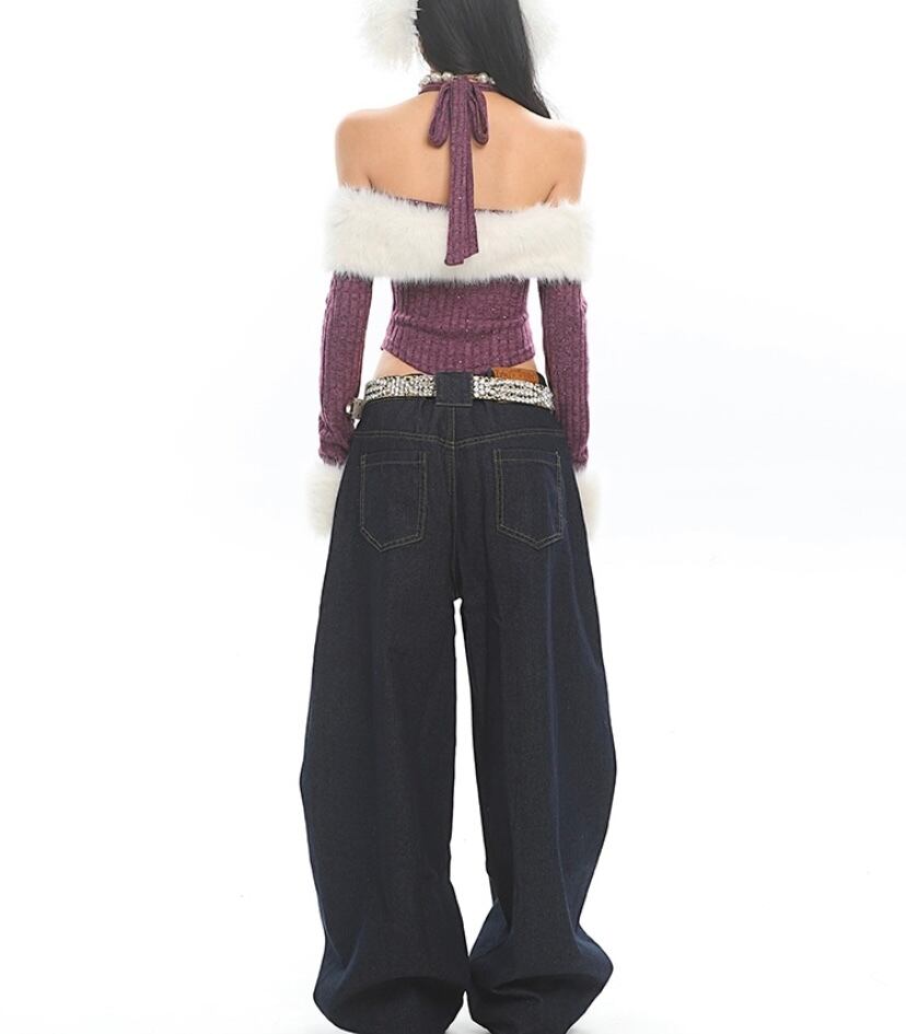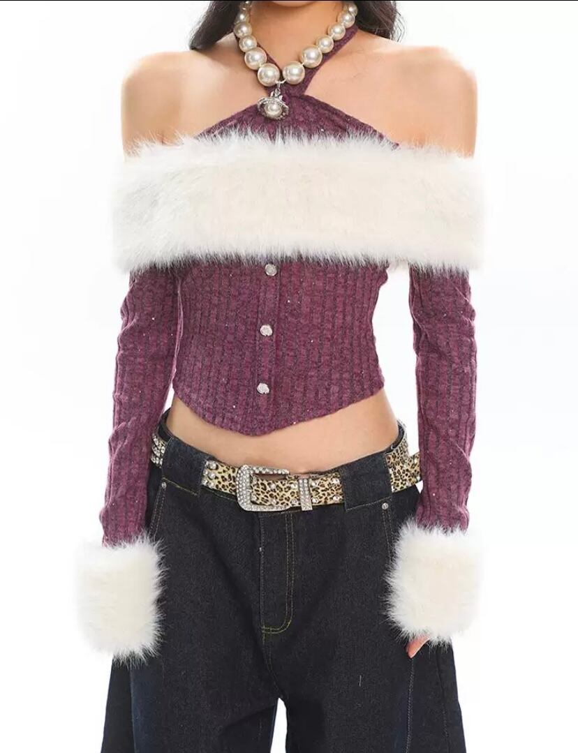 紫 パープル 白 ニット カーディガン セーター オフショルダー Y2K ギャル スウェット ヒップホップ 原宿 クラブ 夜遊び ダンス トレーナー ファー カジュアル ストリート セクシー トップス トレーナー パーカー ブラス