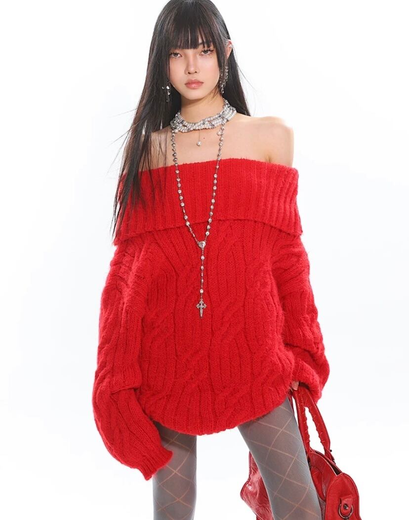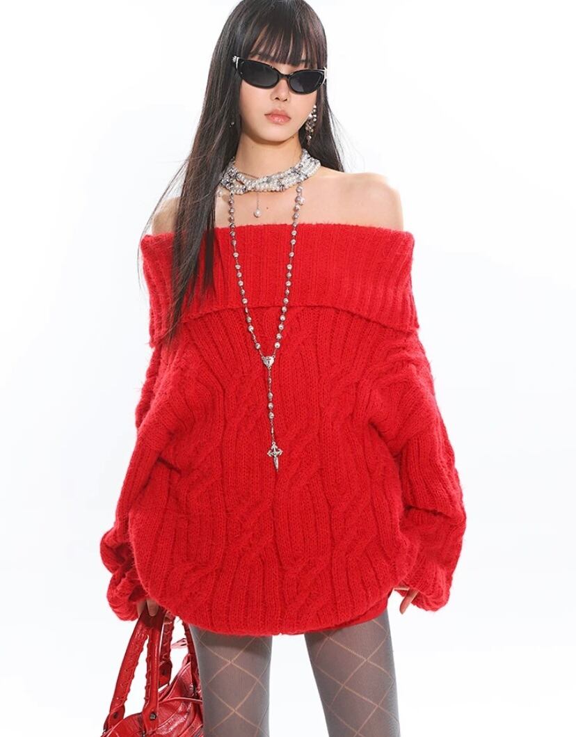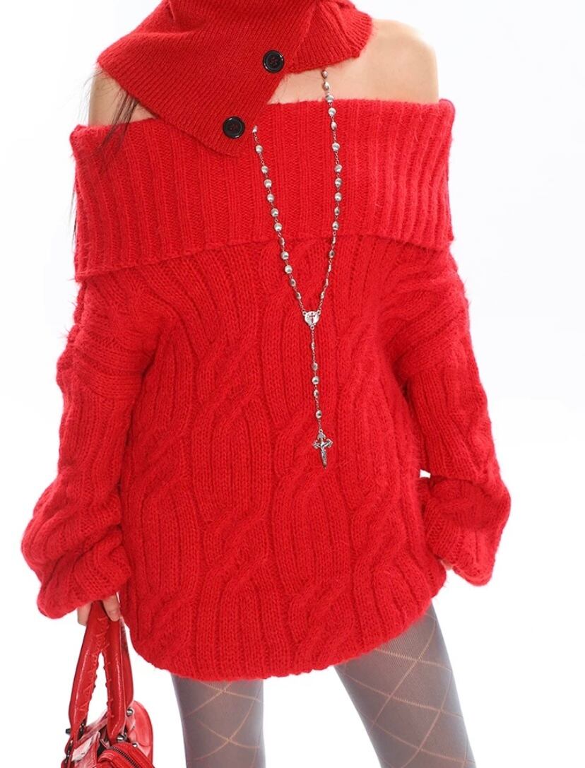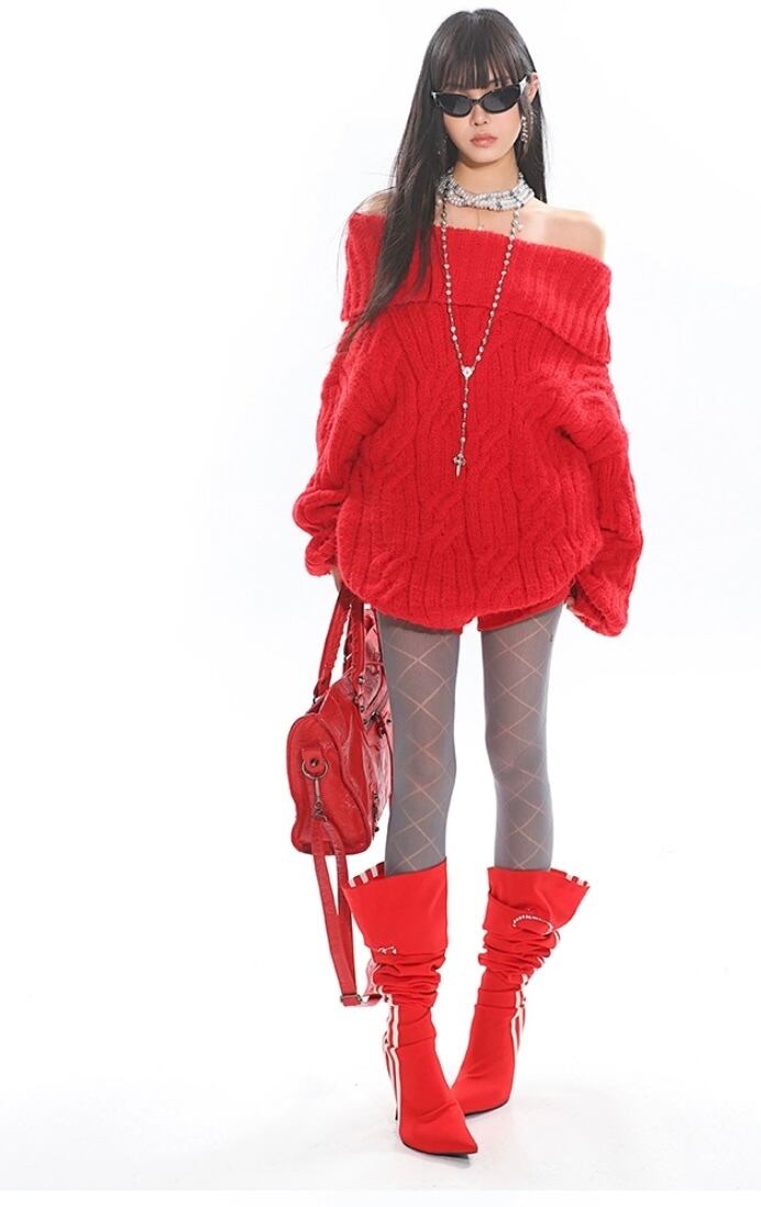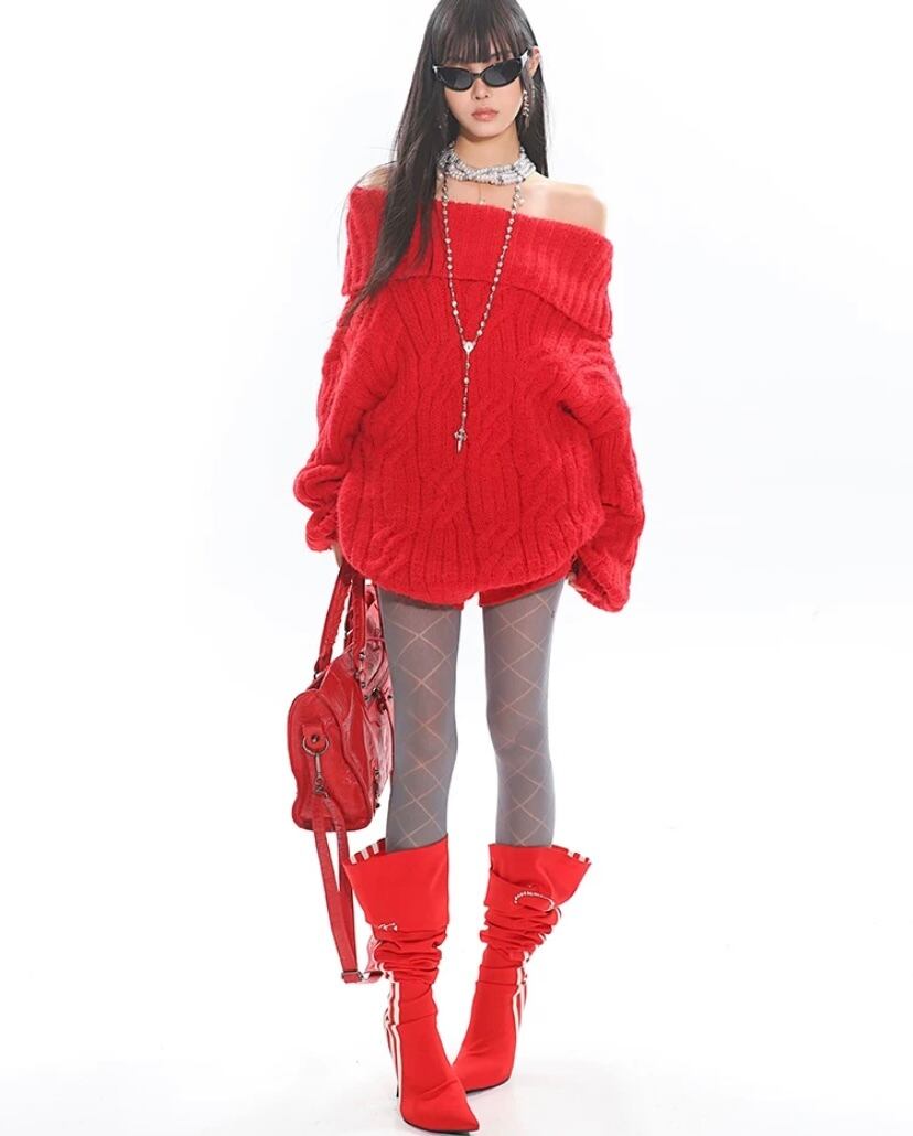 赤 ニット セーター ハイネック トップス オフショルダー Y2K ギャル スウェット ヒップホップ 原宿 クラブ 夜遊び ダンス トレーナー ファー カジュアル ストリート セクシー トップス トレーナー パーカー ブラス ワンピース